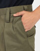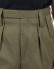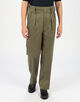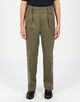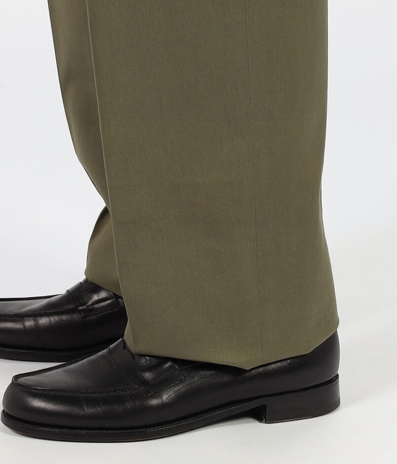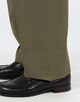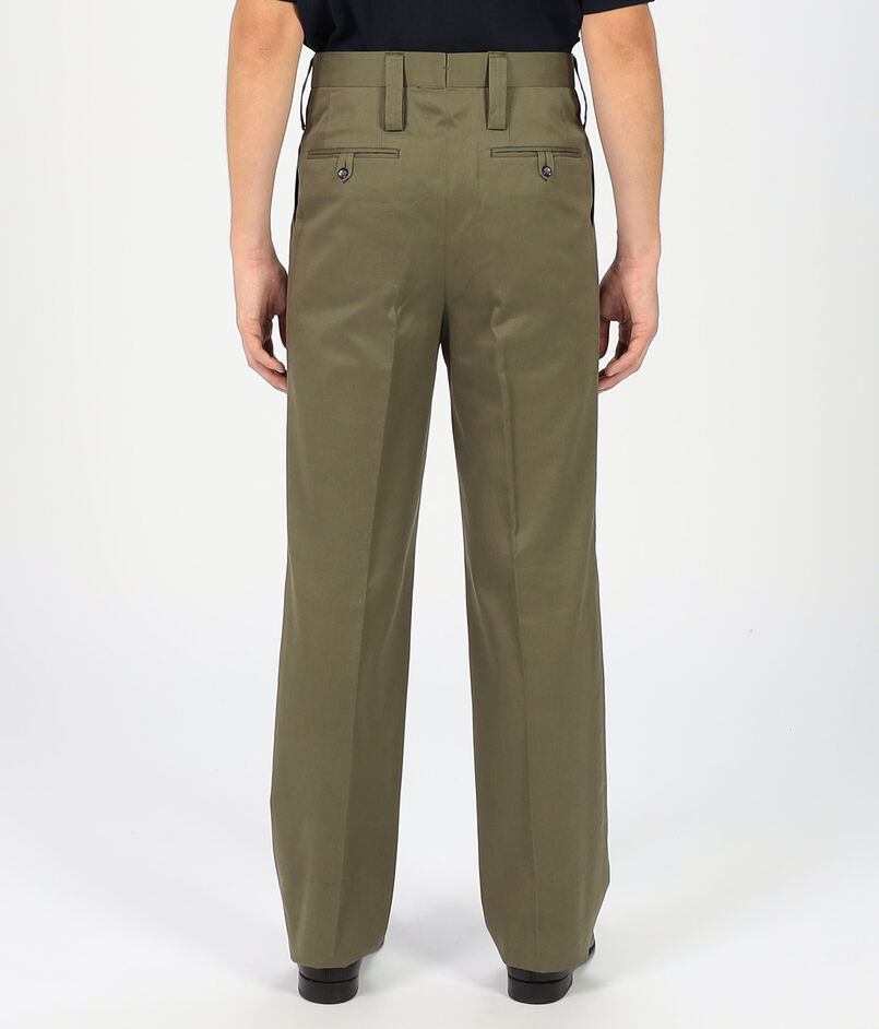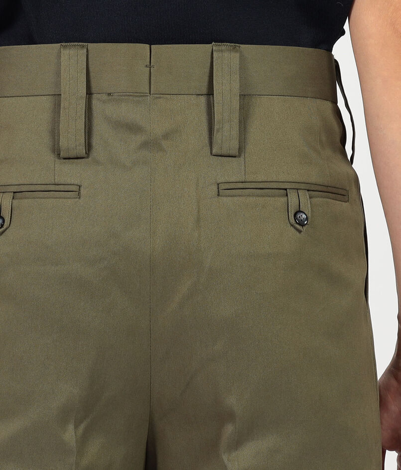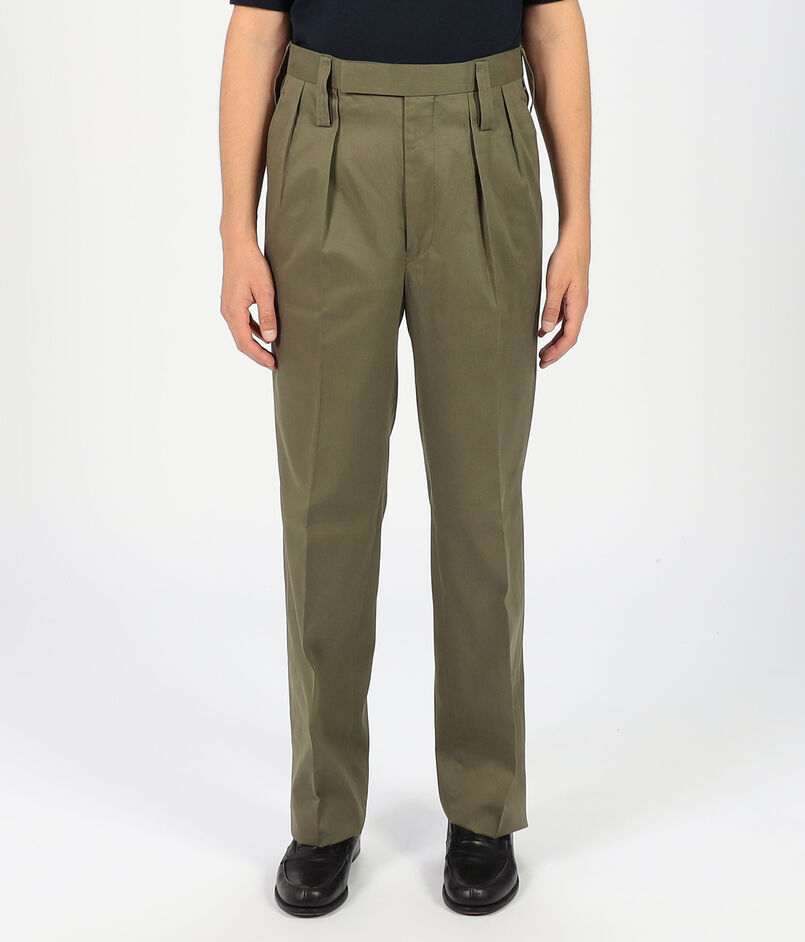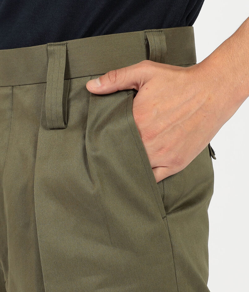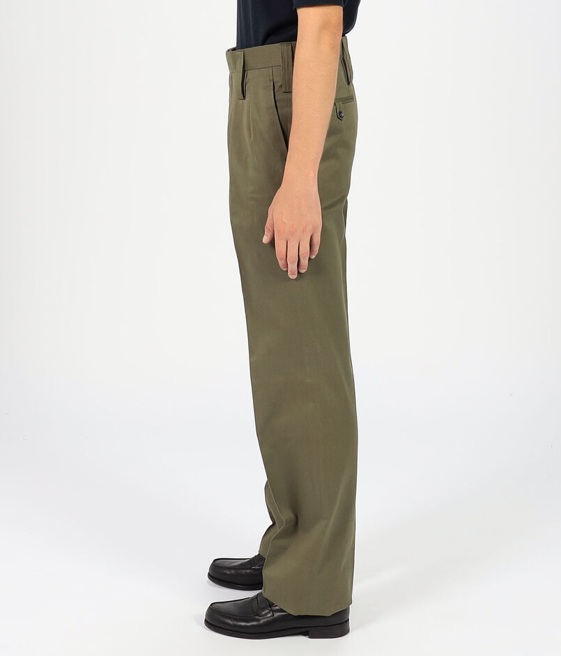 2タックで腰回りにゆとりを持たせつつ、裾に向かって絞りの少ないモダンなワイドストレート。無骨なミリタリーの要素を、洗練された生地使いとパターンで昇華した、カジュアルでありながらエレガンスを感じさせるトラウザーズです。
