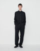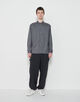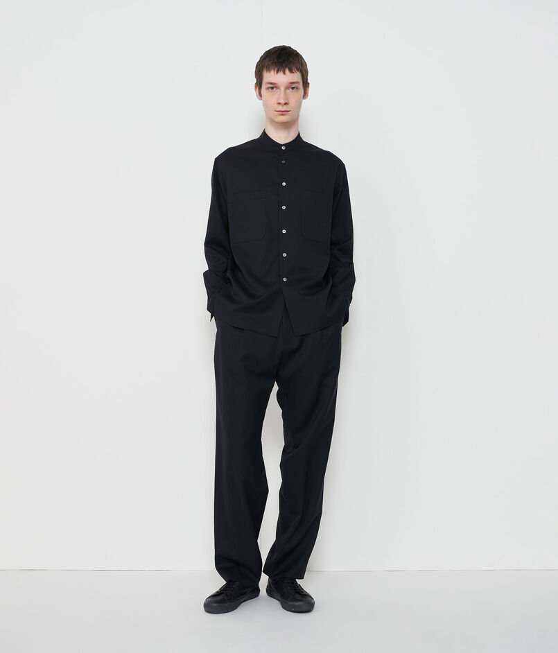 シャツはリラックス感のあるシルエットながらも、スタンドカラーデザインですっきりとした雰囲気に仕上げた一枚。