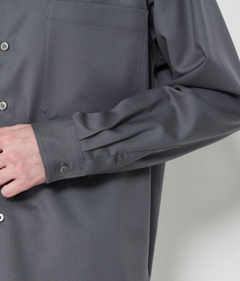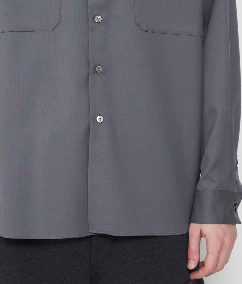 紡績の段階でウォッシャブル加工を施したオーセンティックな梳毛のギャバジン素材を使用したオープンカラーシャツ。