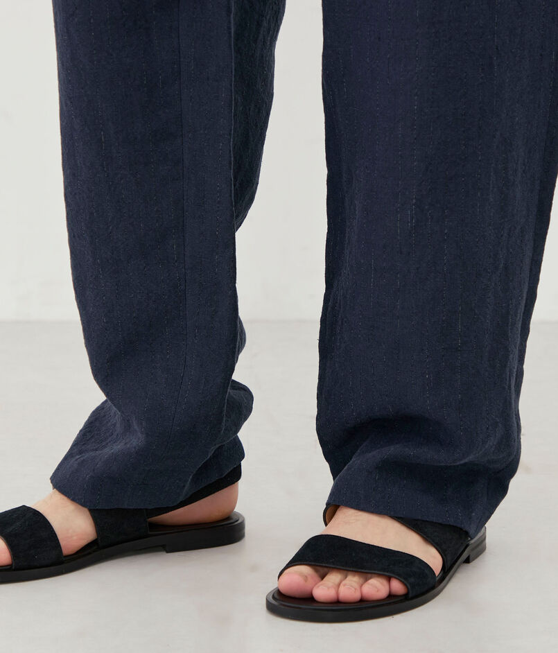麻素材は独特の光沢とシャリ感があり、さわやかな感触がある反面、糸ムラ(ネップ・スラブ)があることや、微妙な色ムラが出やすいという特性があります。