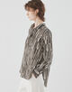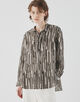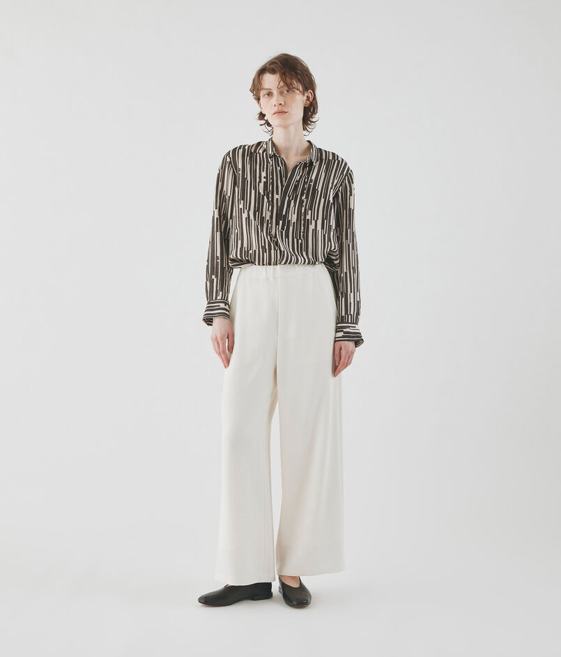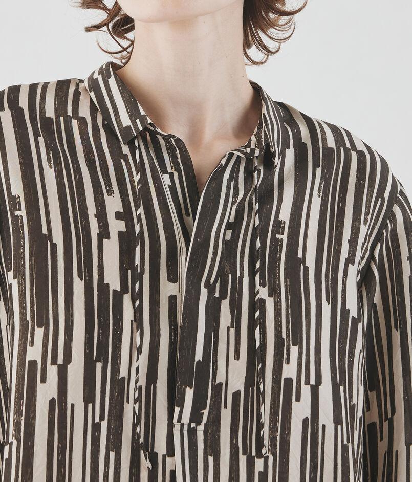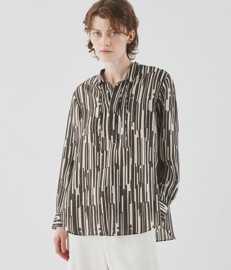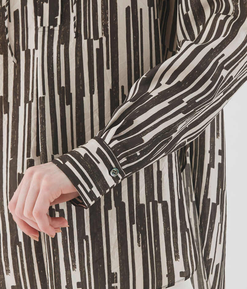 薄手で軽量なシルク羽二重素材にアブストラクトな線で構成された柄をプリントし、生地のコシを柔らかくするタンブラー加工を施したシリーズ。