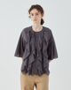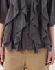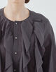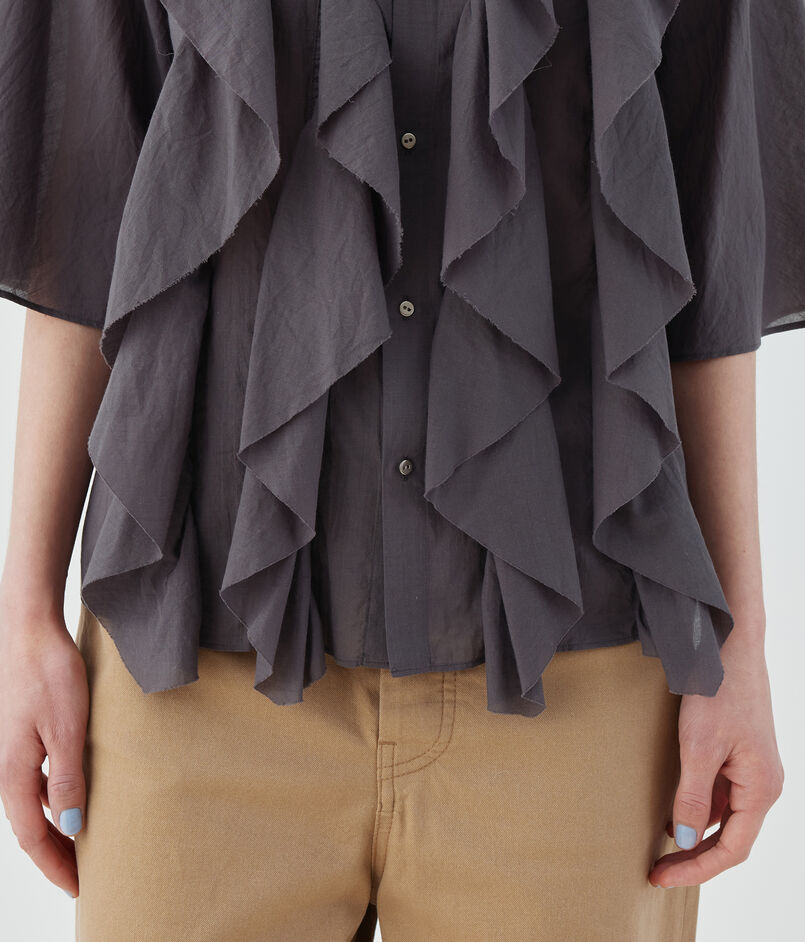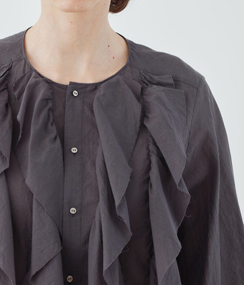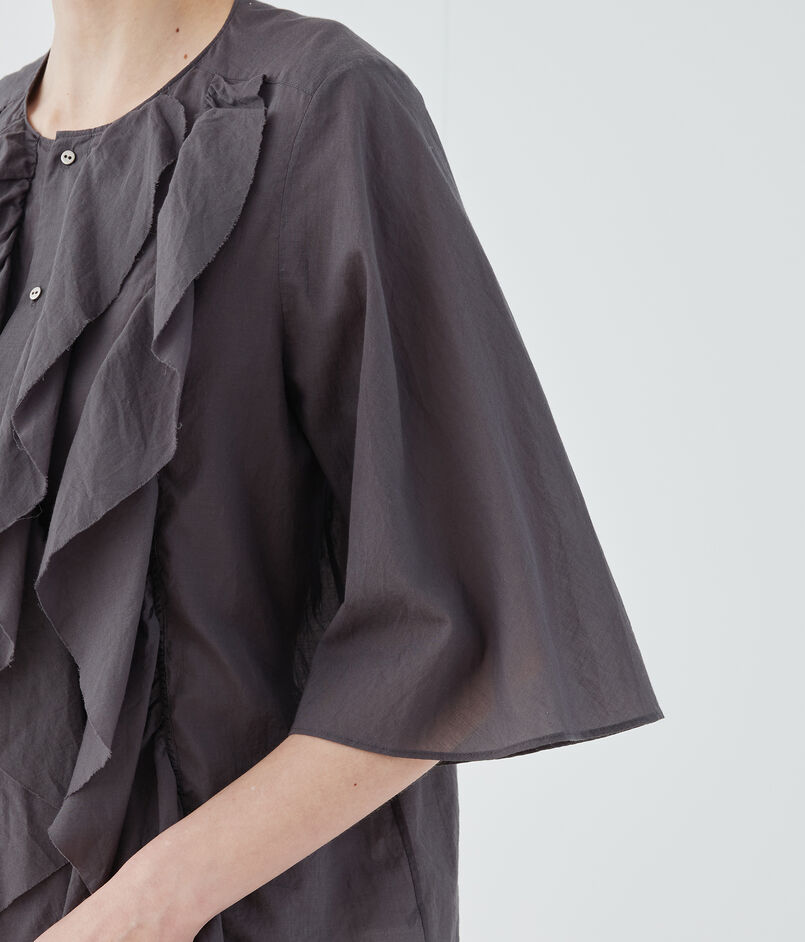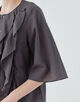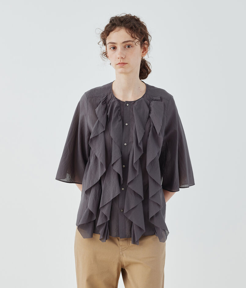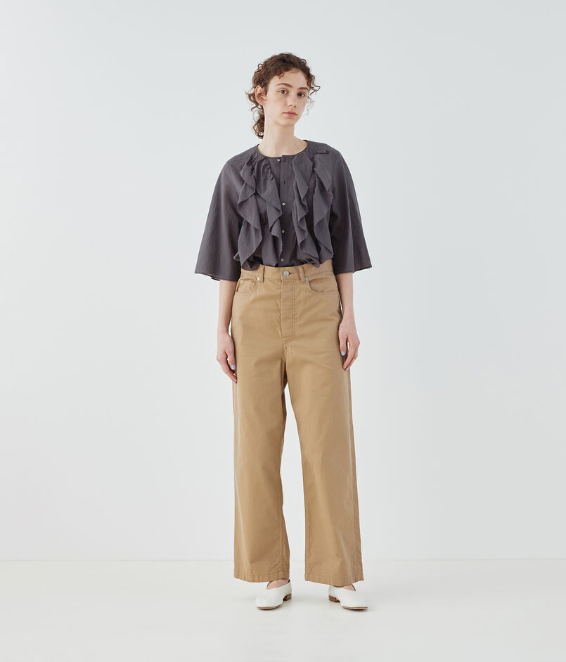 ブラウスはカットオフをした太いテープをフロントに大胆にあしらった一着。