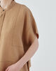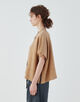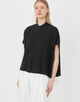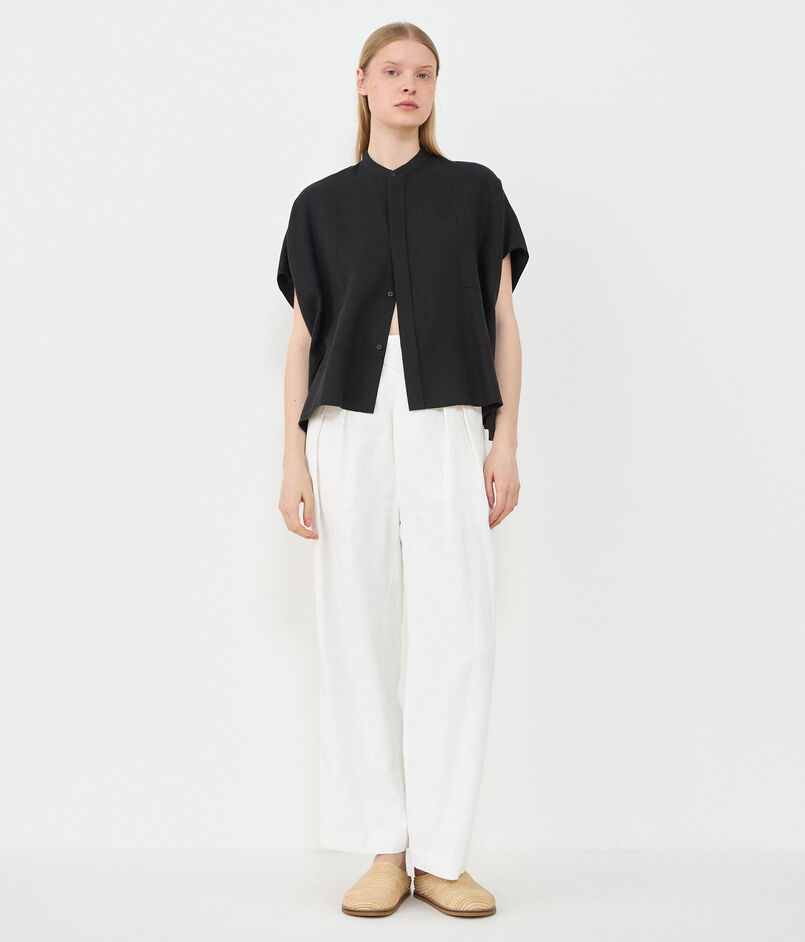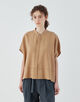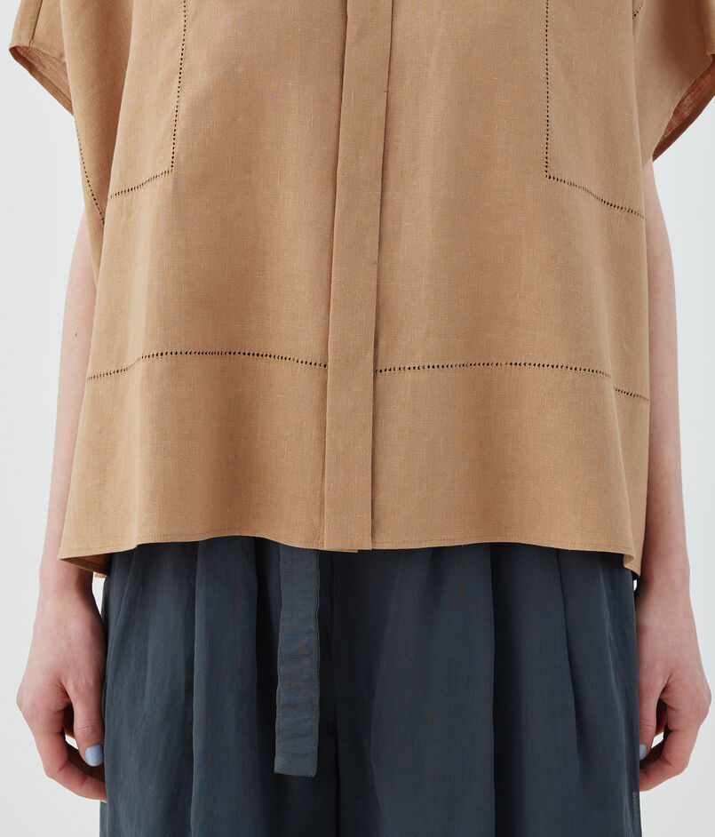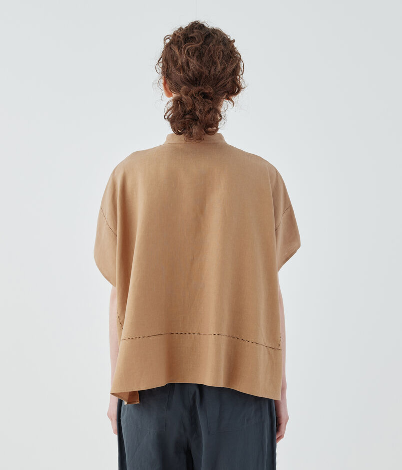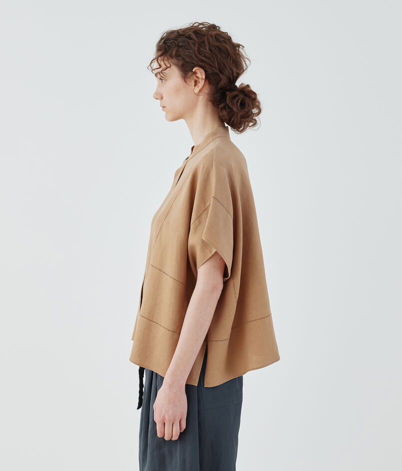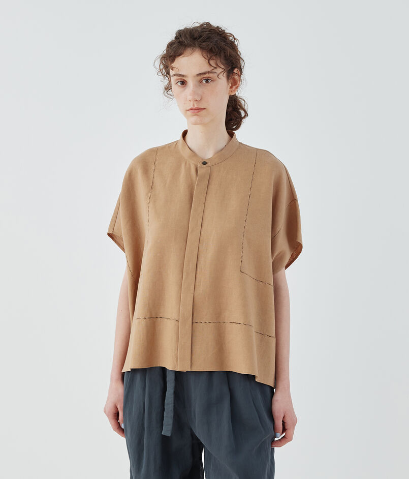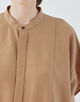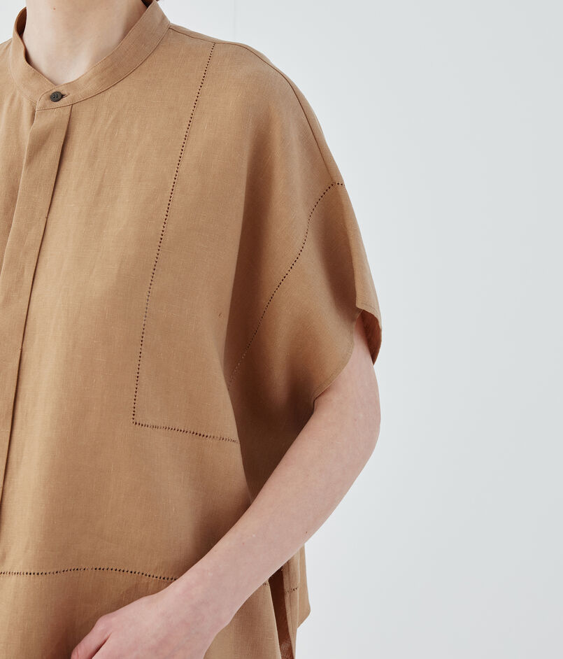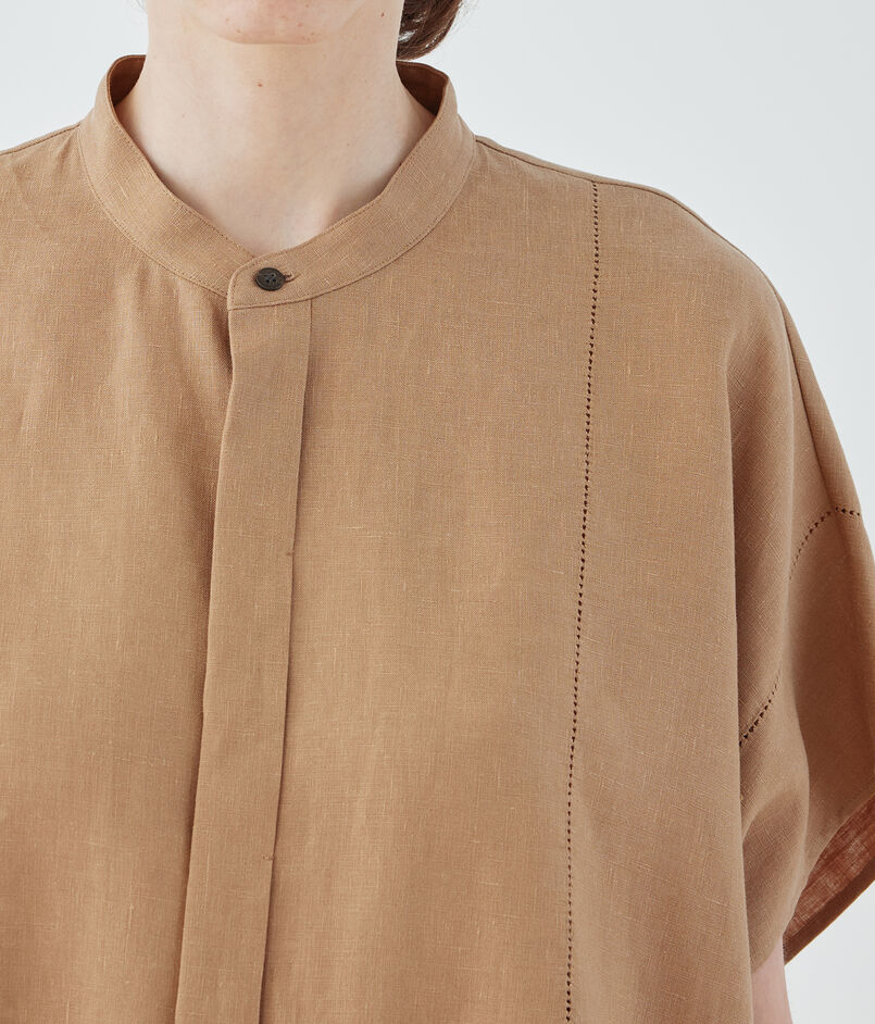 スタンドカラーシャツは平面的な布をまとったようなゆったりとしたシルエットで抜け感たっぷりバランスに仕上げた一着。