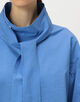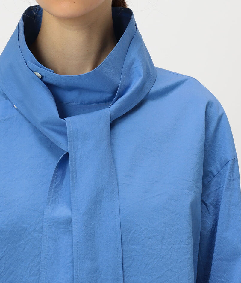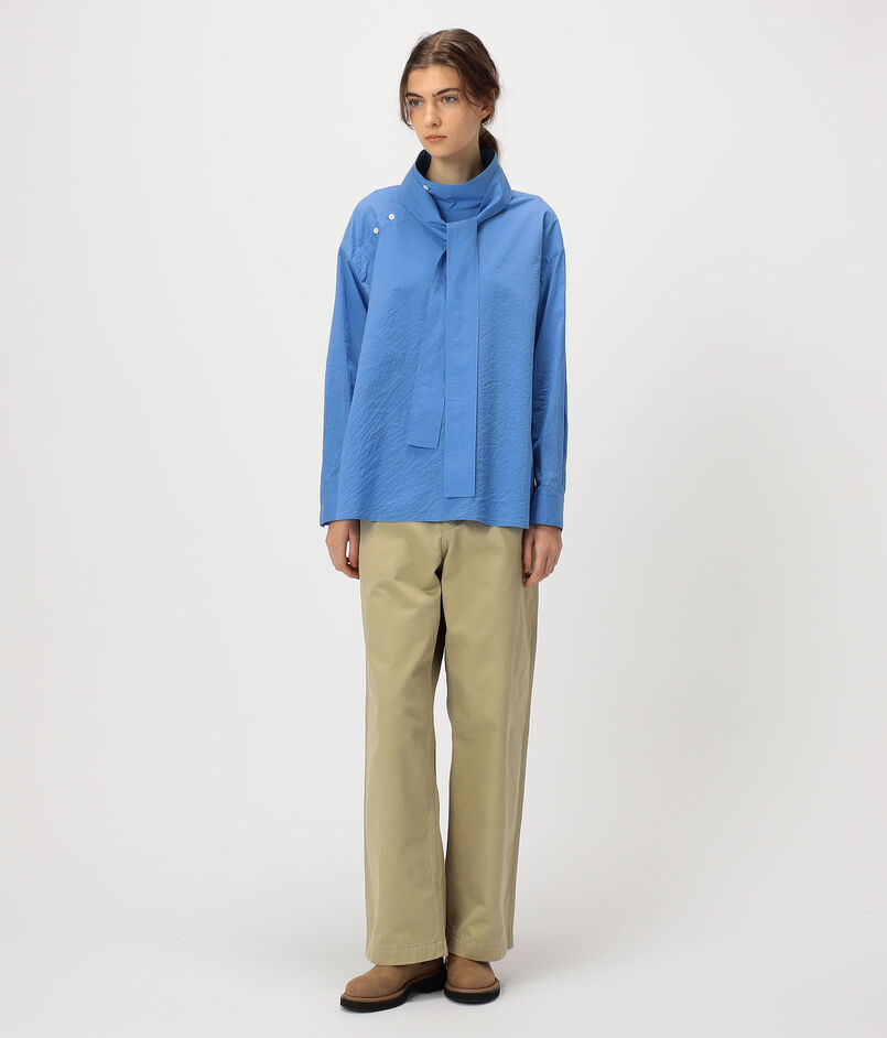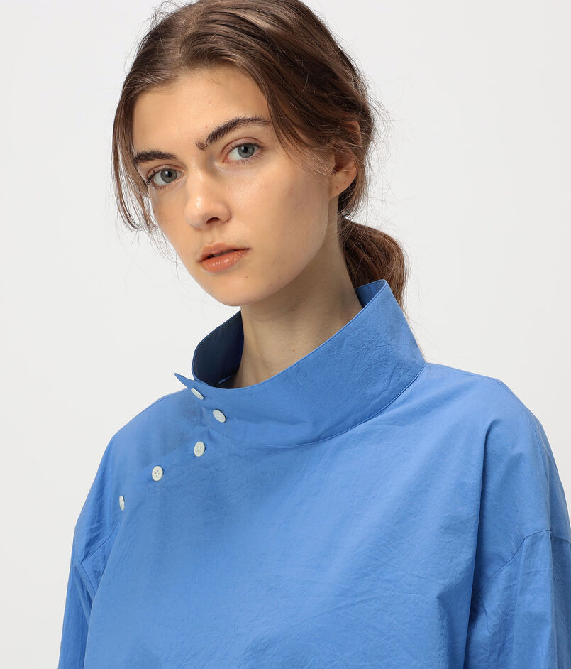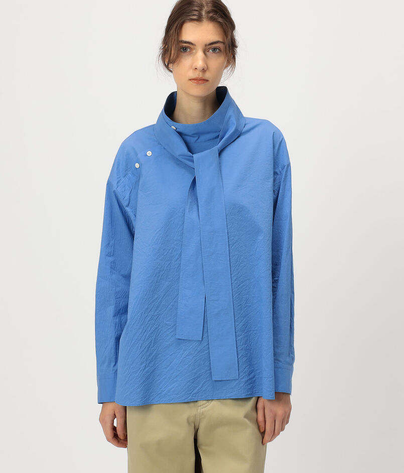 洗練された印象のハイネックシャツにサイドオープンやアシンメトリーな襟のデザインでアレンジをプラスした一着。