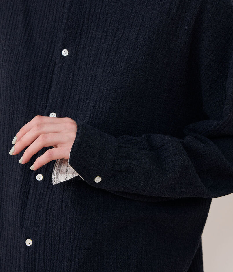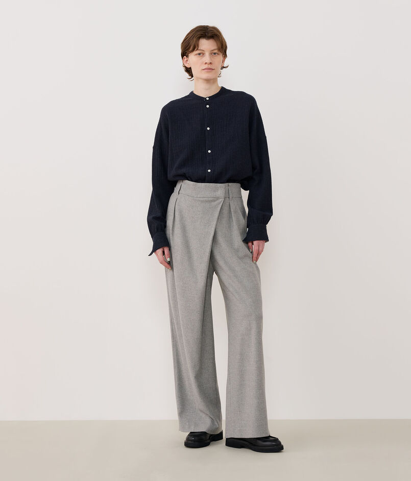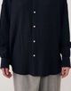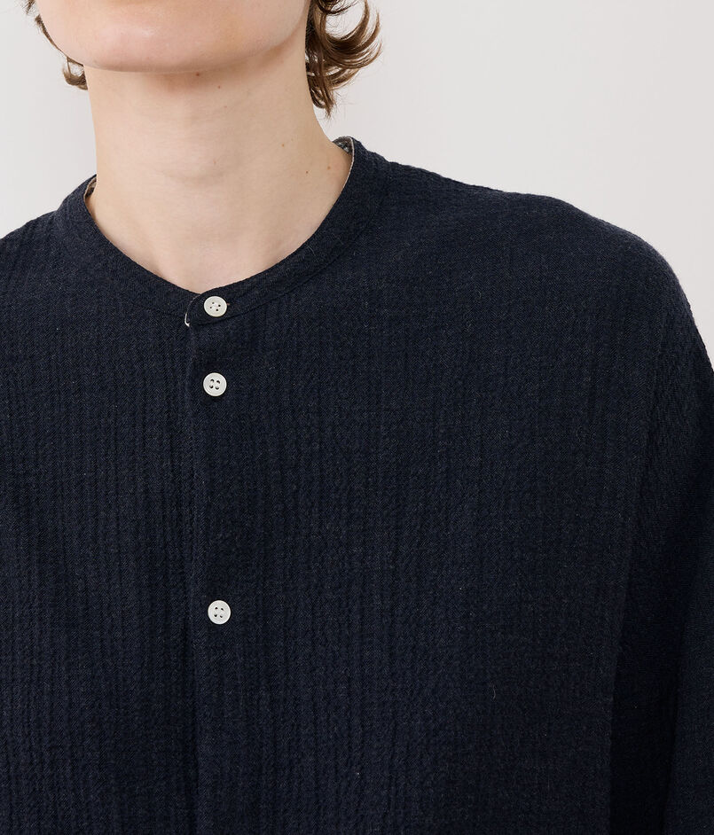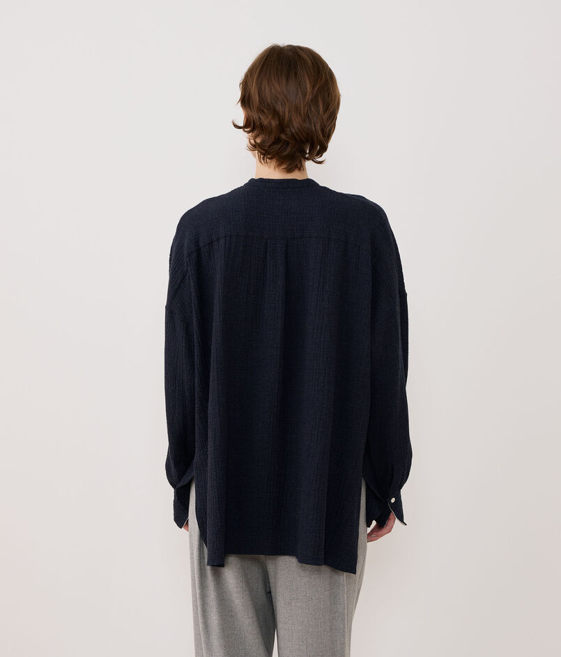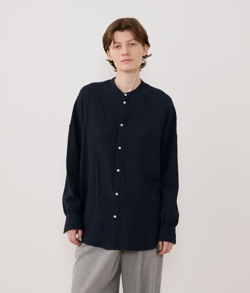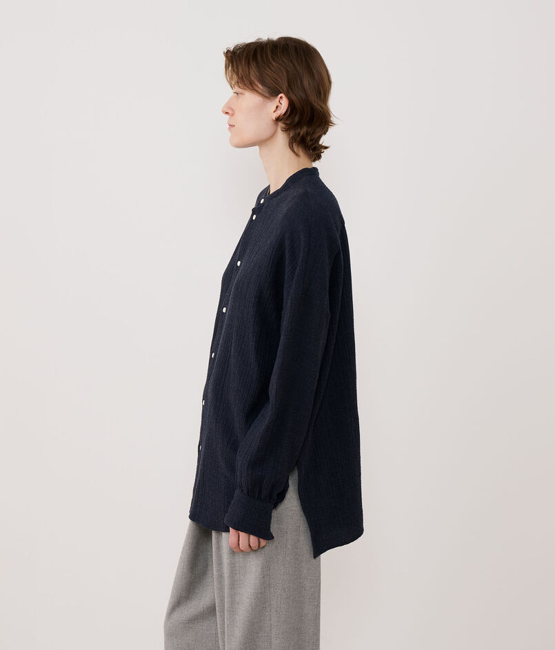 風をはらむように揺れるフォルムに長めの丈感、スタンドカラーのすっきりとしたラインで大人の余裕を感じさせるロングシャツ。