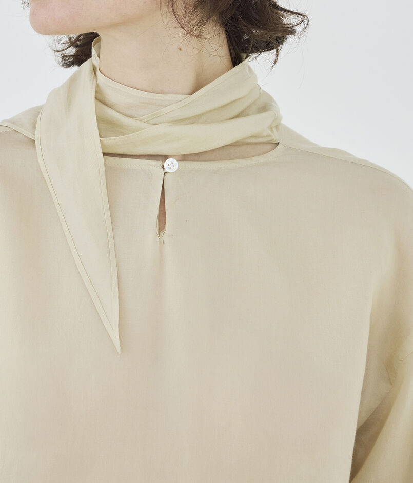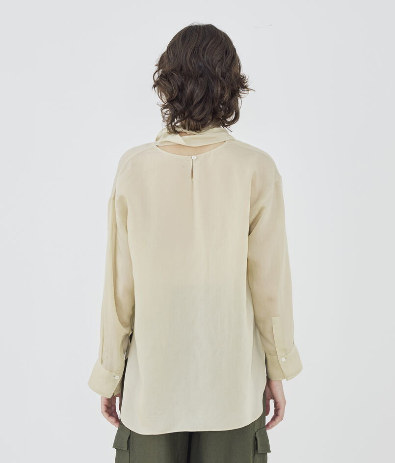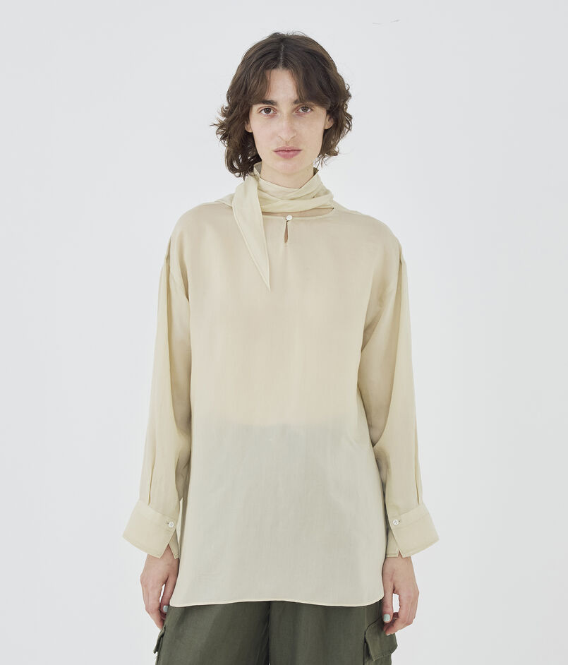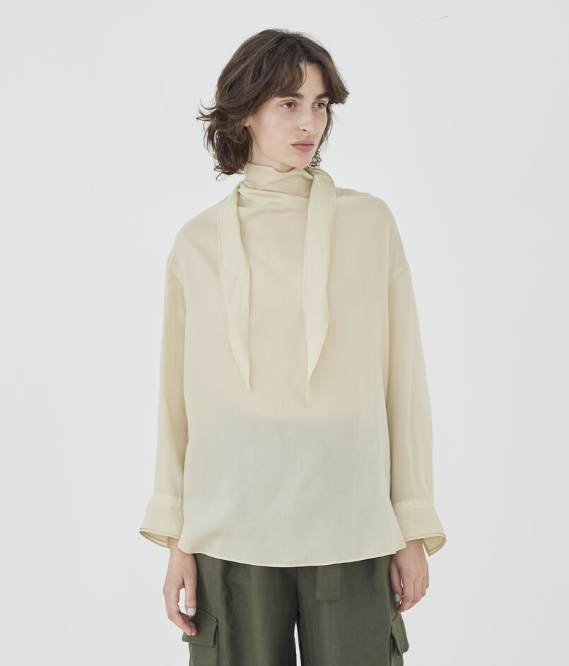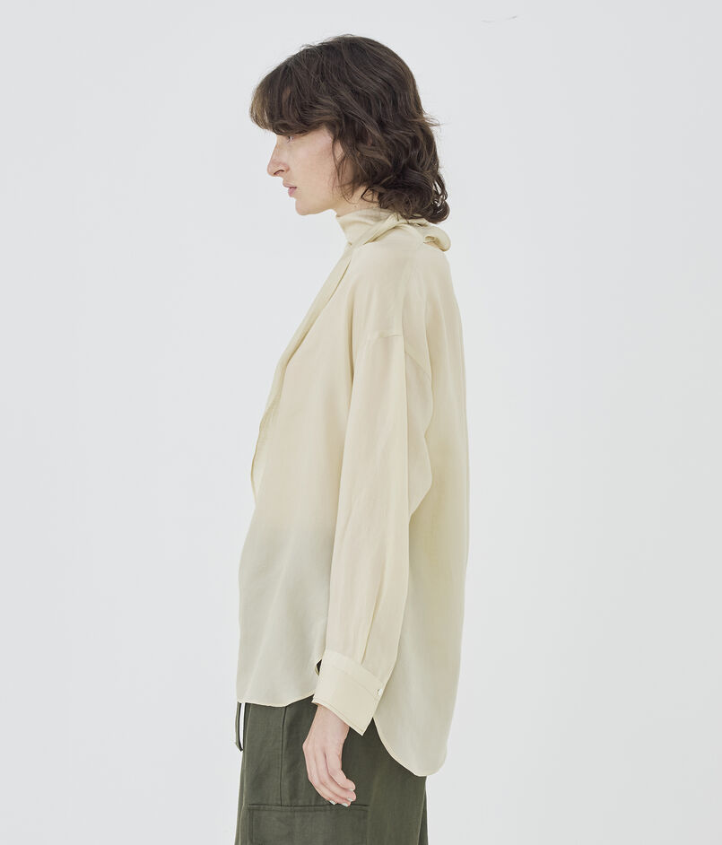 スカーフを纏ったような襟元の自然なドレープが美しいシャツ。