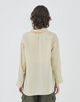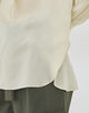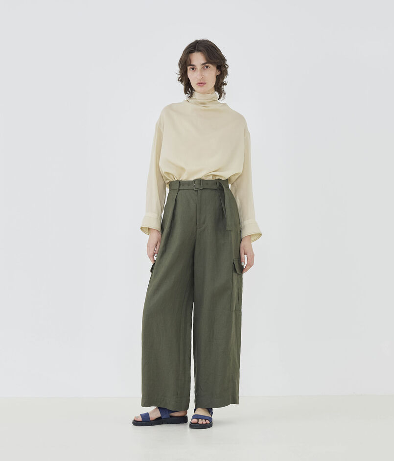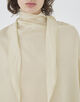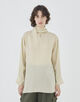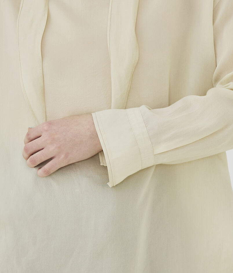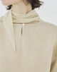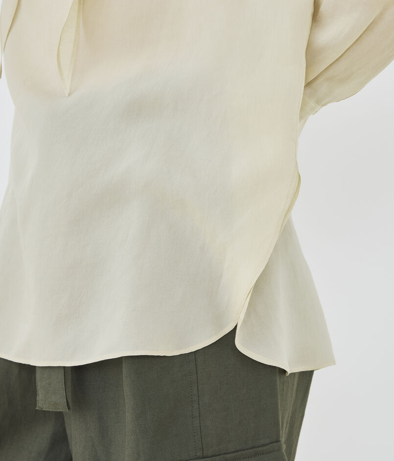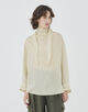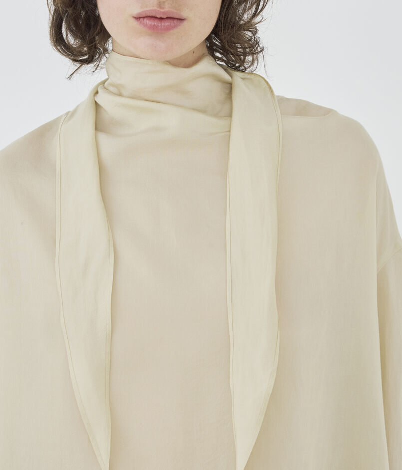 スカーフを纏ったような襟元の自然なドレープが美しいシャツ。
