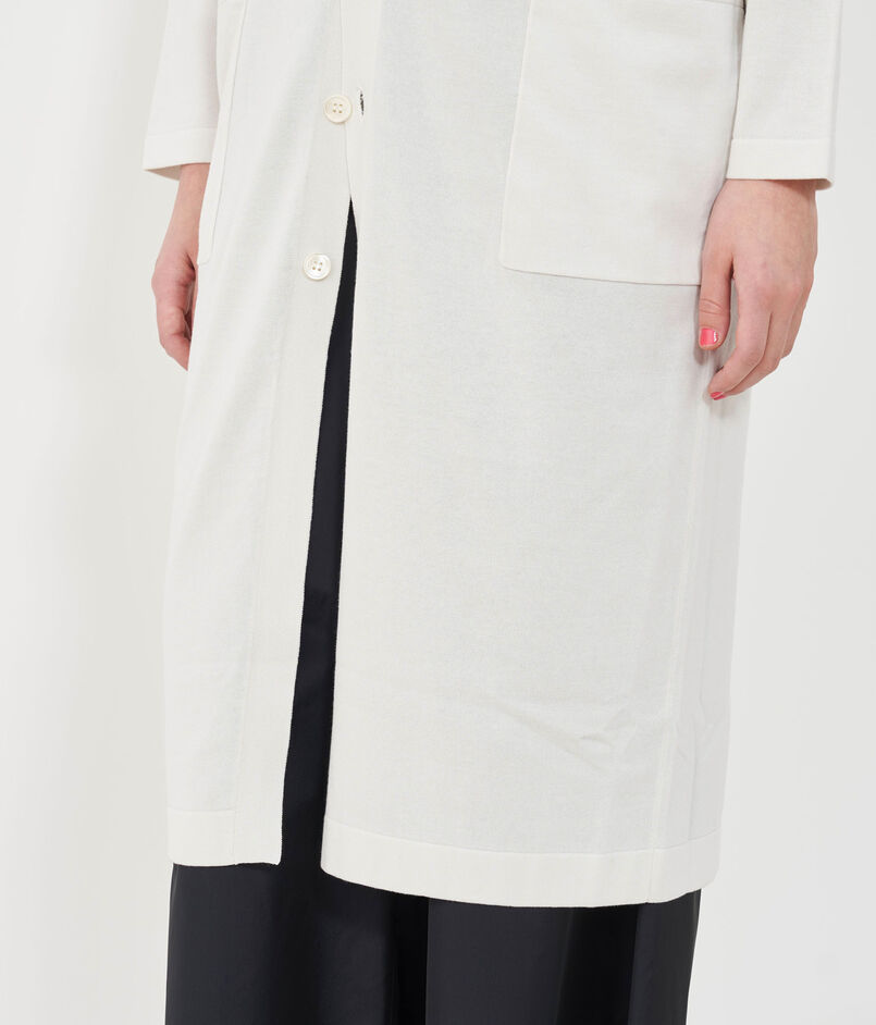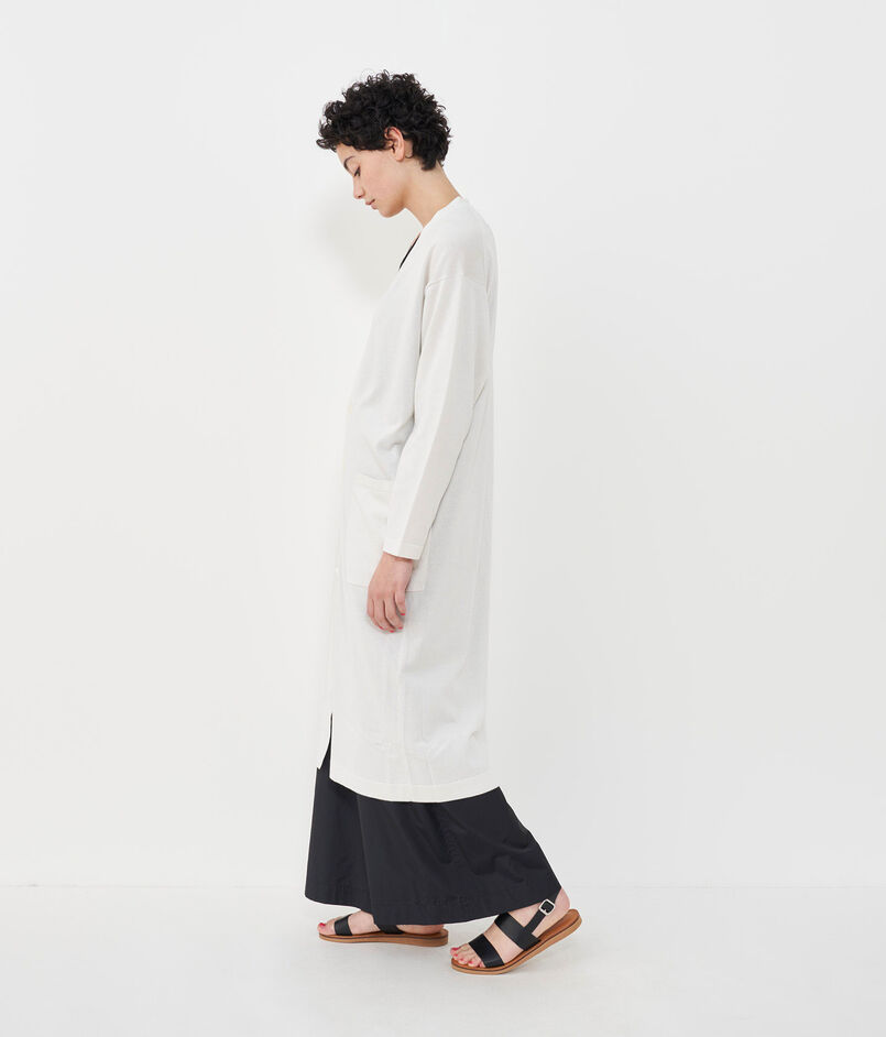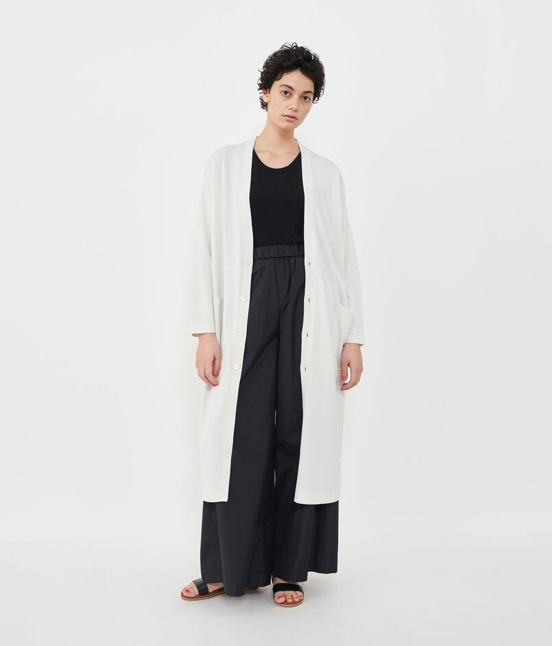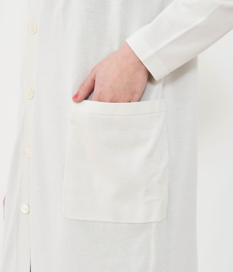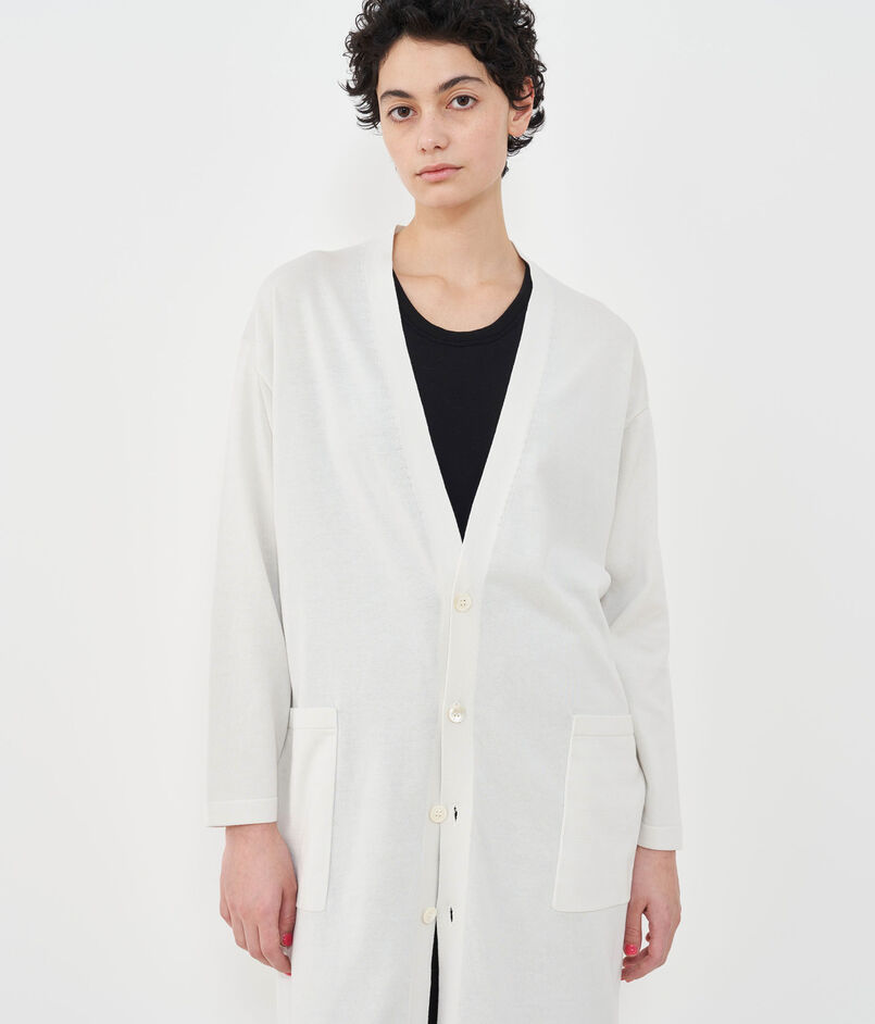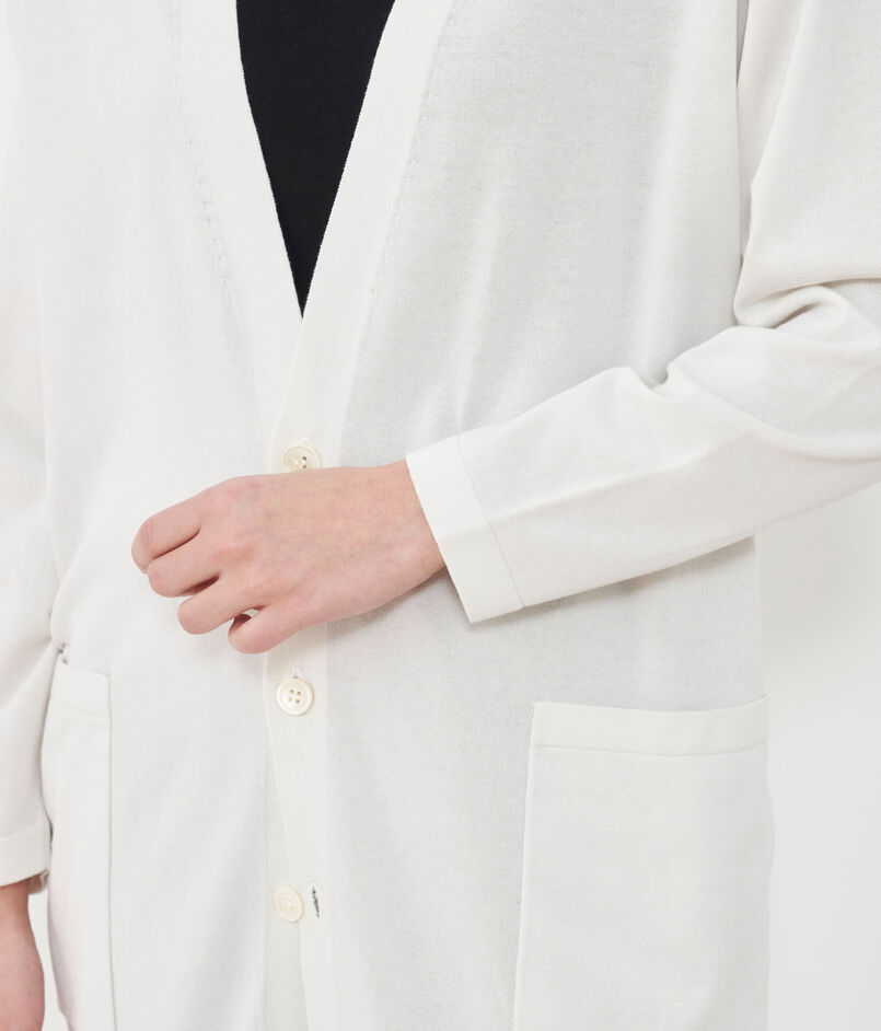 カーディガンはオーバー過ぎないサイズ感でミニマルかつすっきりとした印象の一着。
