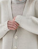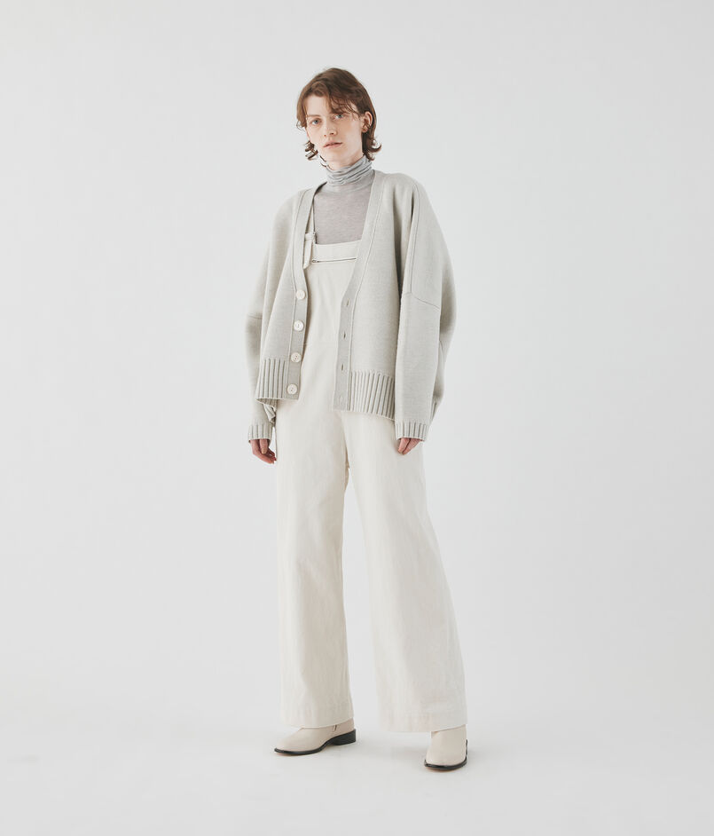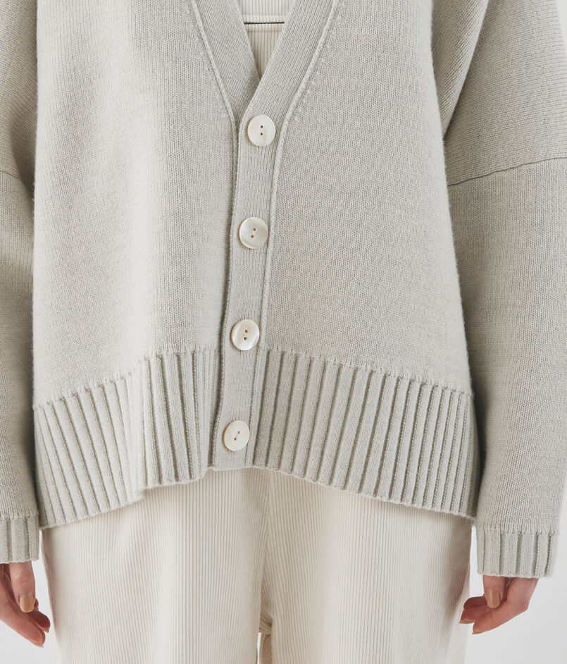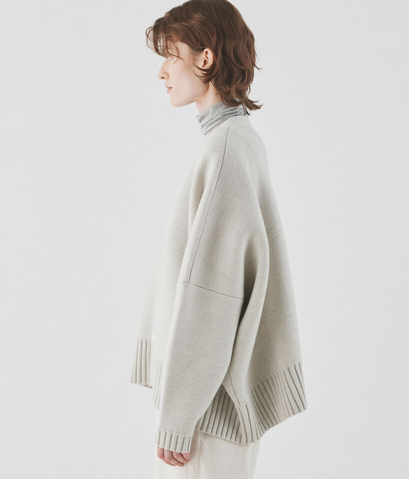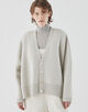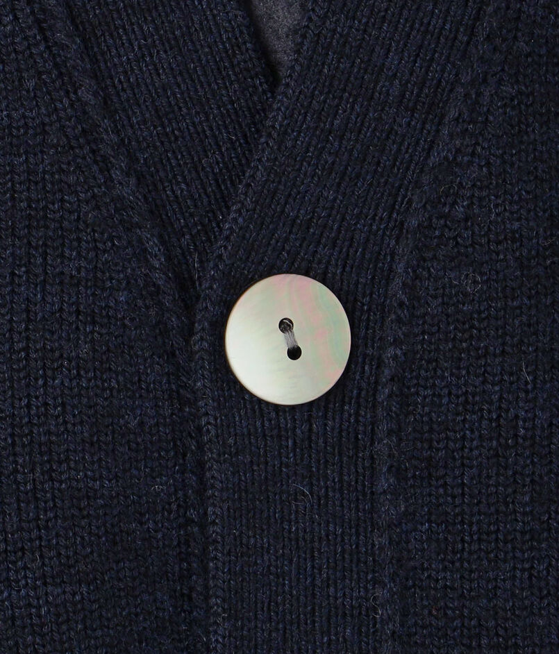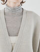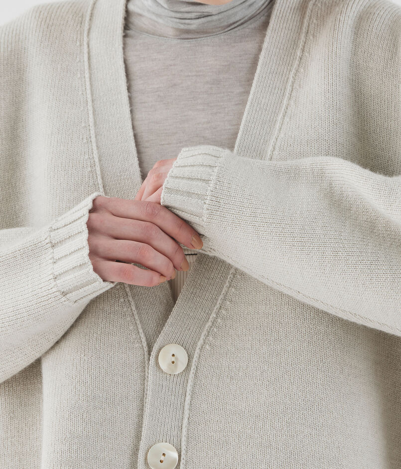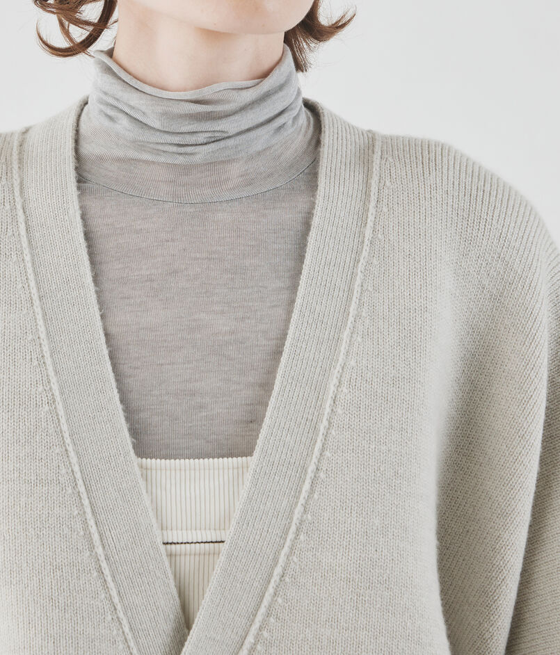 表面は梳毛を、裏面はブラッシングした起毛ウールを使用したダブルフェイス素材のカーディガン。