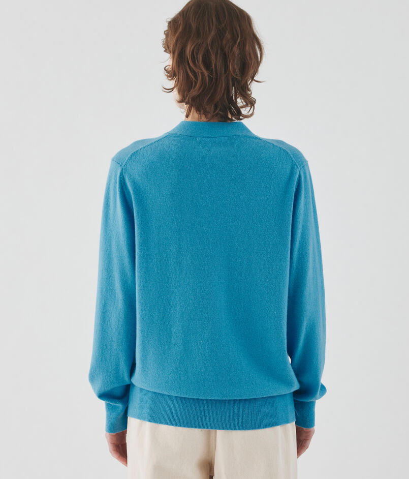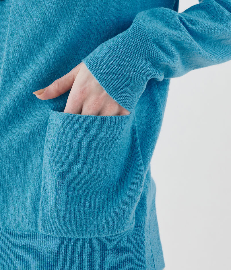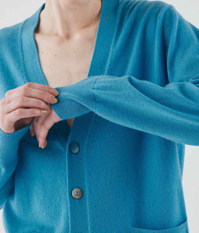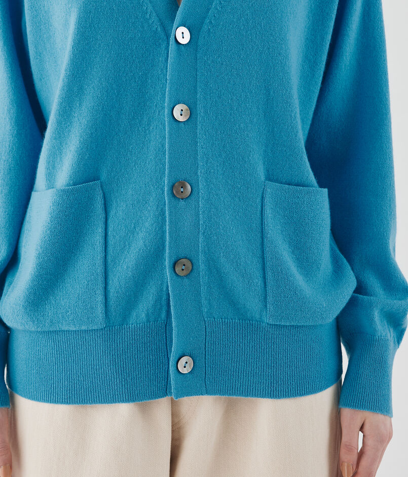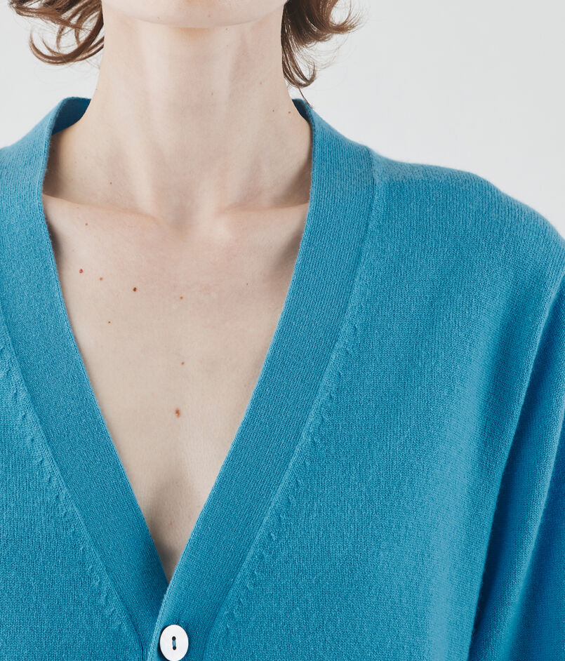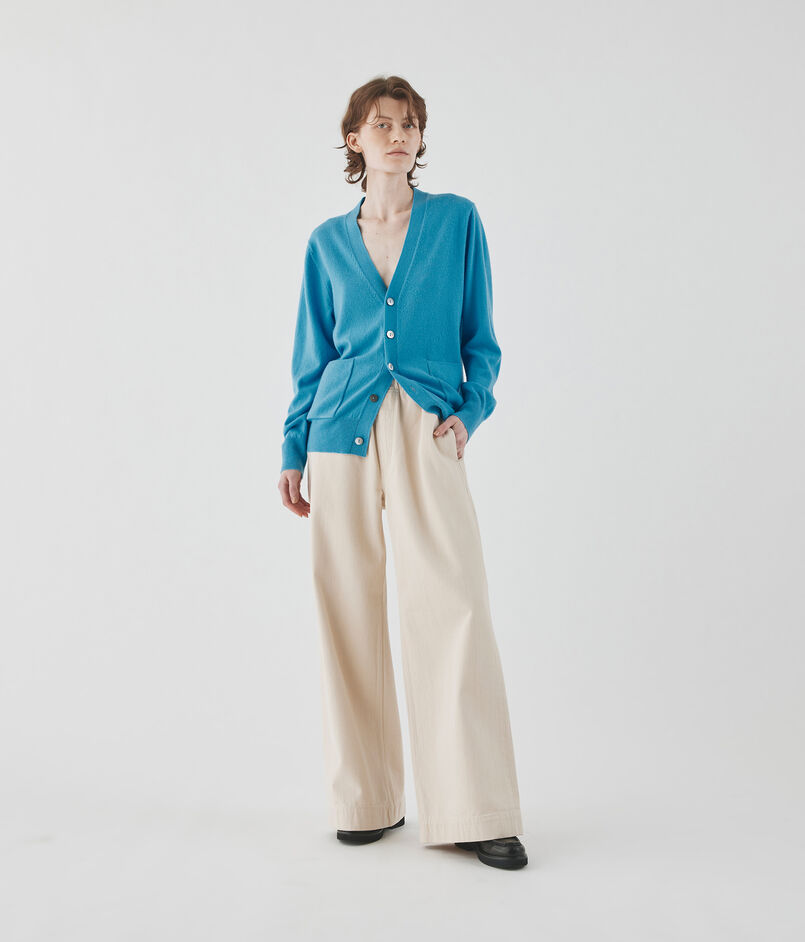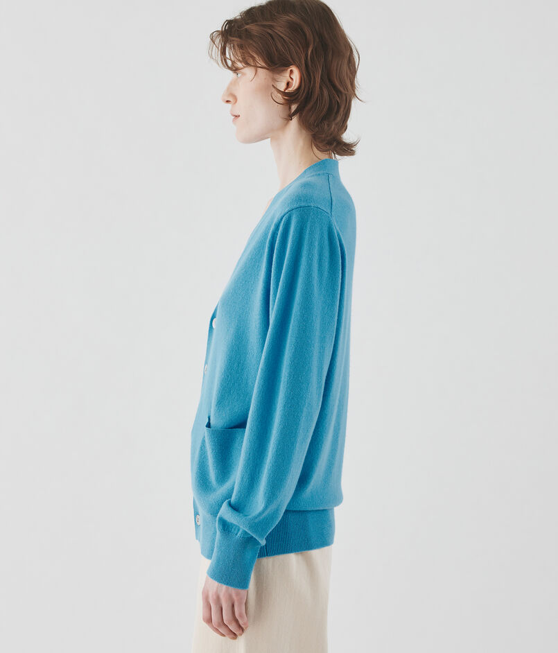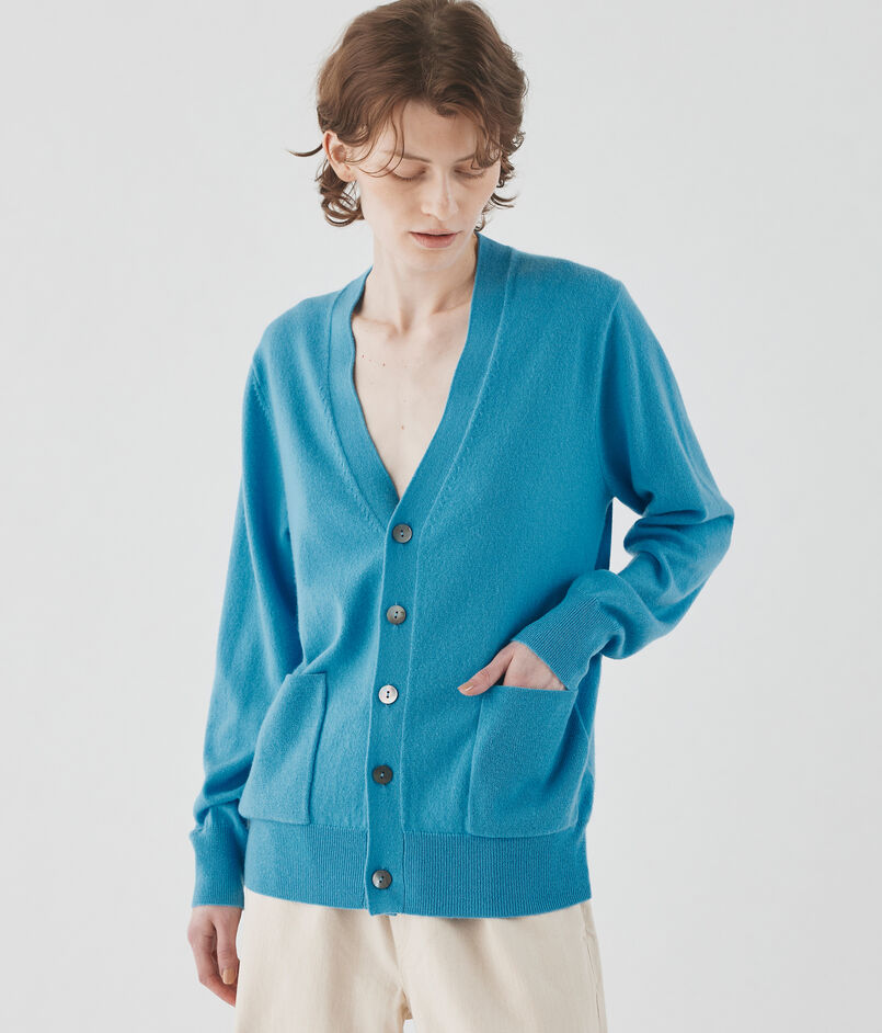 〈GALERIE VIE〉定番の、透明感のある曇りのない鮮やかな色味が魅力的な紡毛カシミヤ糸を使用したカーディガン。