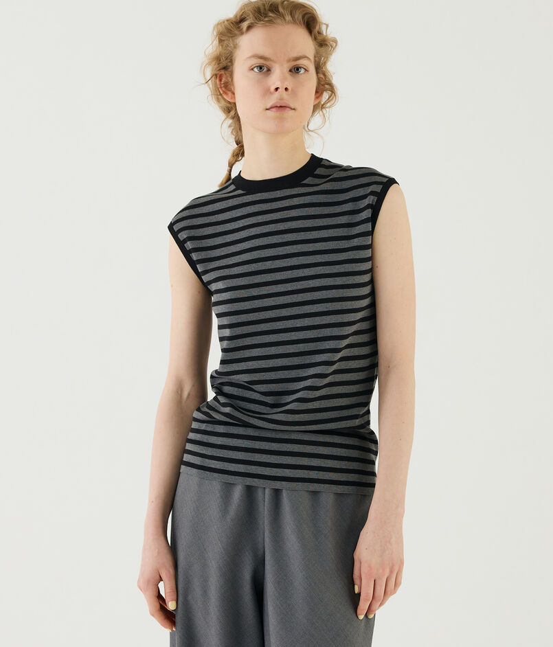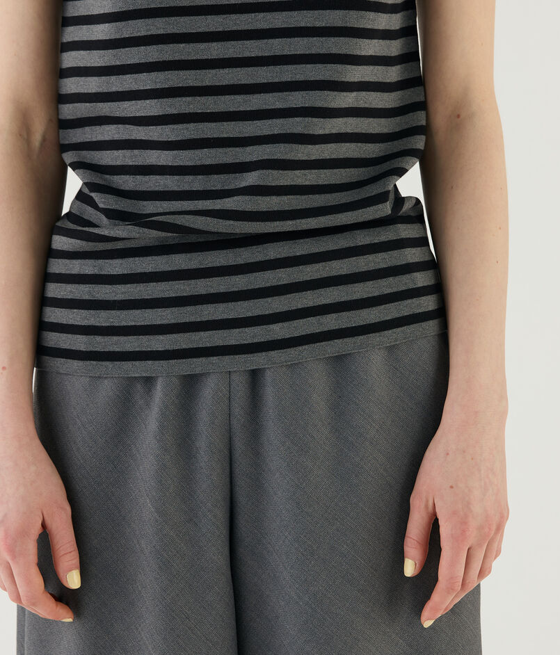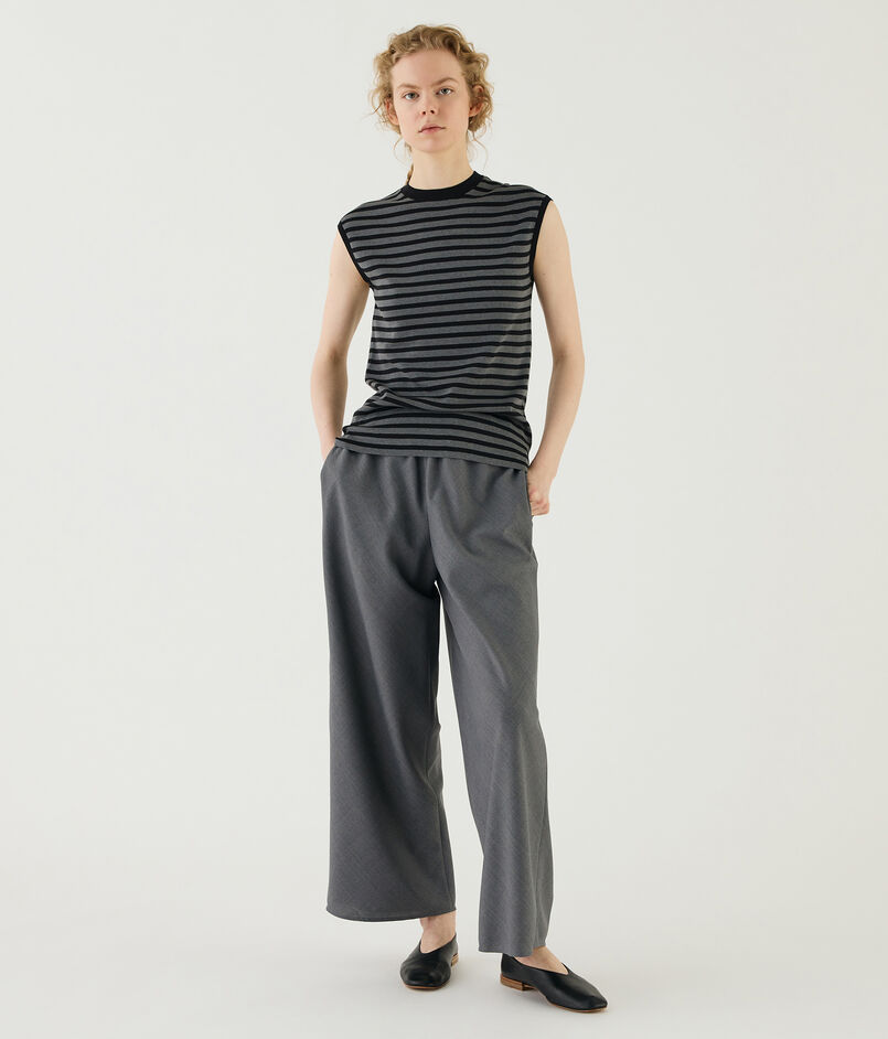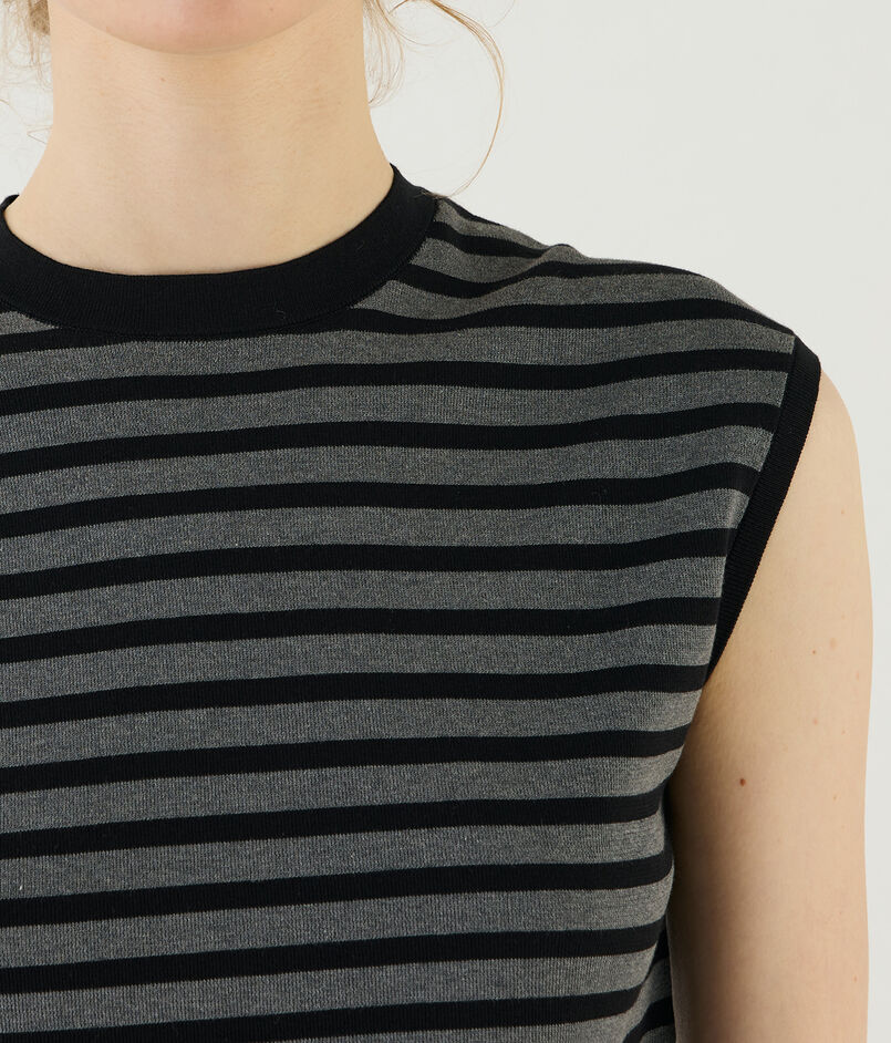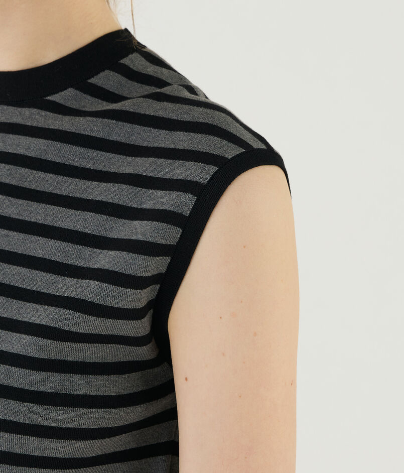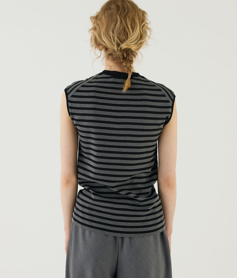 ノースリーブプルオーバーはほど良くフィットするシルエットに詰まったネックラインと袖まわりのデザインでヘルシーな雰囲気の一着です。
