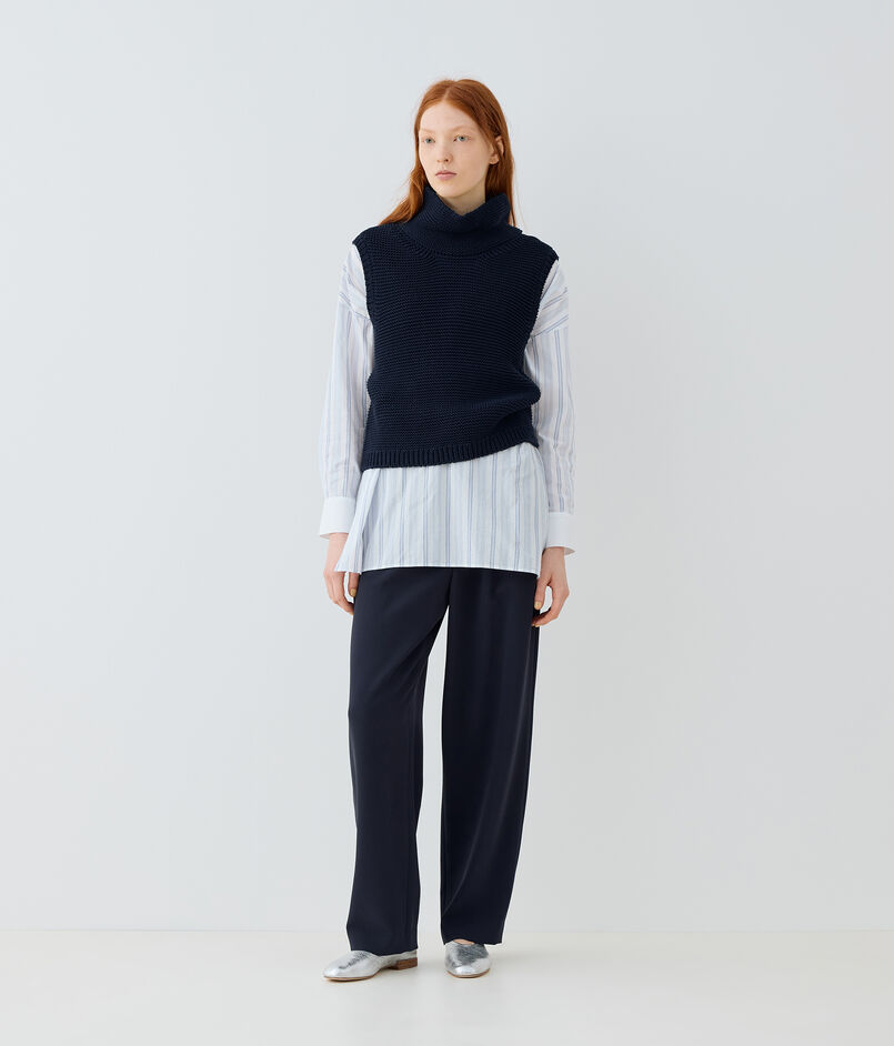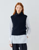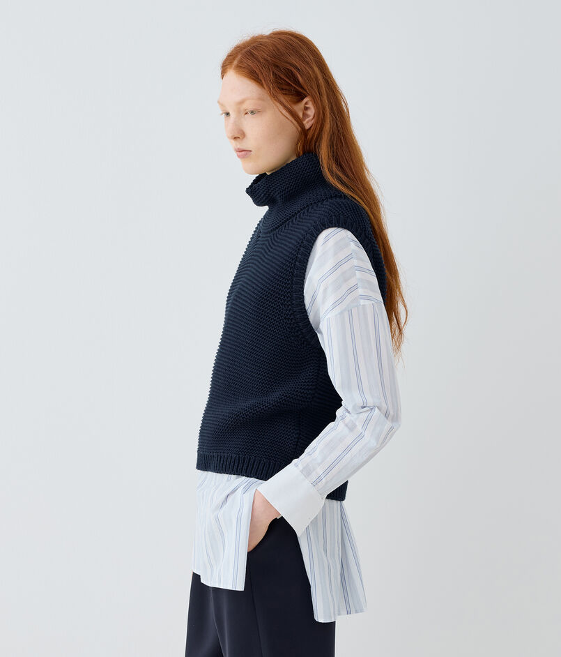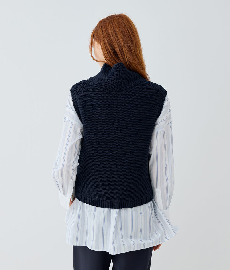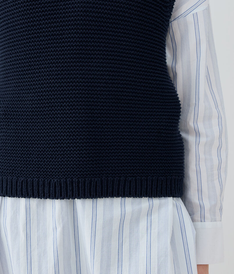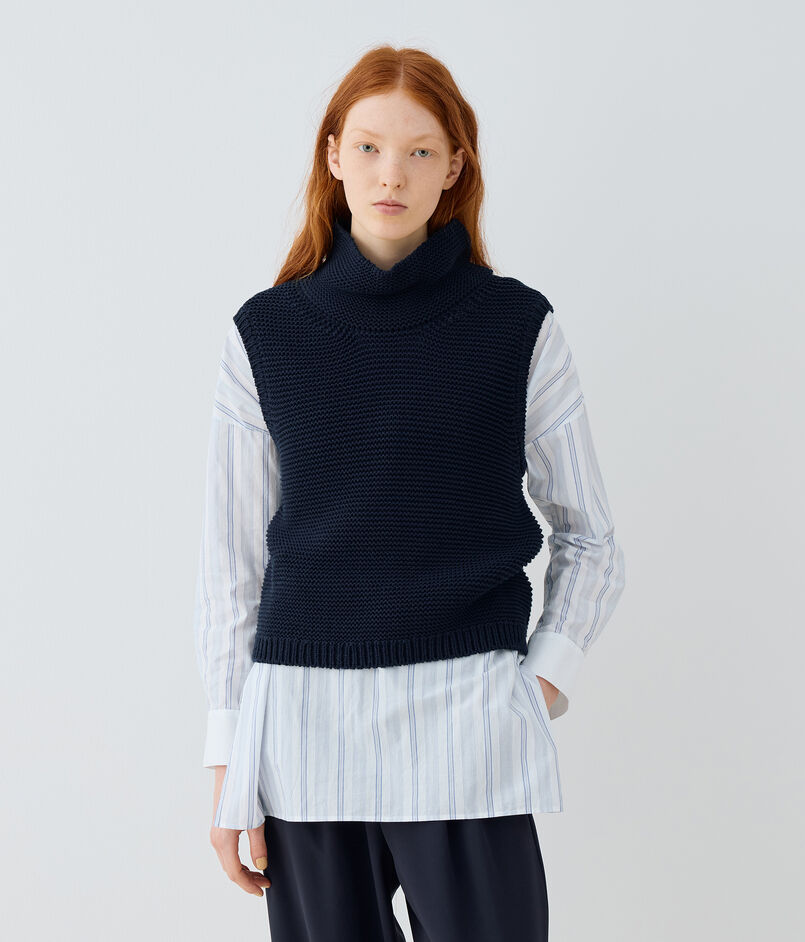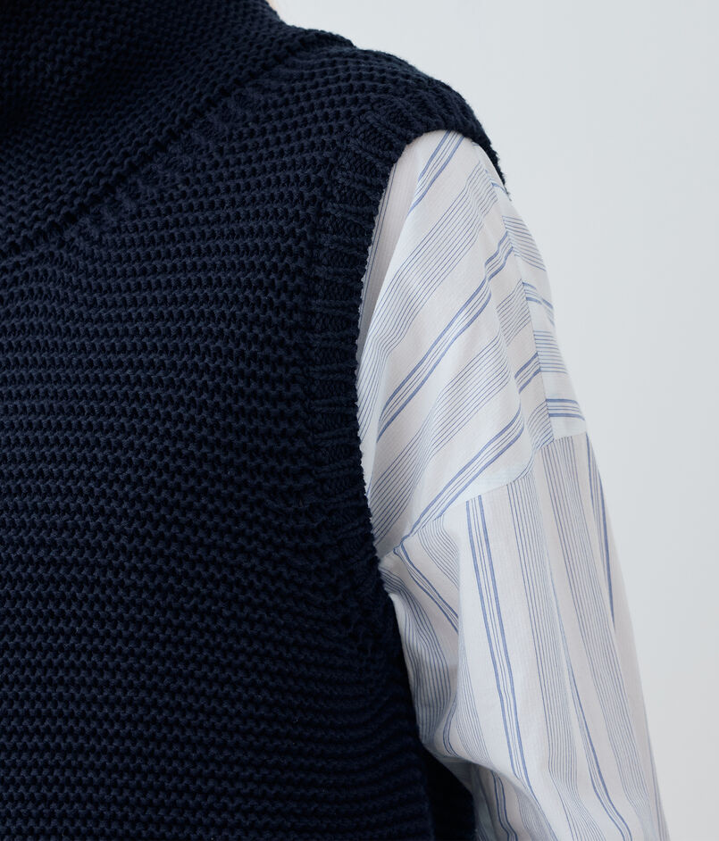 シャツやTシャツとレイヤードしたり、暑い時期には一枚でノースリープトップスとして着用するなど、季節を問わず活躍してくれる上質なプラスワンアイテム。
