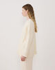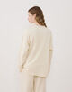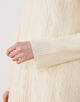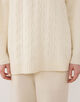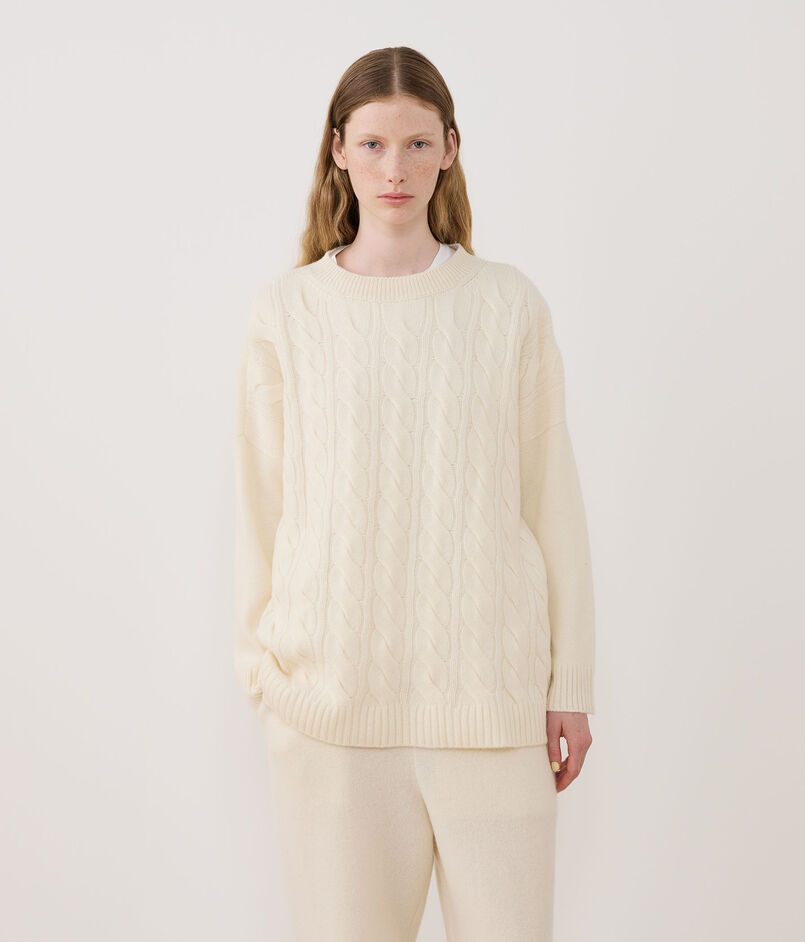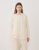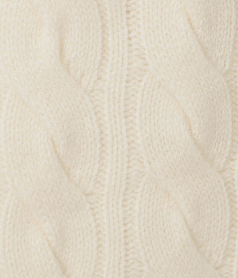 前身頃のケーブル柄がポイントで、ゆったりとしたボックスシルエットも相まってリラックスムード漂う一着です。
