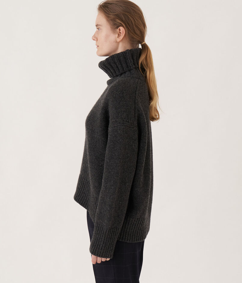 タートルネックプルオーバーはゆったりとしたボディとしっかりと立ち上がるハイネックのバランスにこだわり、ブランドらしいリラックスしたニュアンス感のある表情に仕上げた一着。