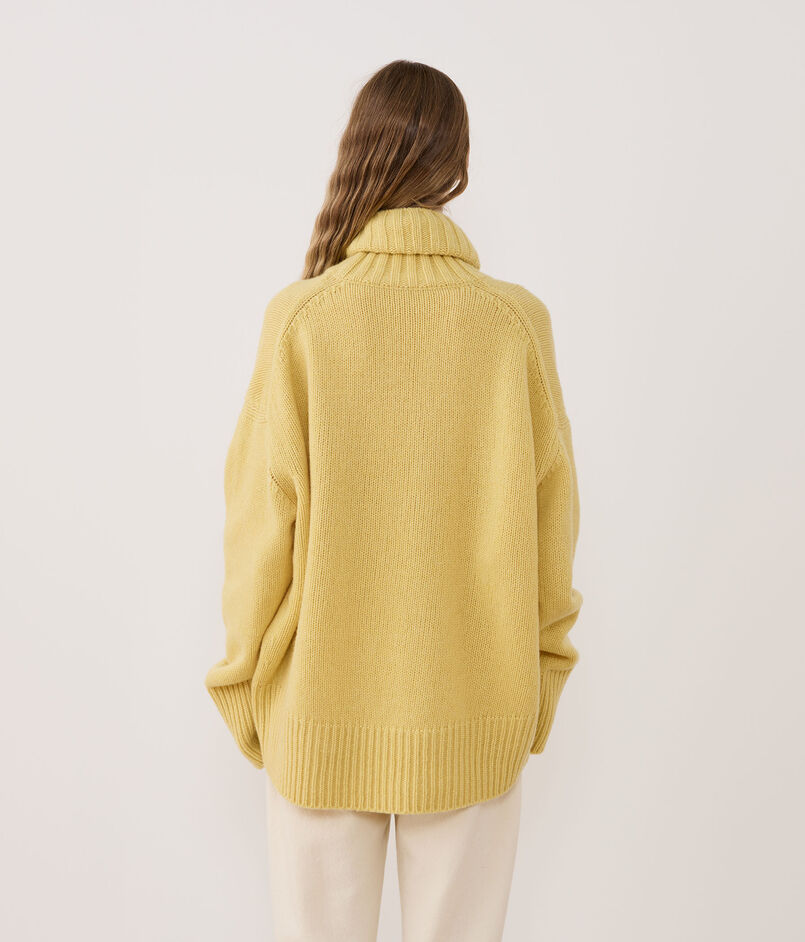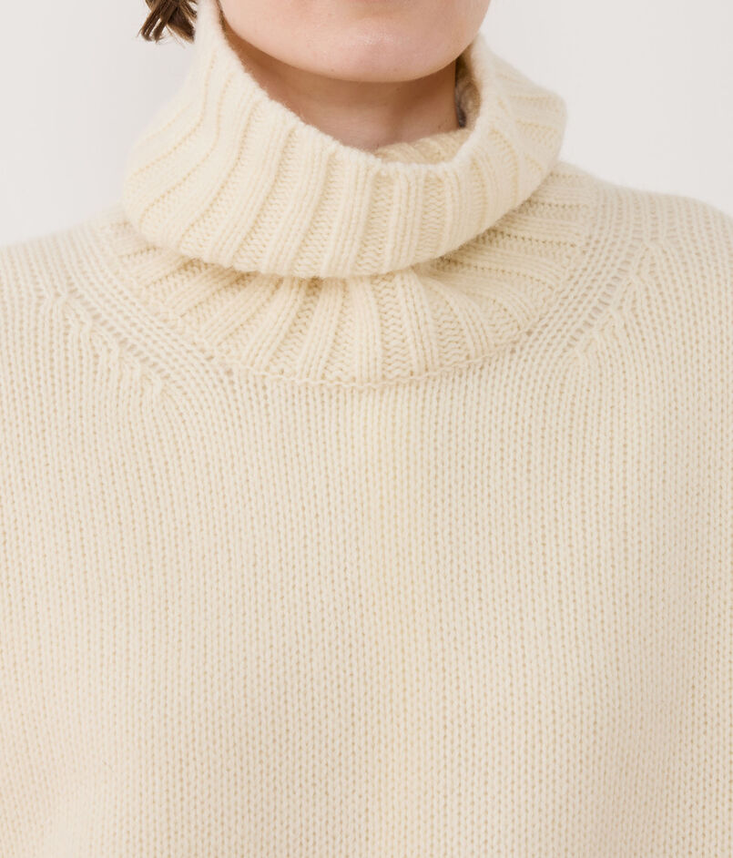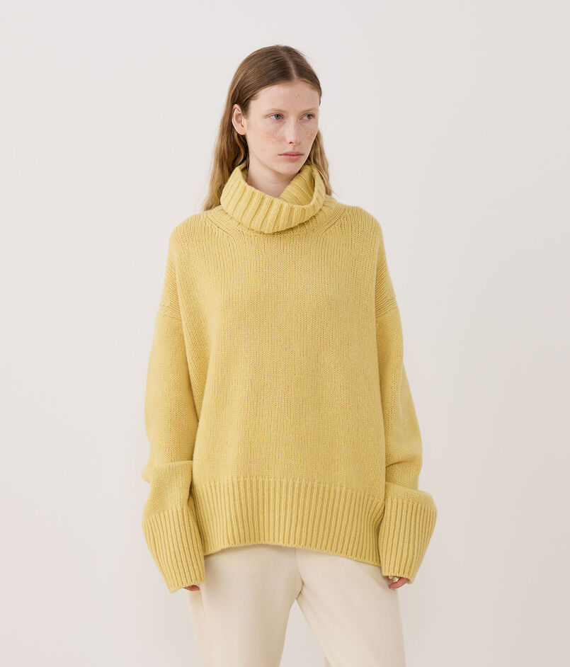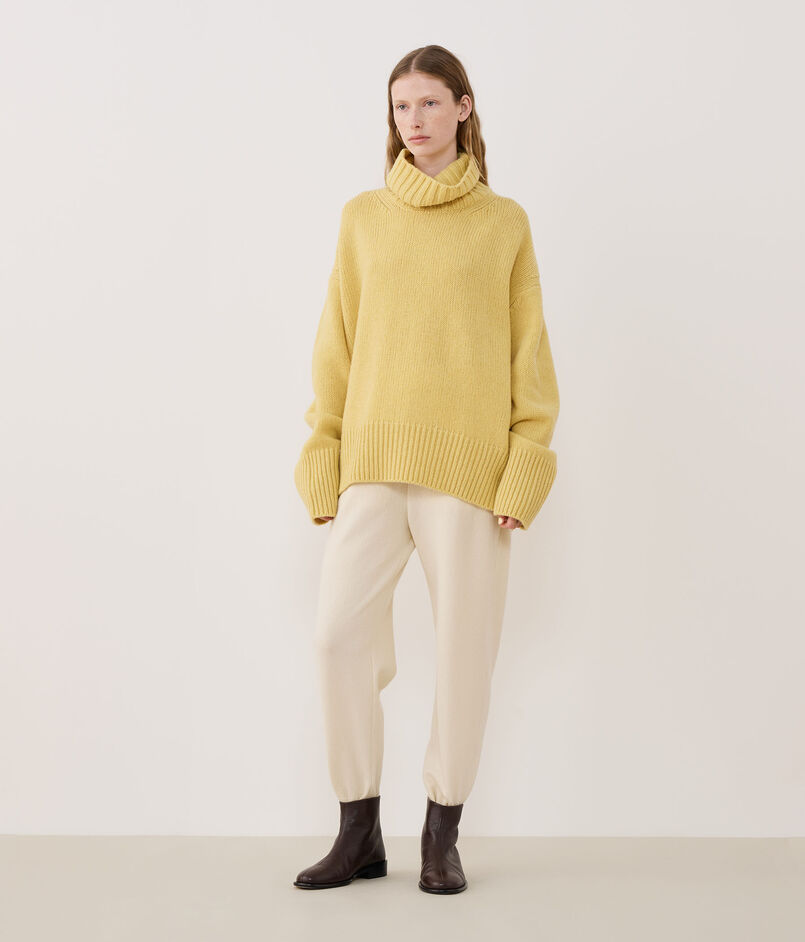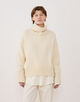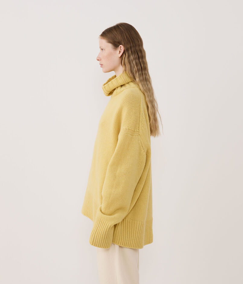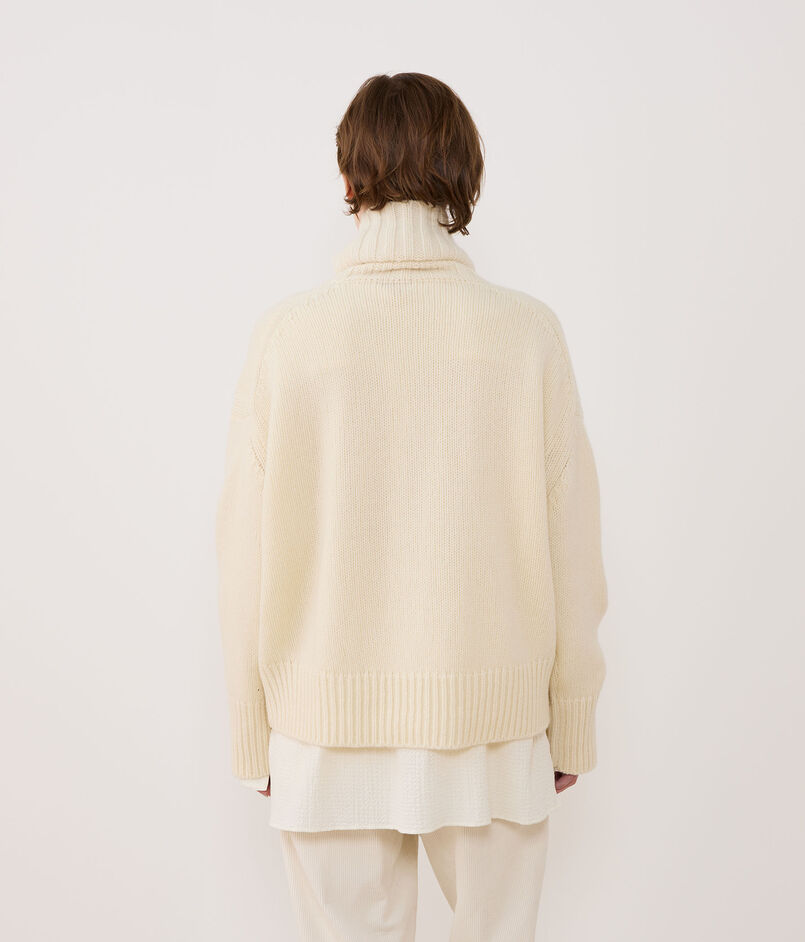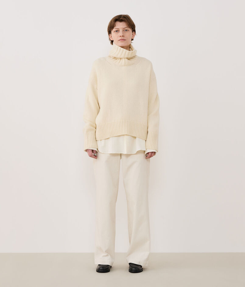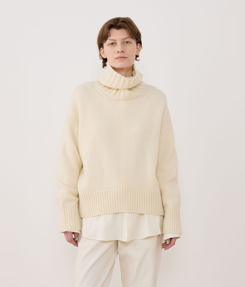 タートルネックプルオーバーはゆったりとしたボディとしっかりと立ち上がるハイネックのバランスにこだわり、ブランドらしいリラックスしたニュアンス感のある表情に仕上げた一着。