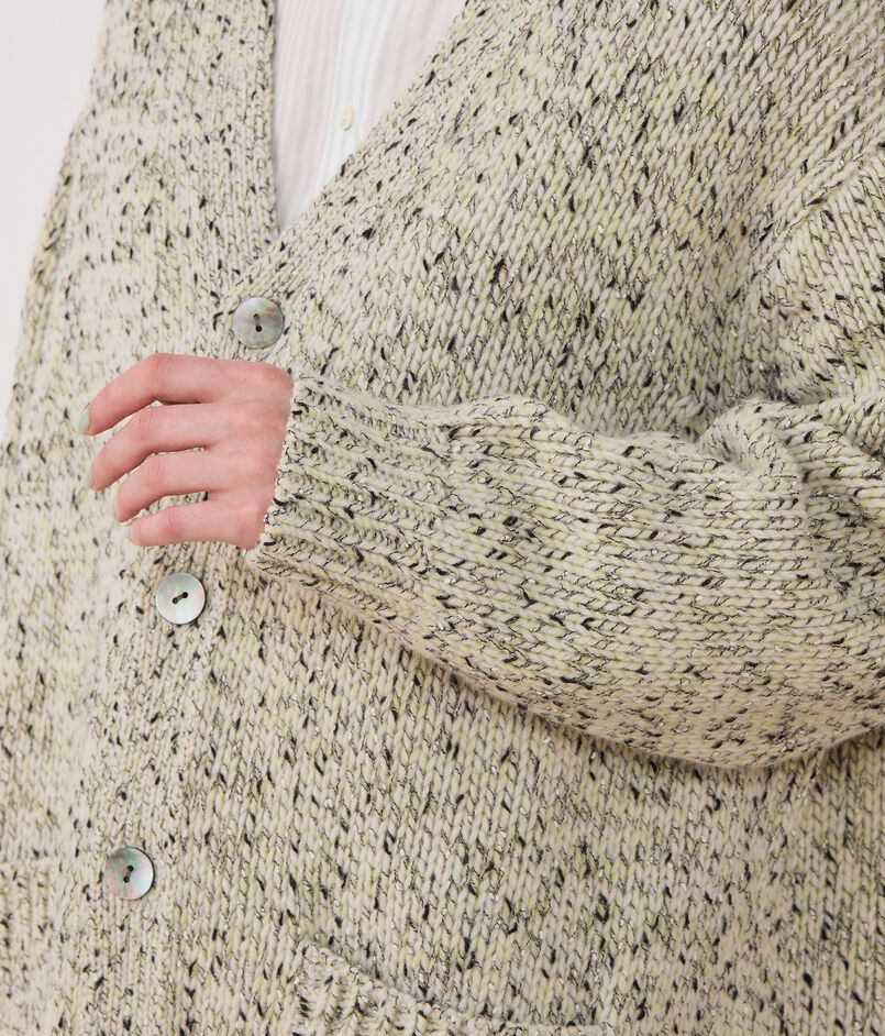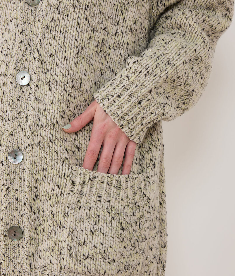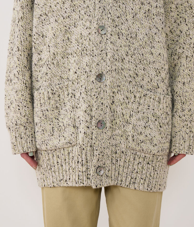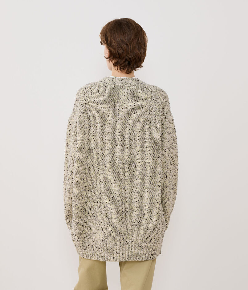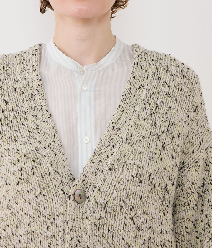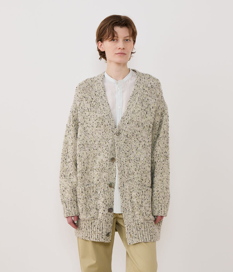 カーディガンはヒップまで隠れる着丈とゆったりとしたシルエットで、抜け感のある一着。