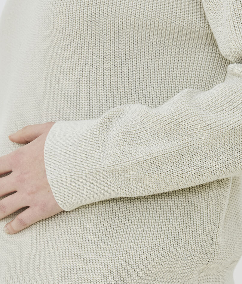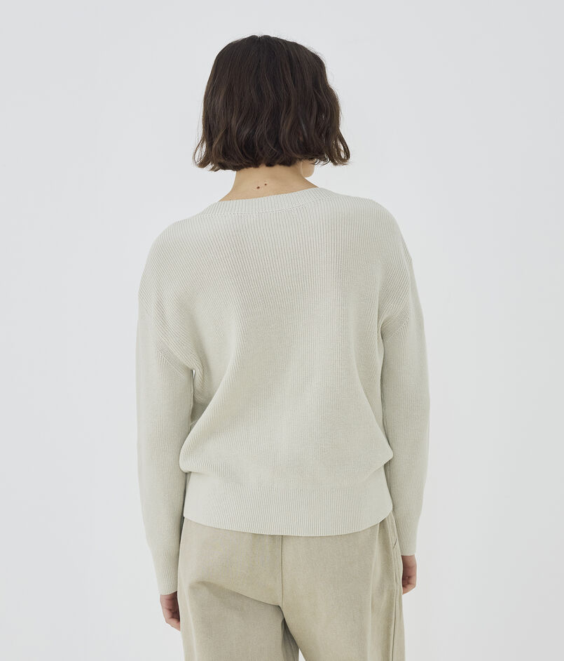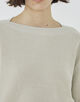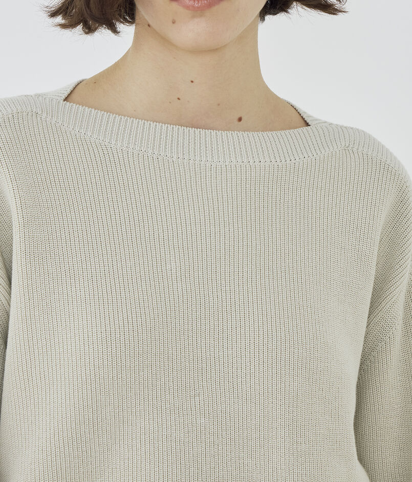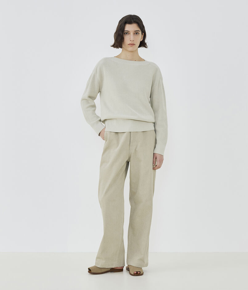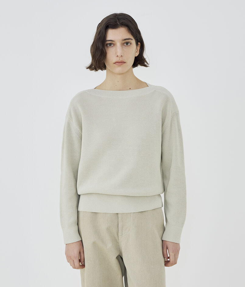 ボートネックプルオーバーは襟のリブ編みが特徴的な一着。