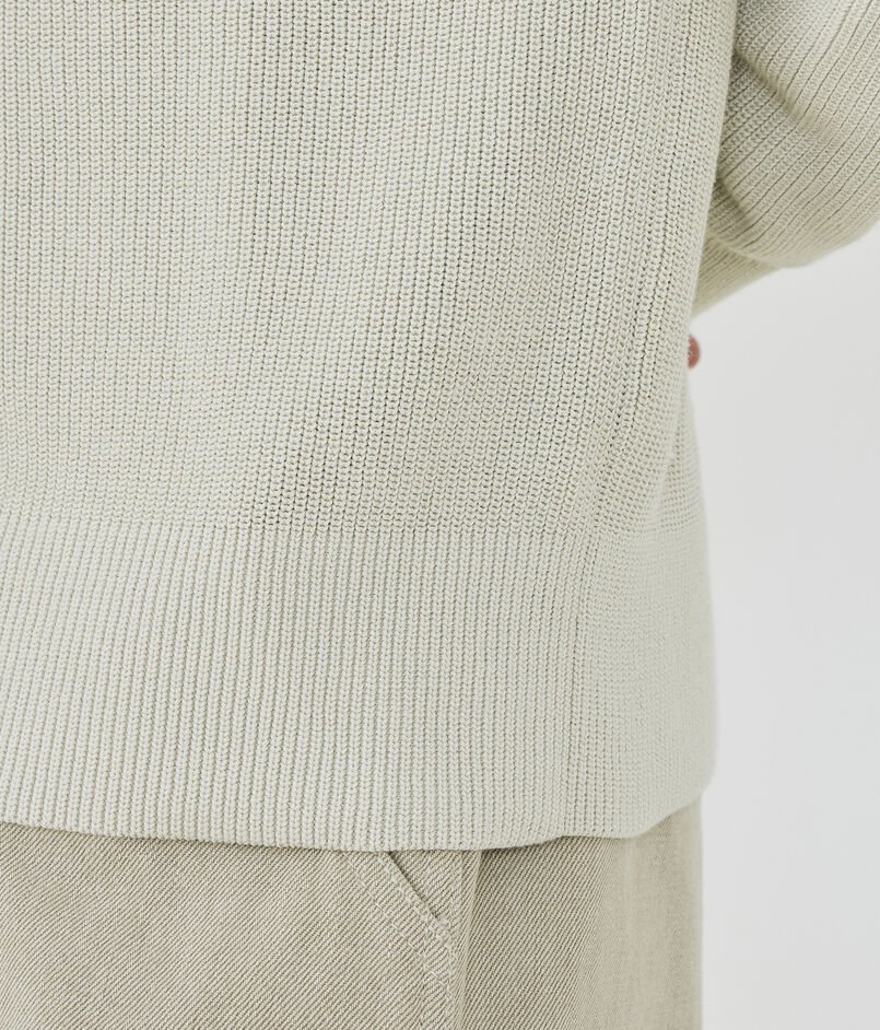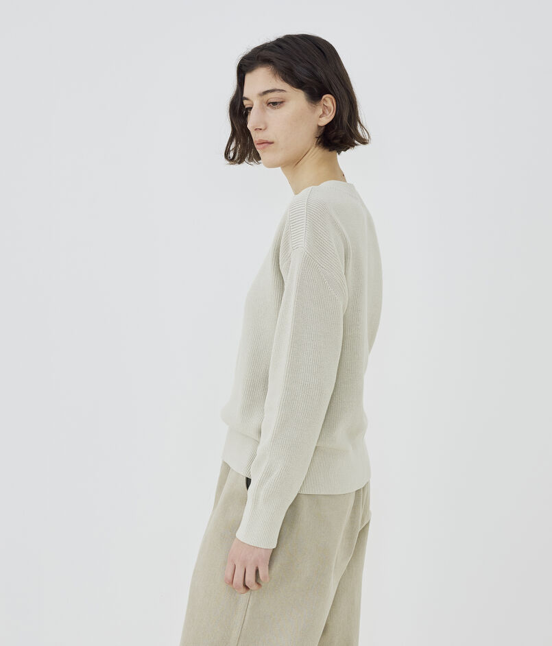 コンパクトスビン紡績の強撚糸を特殊な機械で編み上げた、目の詰まったきれいな表面感が魅力の片畦編みのニットシリーズ。