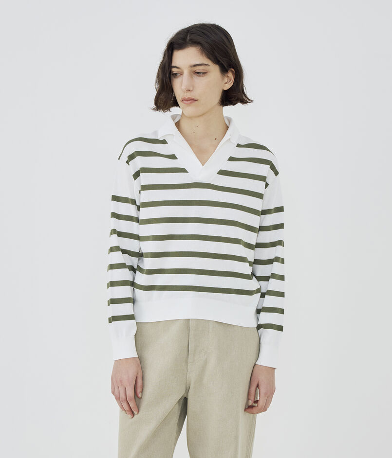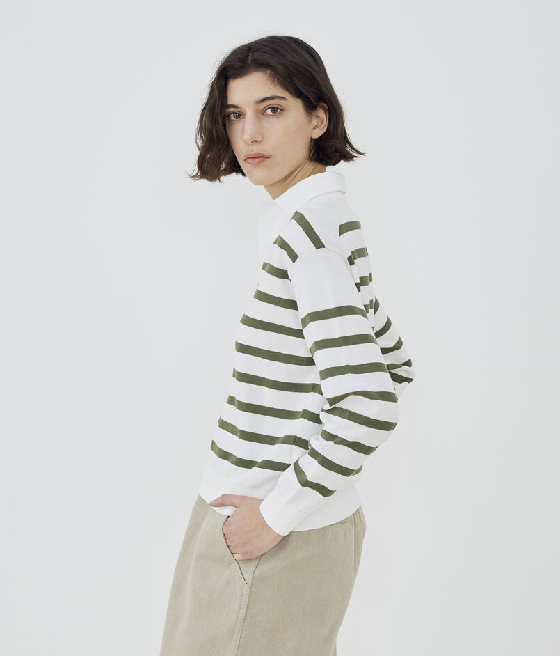 今季新型のオープンカラープルオーバーは鎖骨が美しく見えるよう、首元の開きをやや横に広く仕上げました。