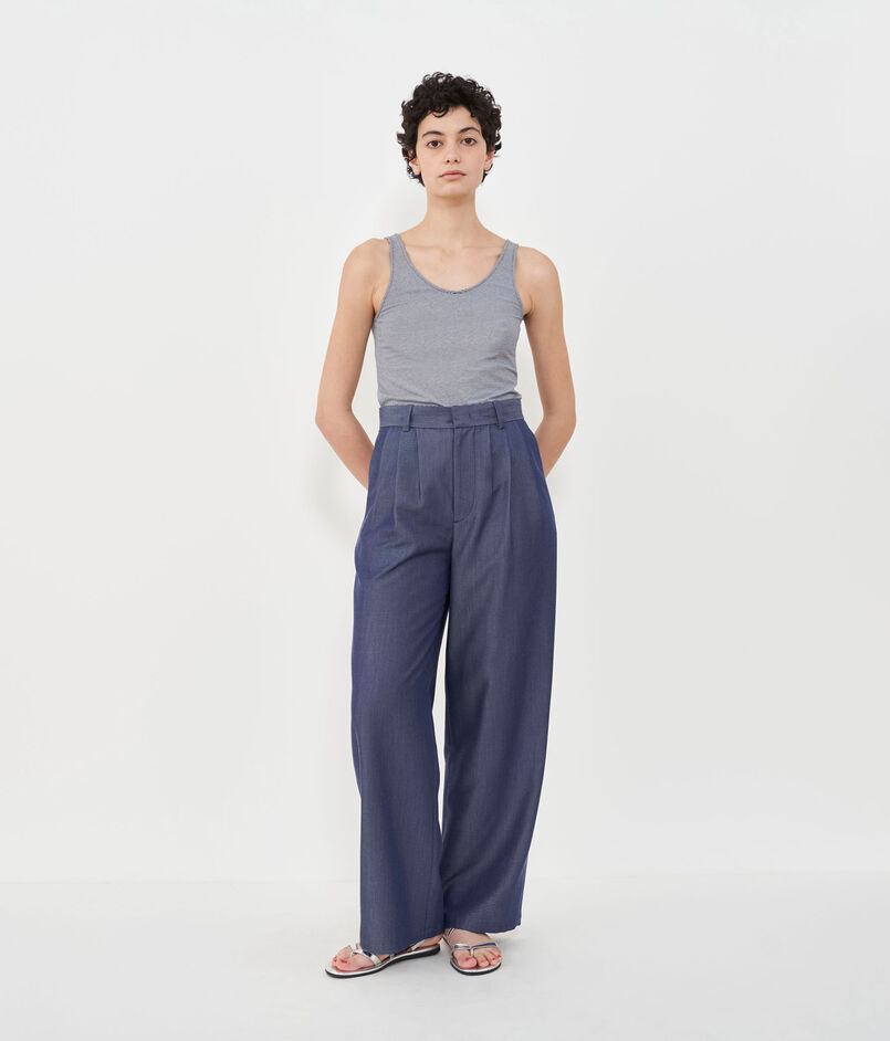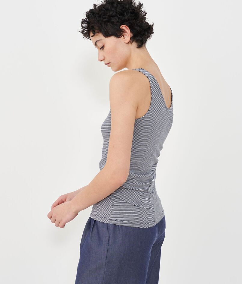 タンクトップは細めのショルダーや前後ともにカッティングにこだわったネックラインがヘルシーな印象の一着。