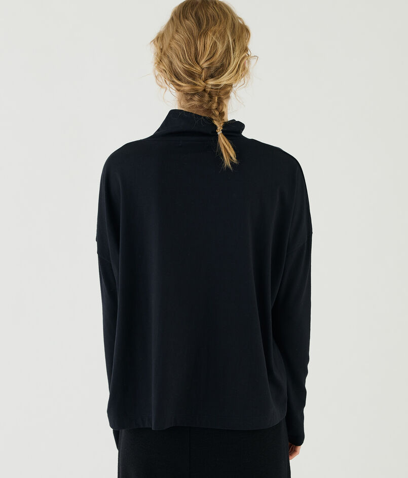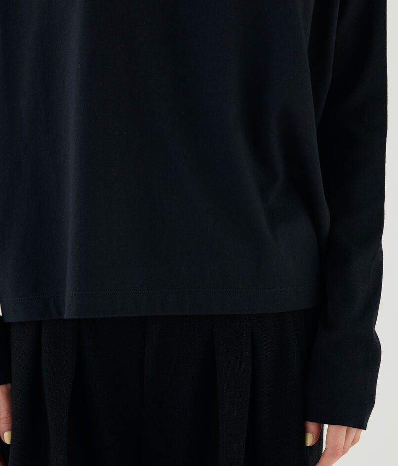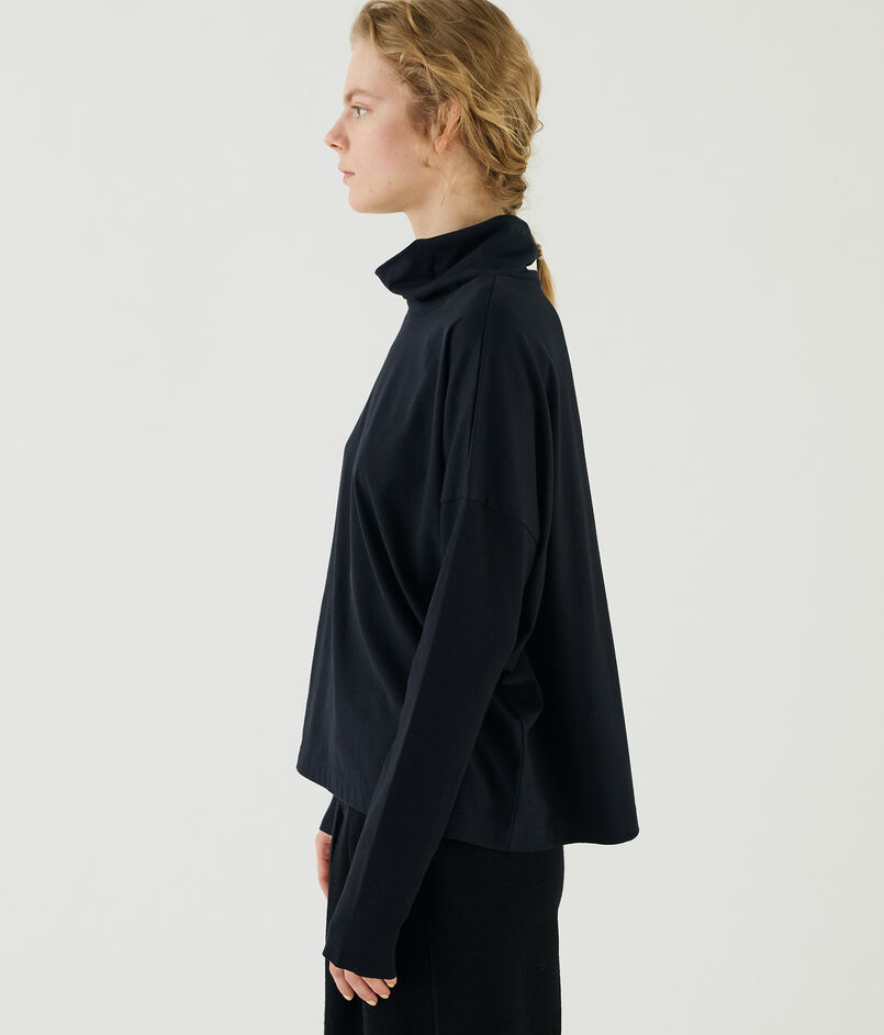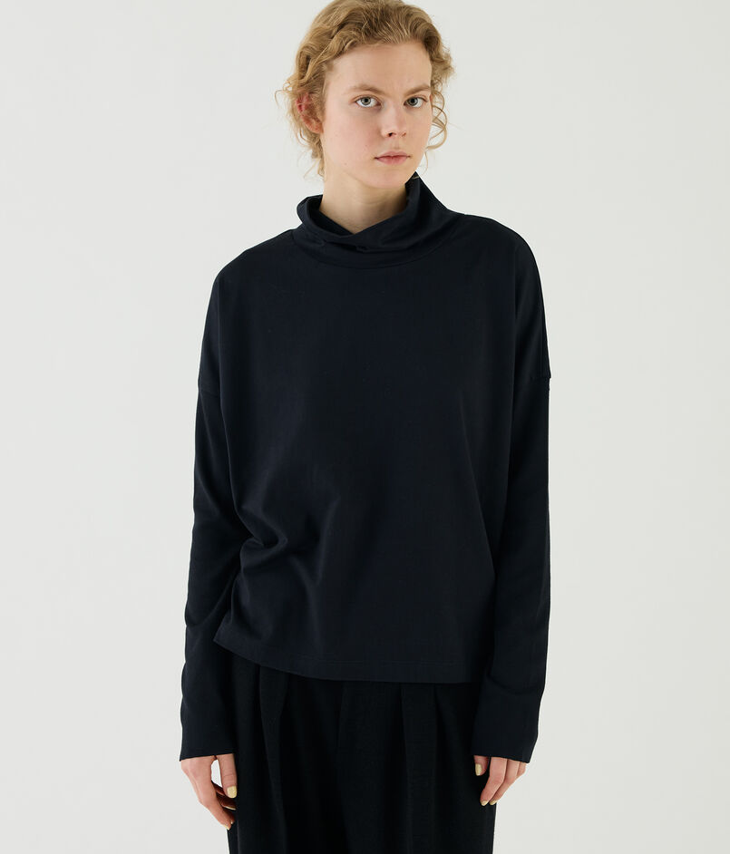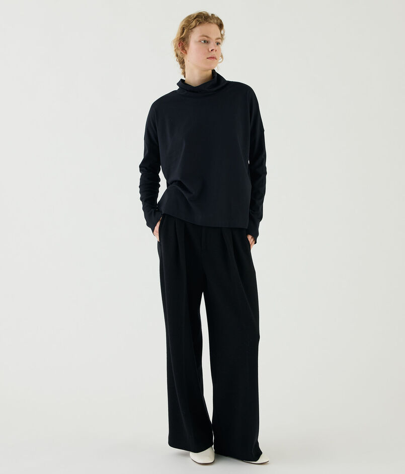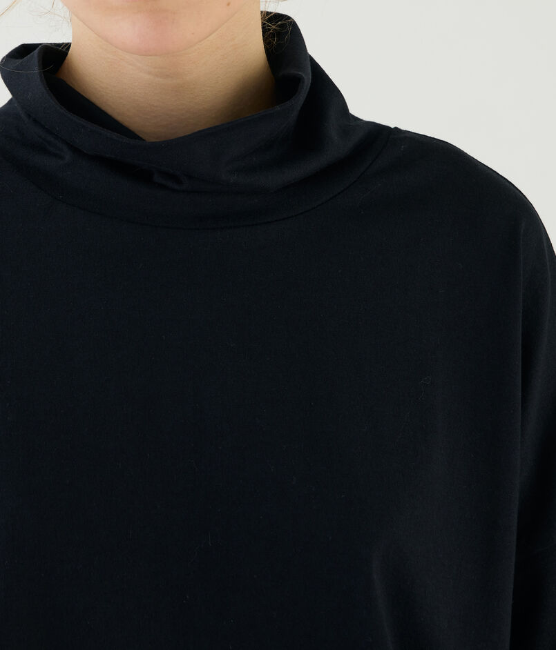ハイネックプルオーバーはゆったりとした身幅のサイズ感でリラックスムード漂う一枚。