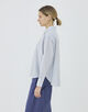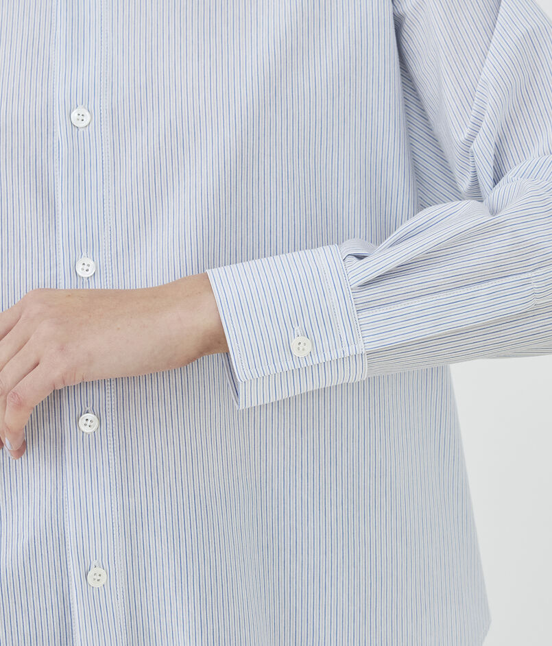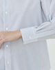 首元はボタンを外しても衿が美しく立ち上がり、クリーンな雰囲気とストレスフリーな着心地を両立。