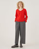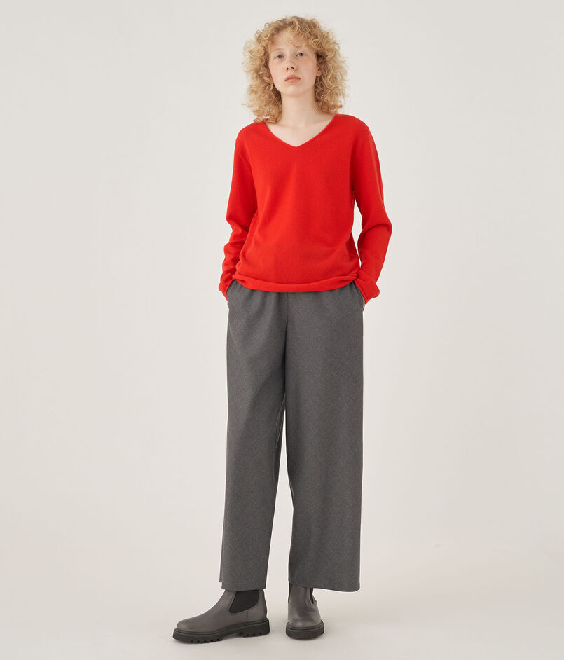 ゆったりとしたシルエットとウエストゴムのデザインでリラックス感がありつつも、生地のもつ落ち感で女性らしい柔らかな印象に。
