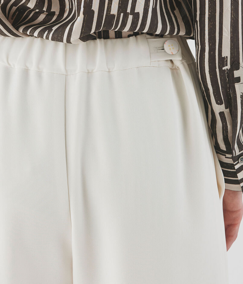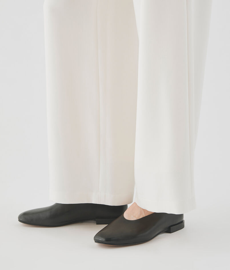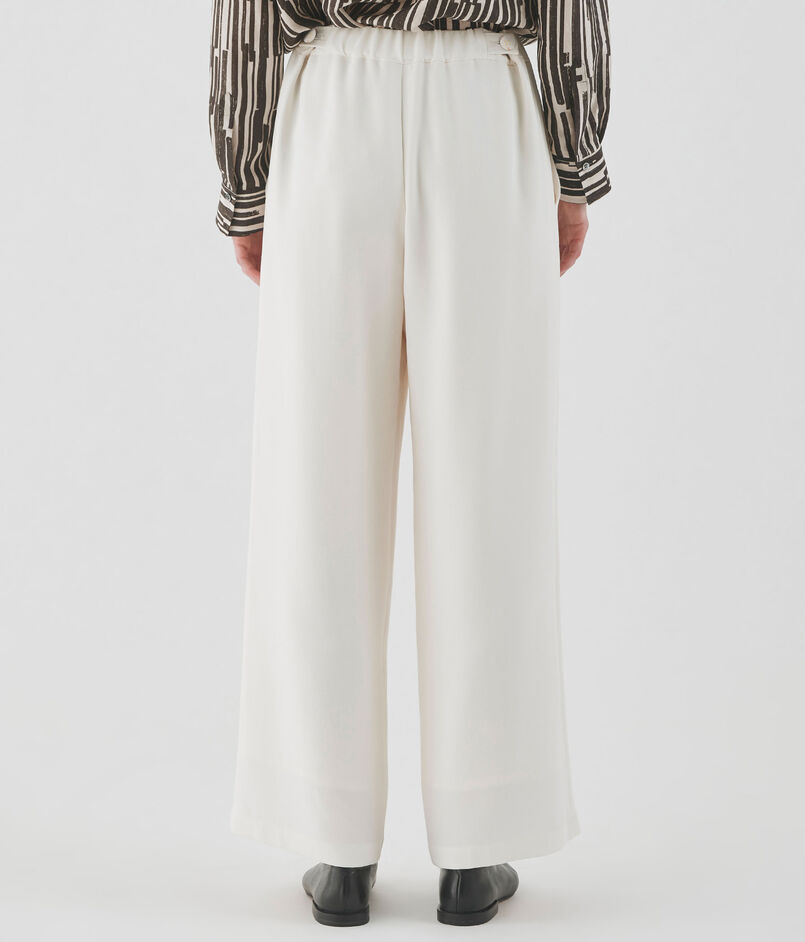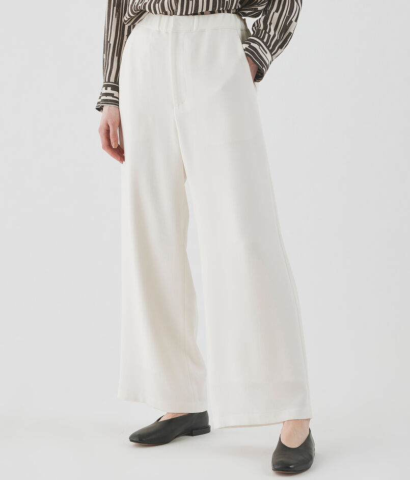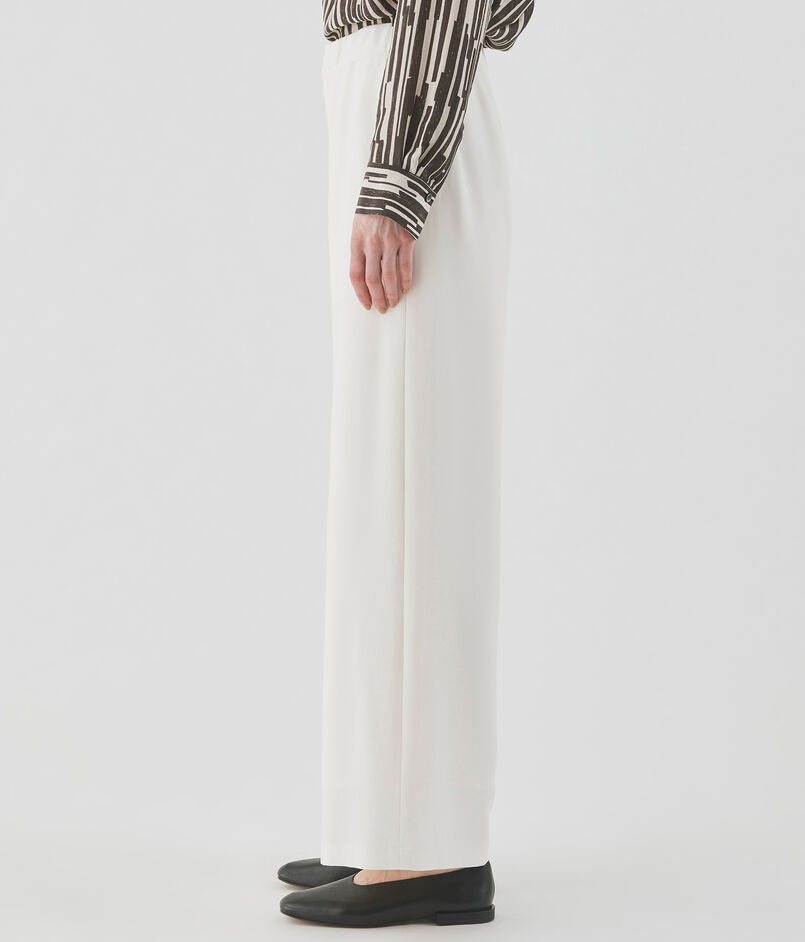トリアセテート糸とポリエステル糸を合撚し高密度に織り上げた、ふっくらとした柔らかさと軽やかでスポンディッシュな素材感のパンツ。