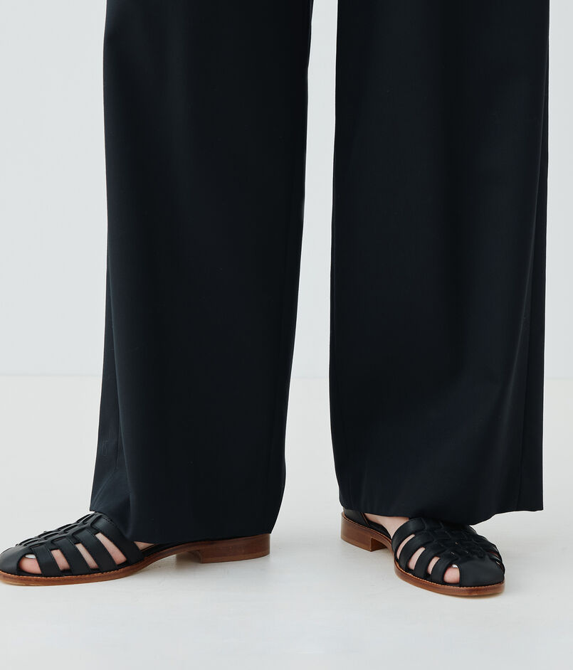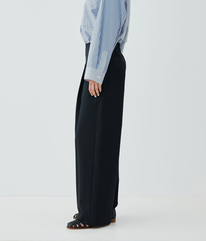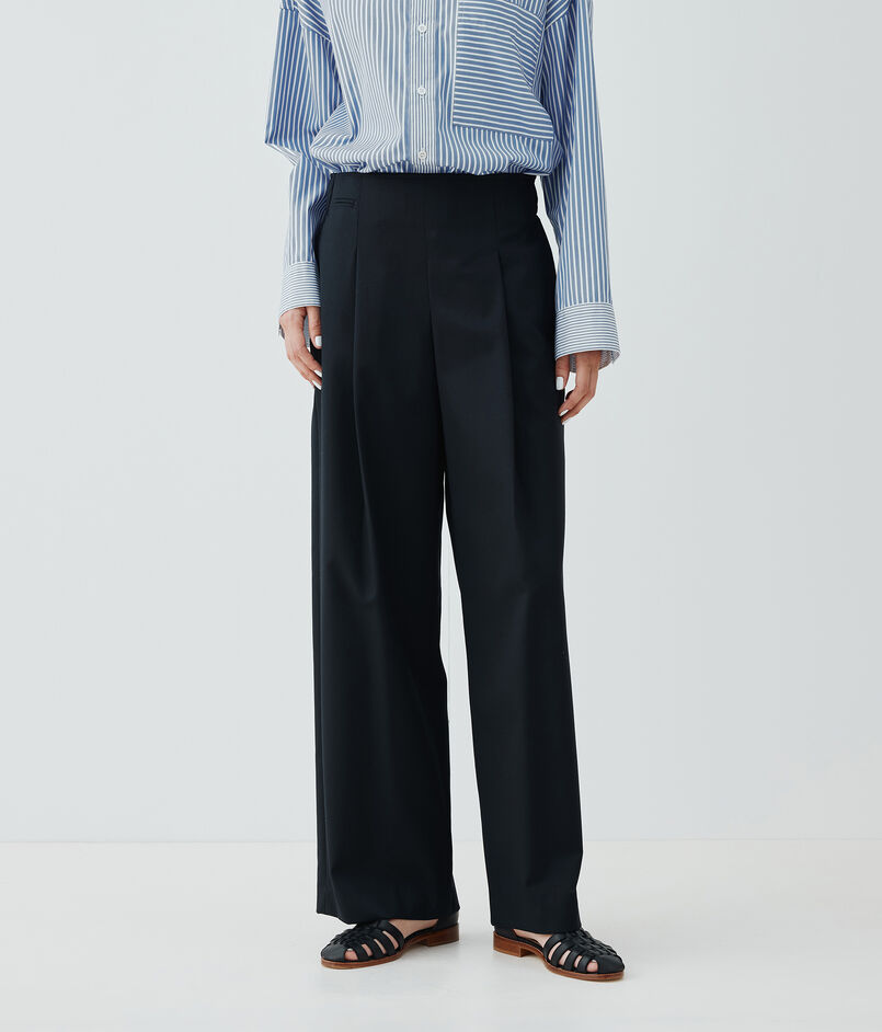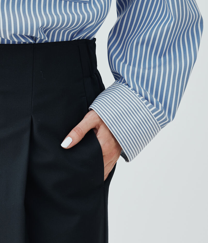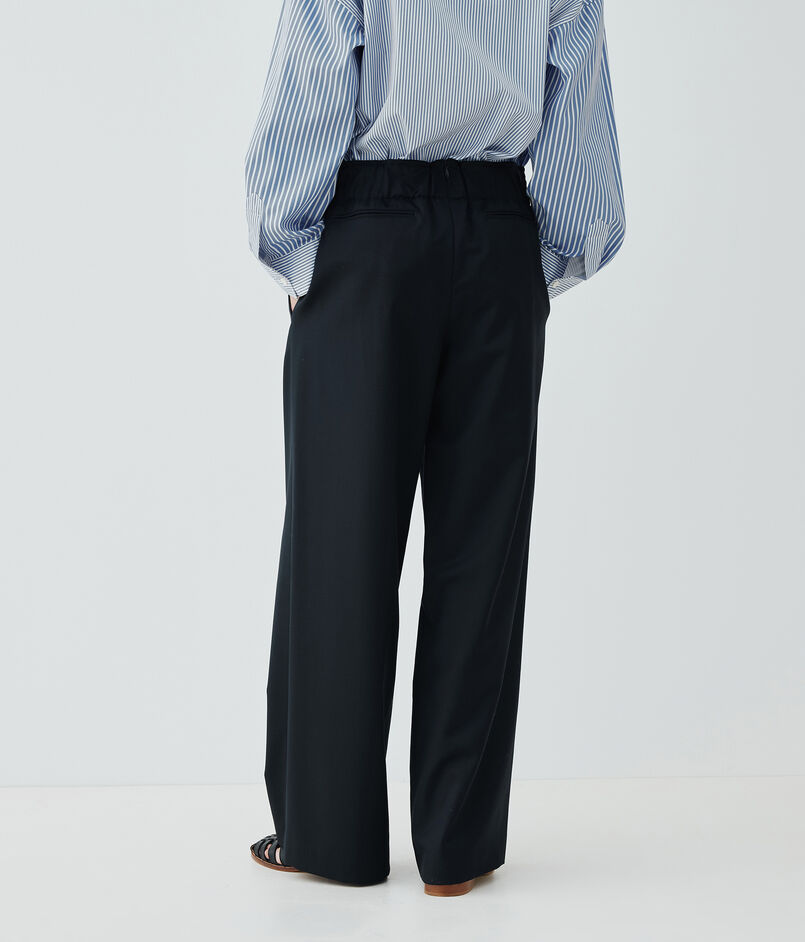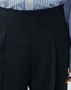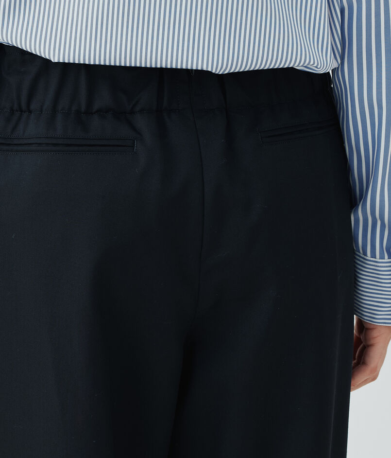 タックパンツはフロントに深めのタックを施したパンツは後ろウエストのゴムベルト仕様でしっかりとしたホールド感を感じていただける一着。