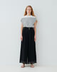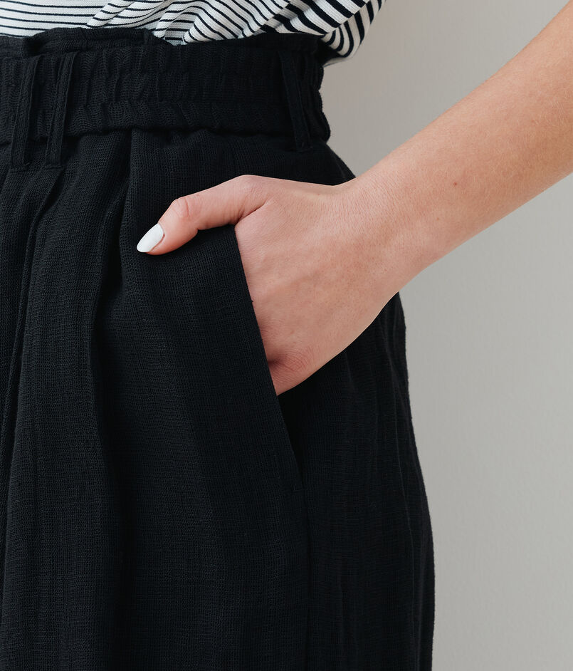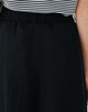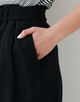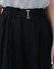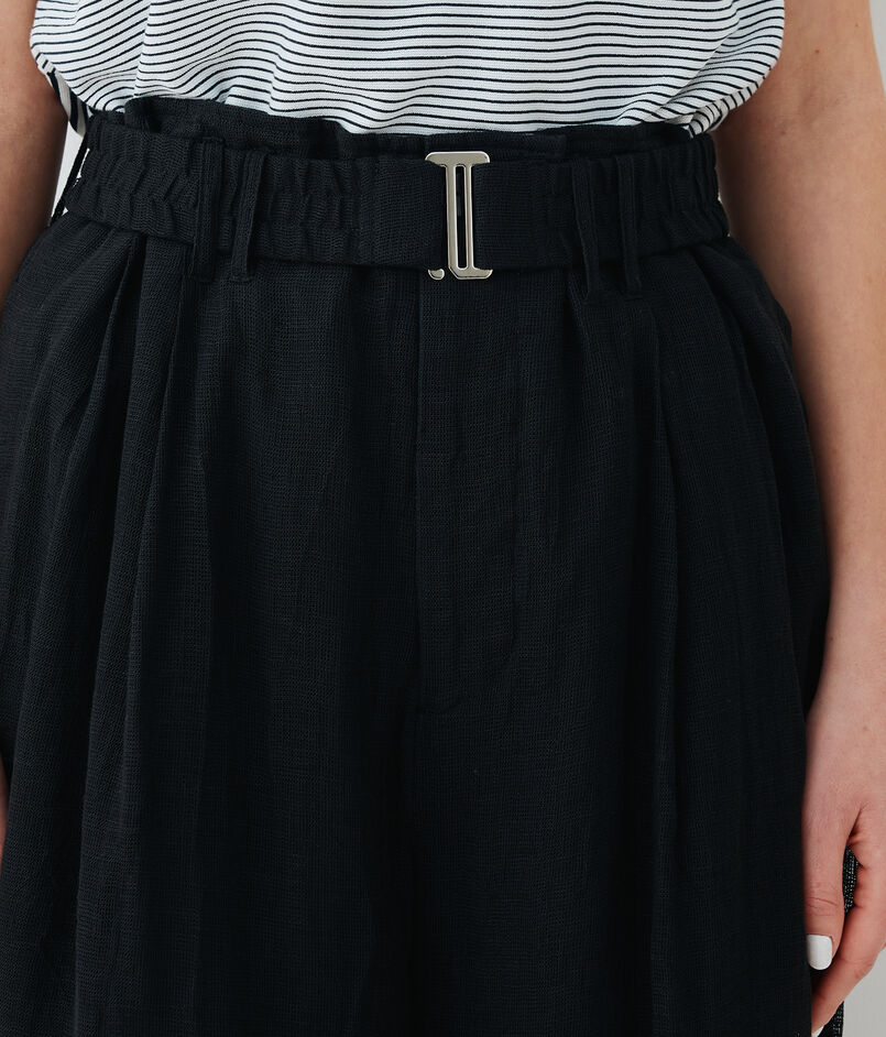 トップスをタックインし、共地のゴムベルトをアクセントにして着こなすのがおすすめです。