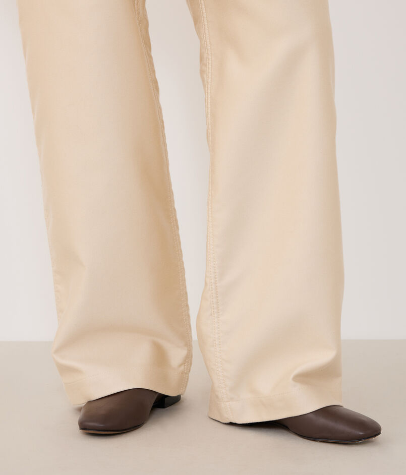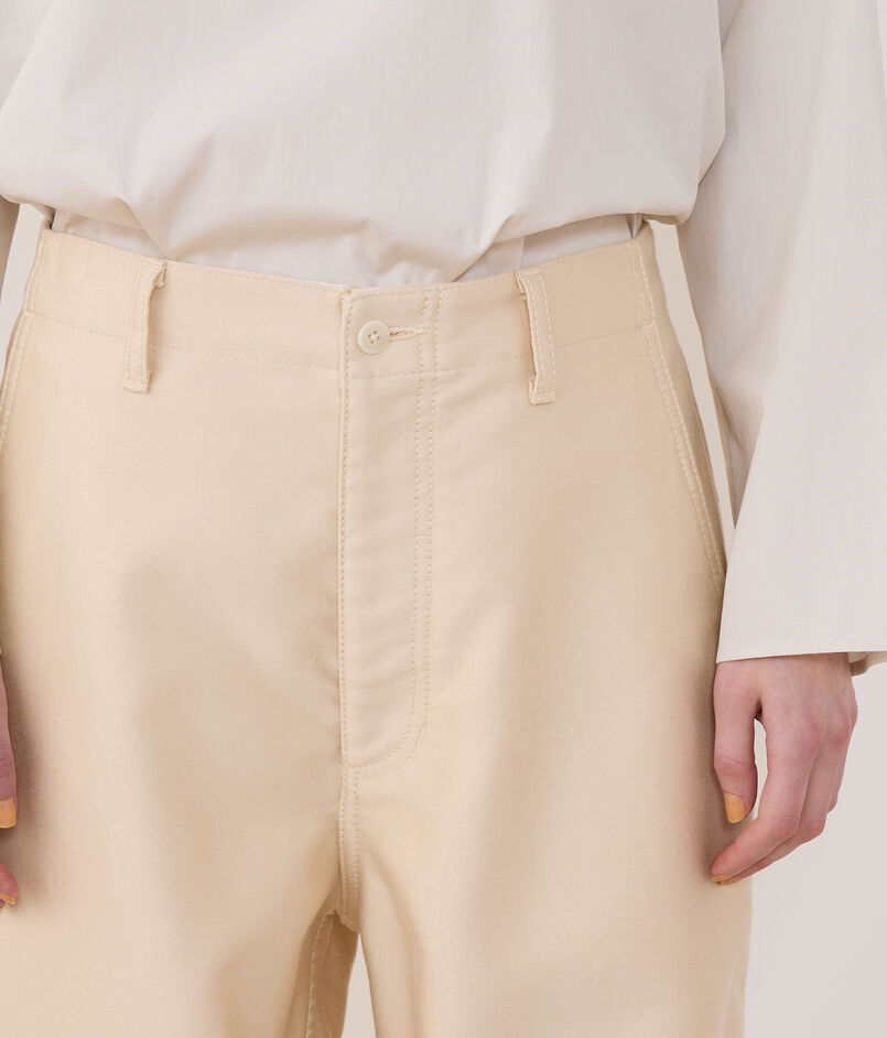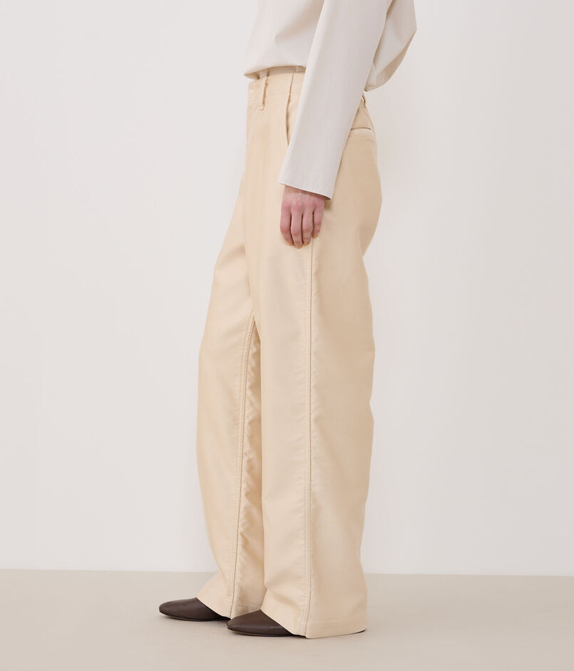 ソフトな質感と光沢が特徴のモールスキン素材を使用したパンツ。