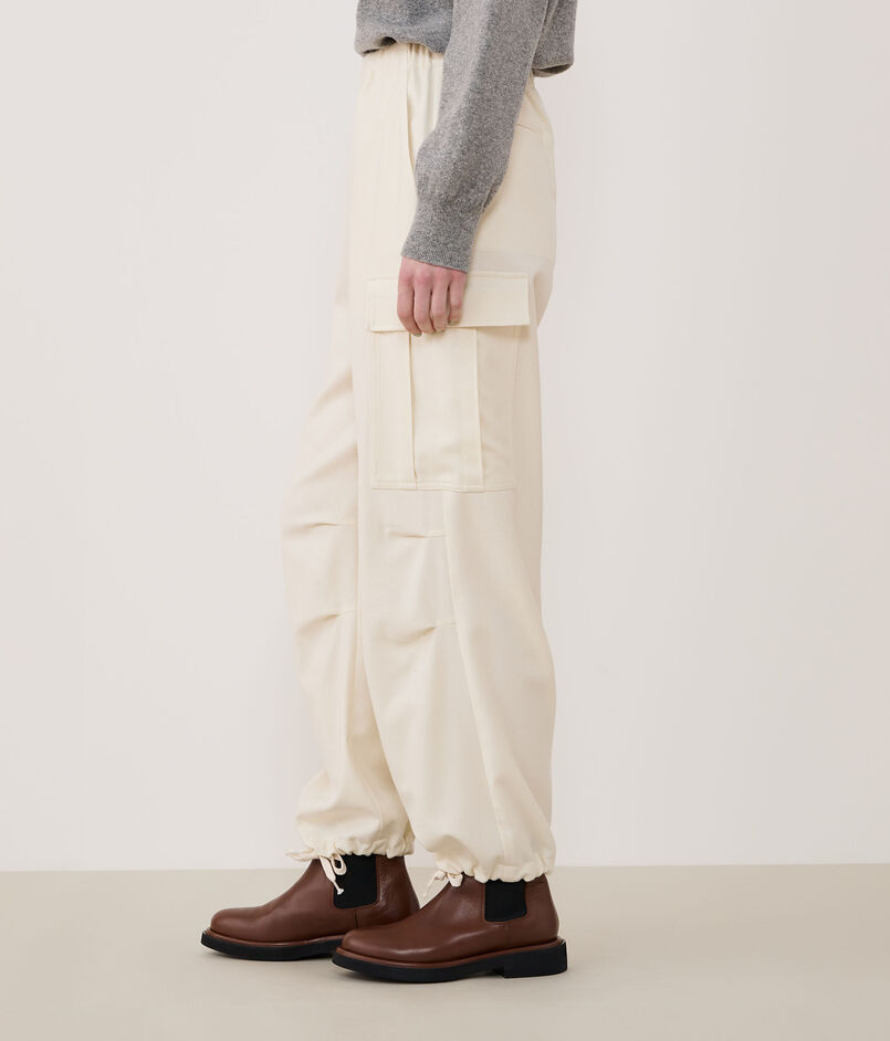 裾のドローストリングをきゅっと絞れば丸みのあるシルエットに変わり、気分に合わせて異なるバランスをお楽しみいただけます。