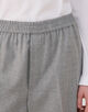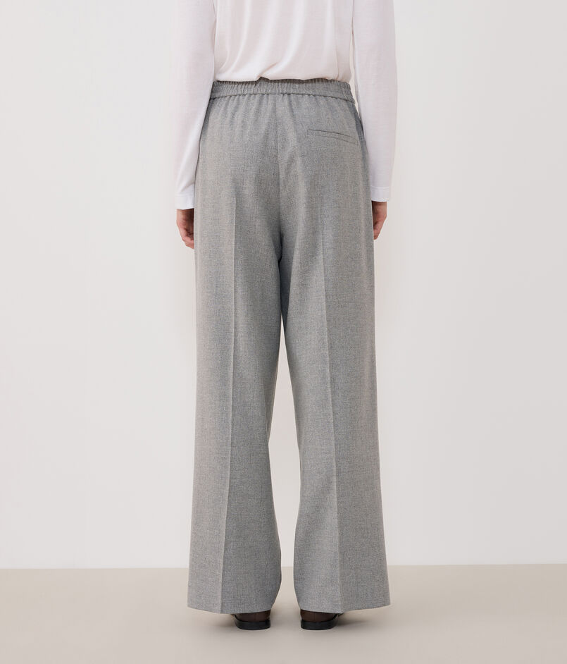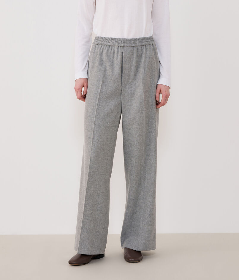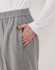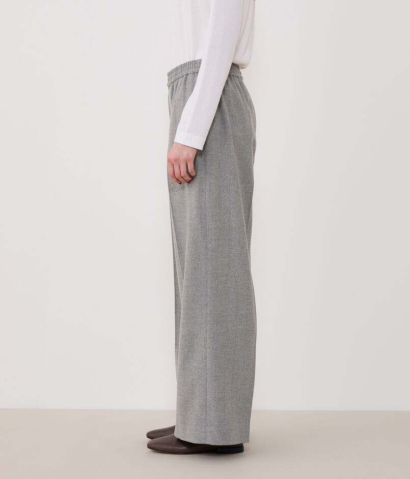 奥行き感のあるウール素材に極細のラメ糸をストライプ状に忍ばせた、さりげない華やぎを感じさせるボトムスシリーズ。