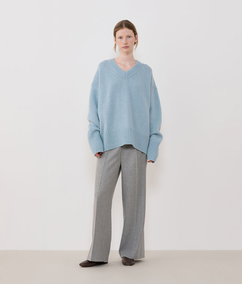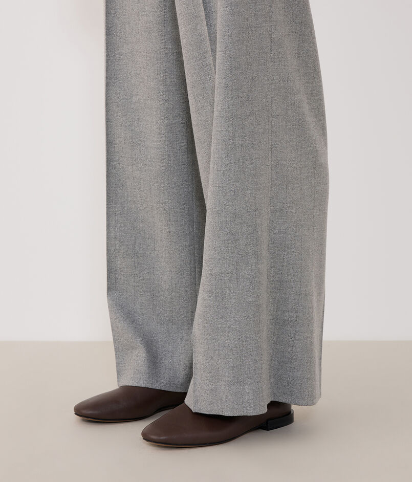 ワイドシルエットにセンタープレスを施すことですっきりとした印象に。