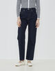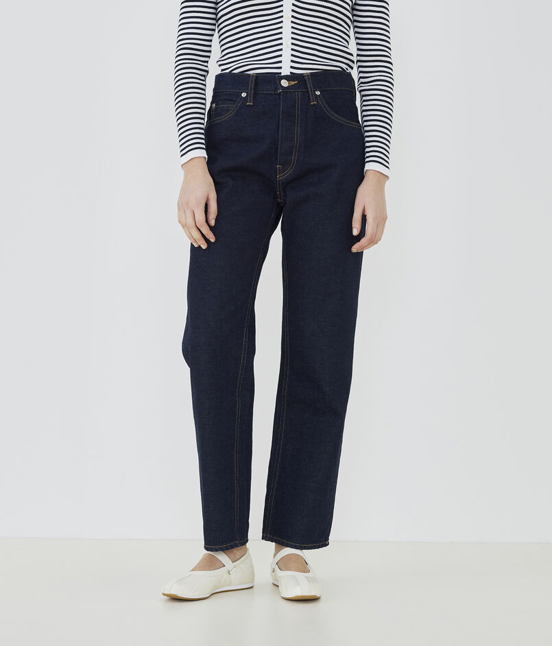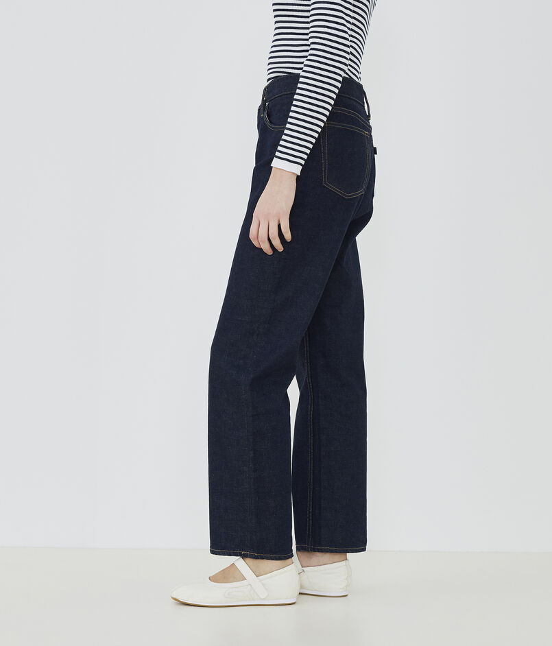 パンツは絶妙な太さのストレートシルエットで抜け感がありつつも、腰骨の上に掛かるジャストウエストのデザインでカジュアル過ぎないすっきりとしたバランスに。