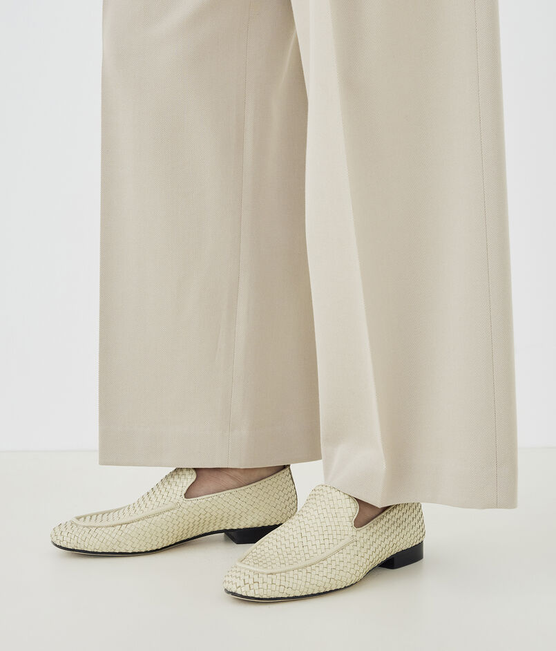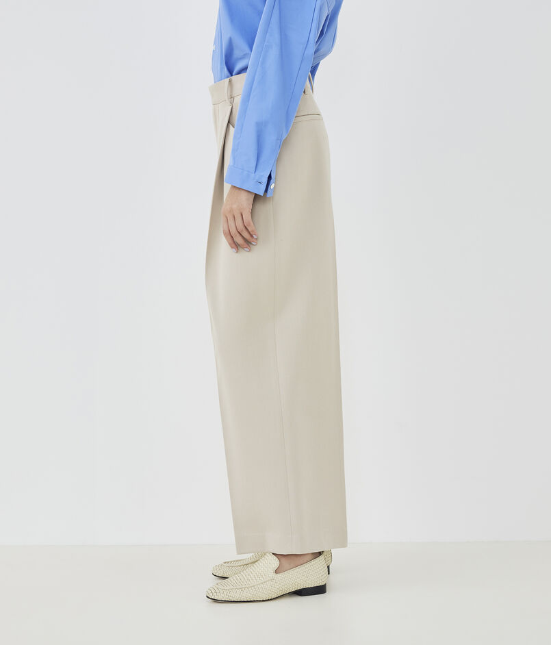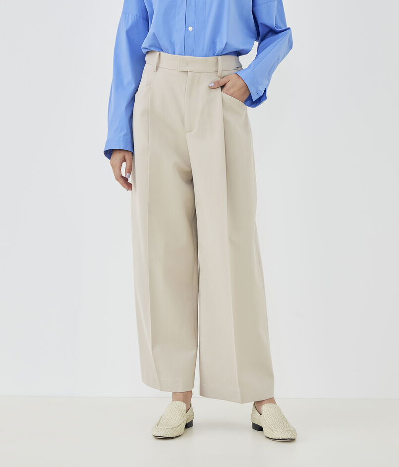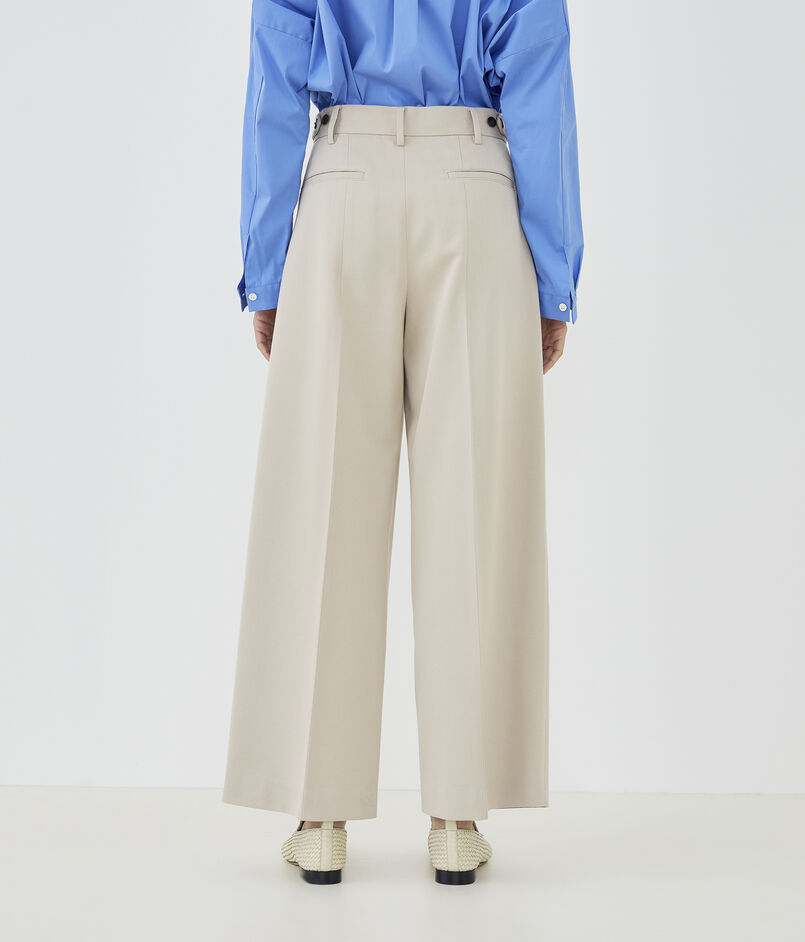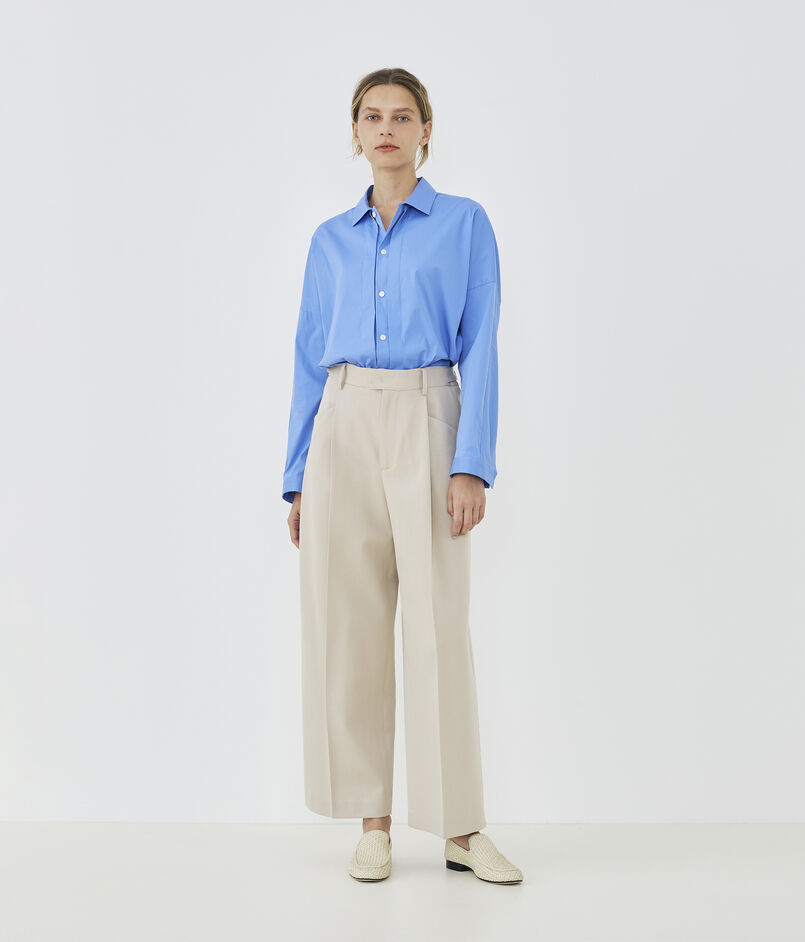 パンツは丸みのあるシルエットと深めのタックでボリューム感のあるバランスに。