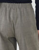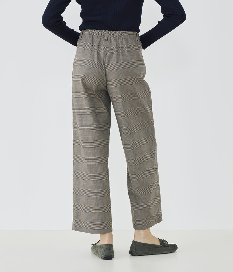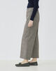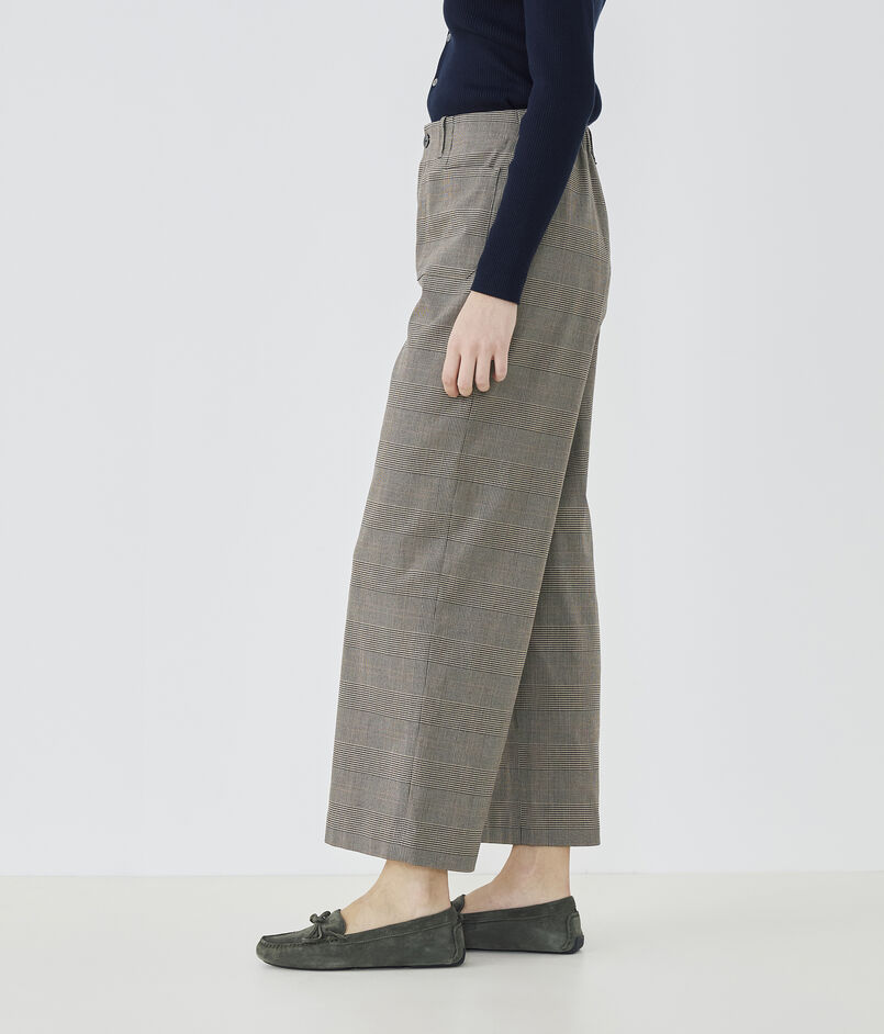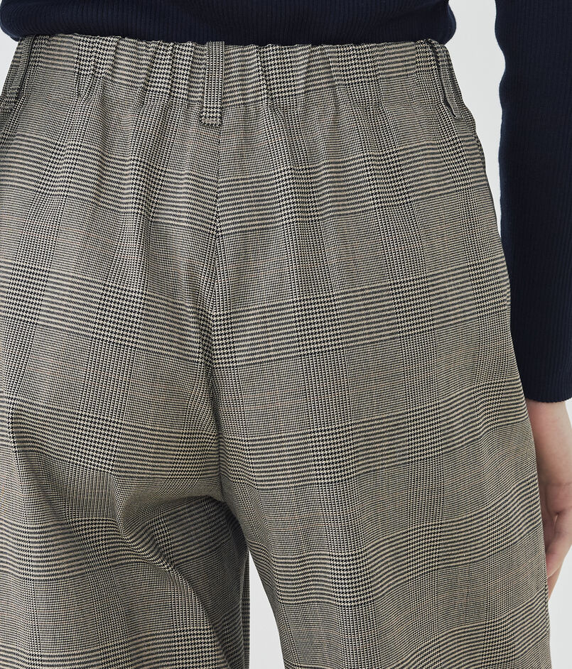 ワイドシルエットとバックウエストのゴム仕様でリラックス感がありつつ、コンパクトなヒップまわりですっきりと着こなせる一着。