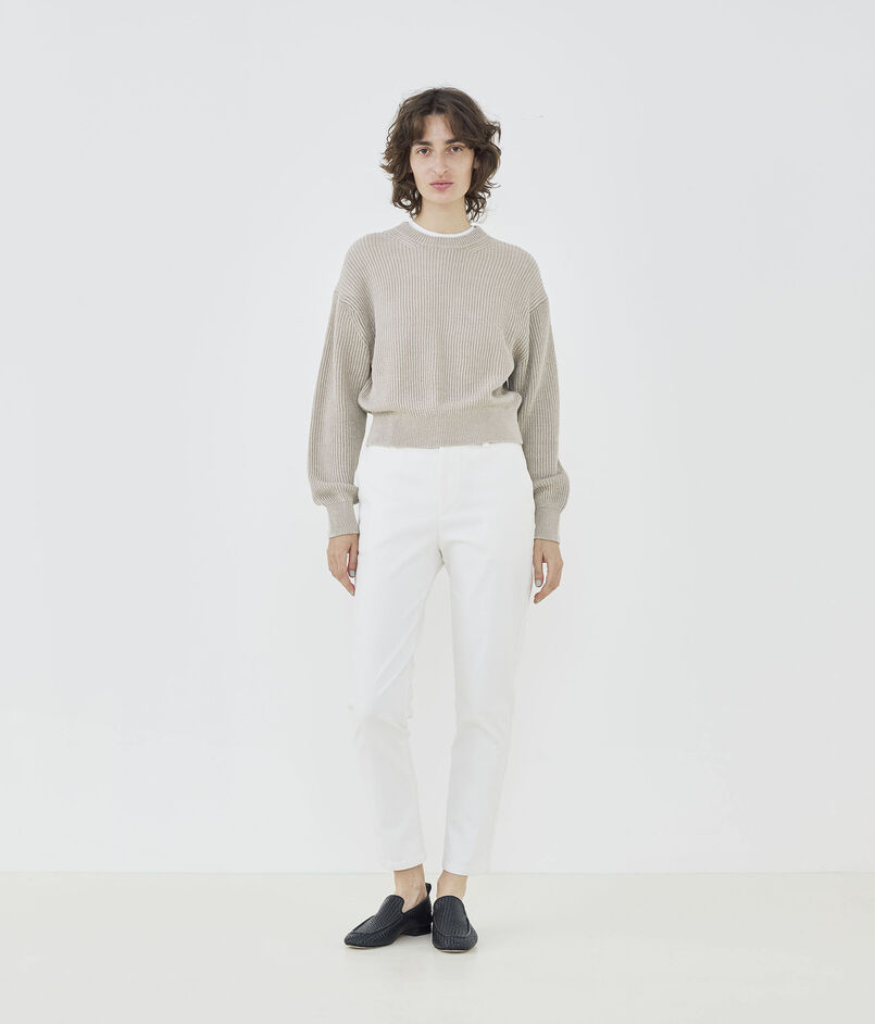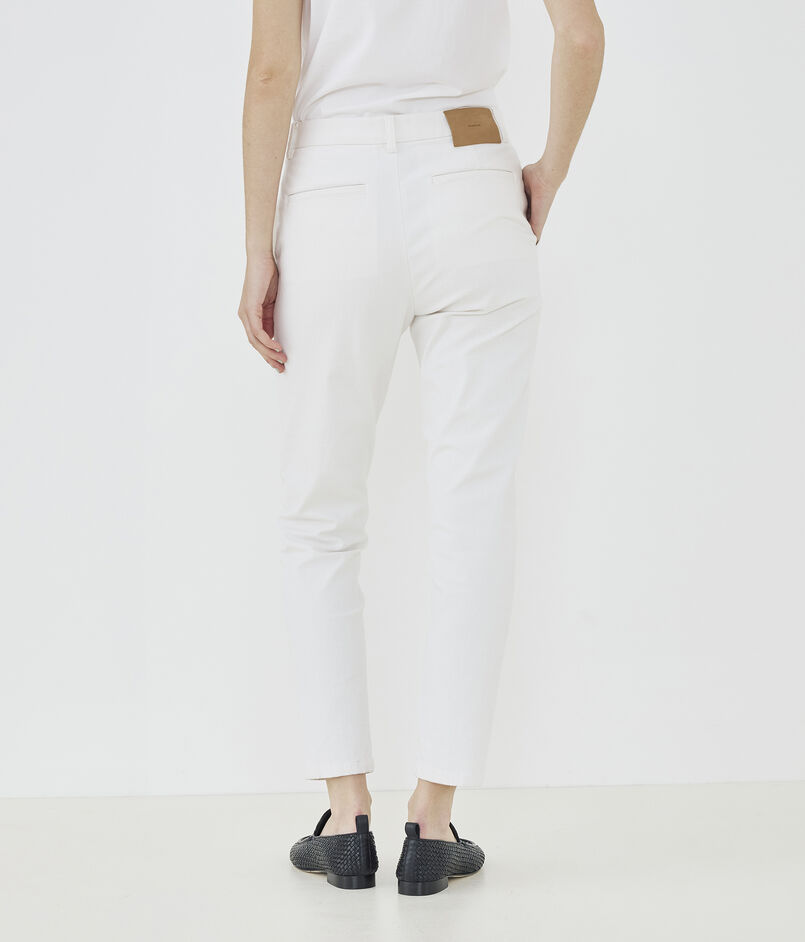股上をやや短くしてウエスト位置を下げ、お腹まわりが目立ちにくいバランスに仕上げました。