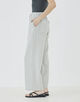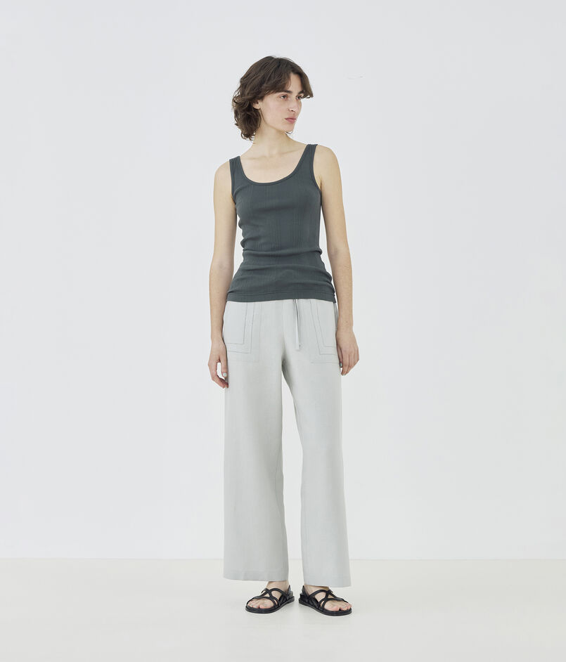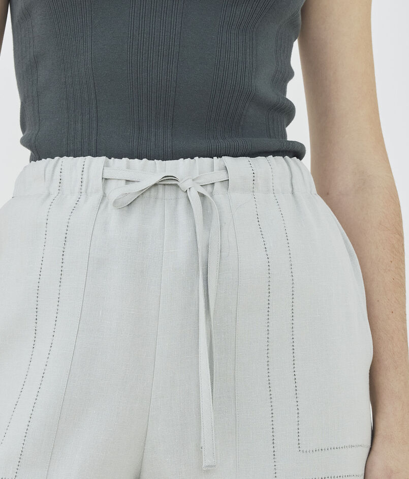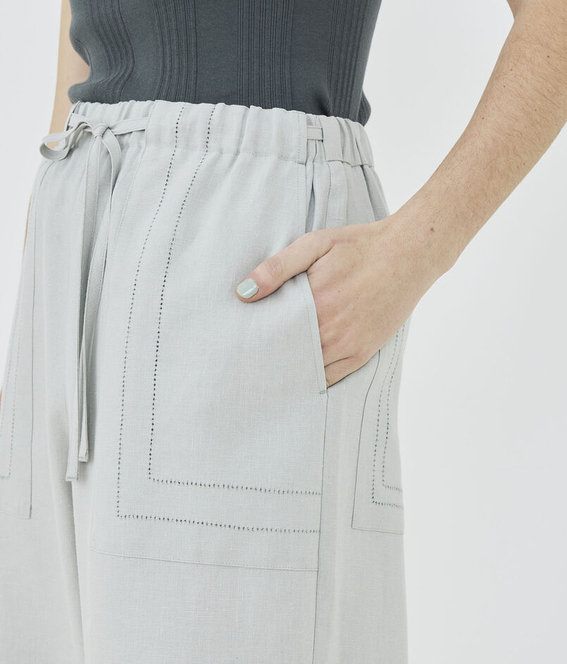 パンツは絶妙な太さのストレートシルエットとドローストリングのデザインでリラックスムード漂う一着。