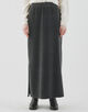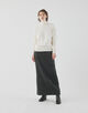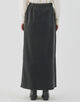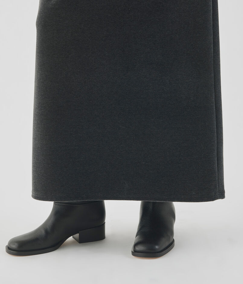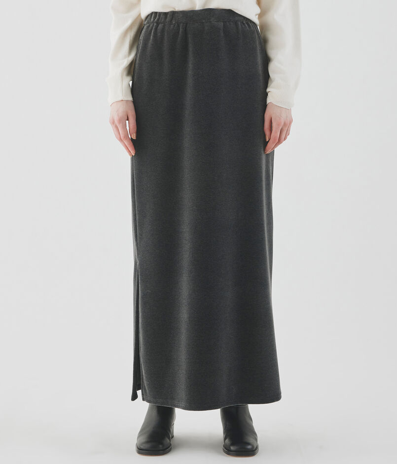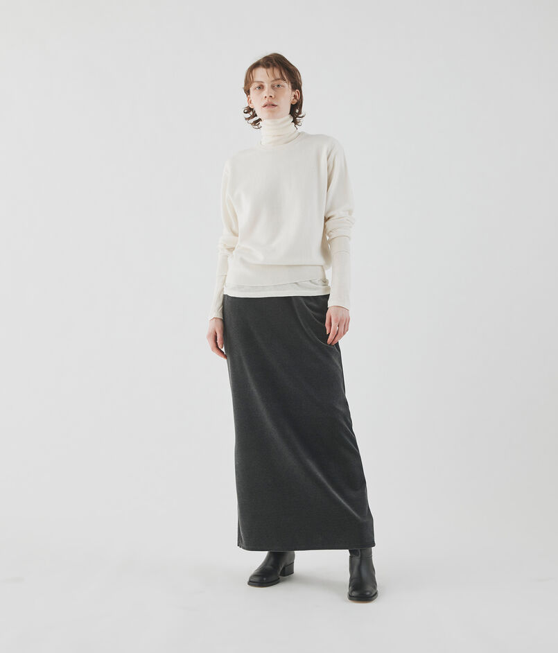 スカートは裾に向かってすとんと落ちるIラインシルエットとマキシ丈でカジュアルな中にも女性らしさを感じる一着。