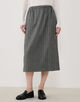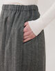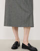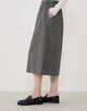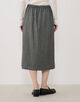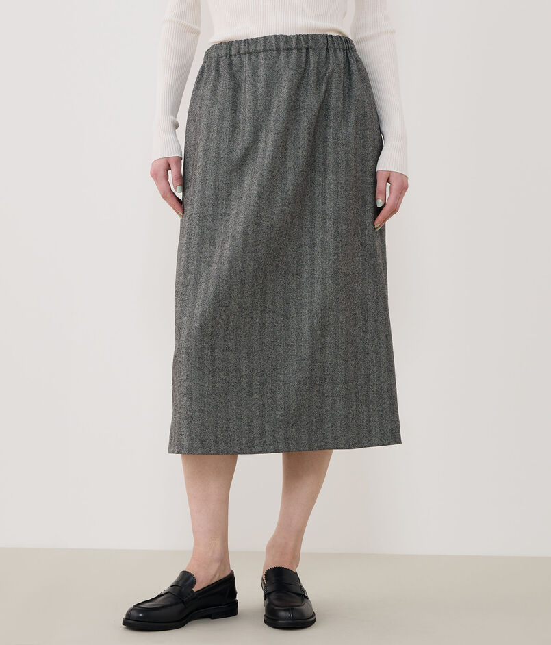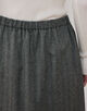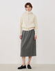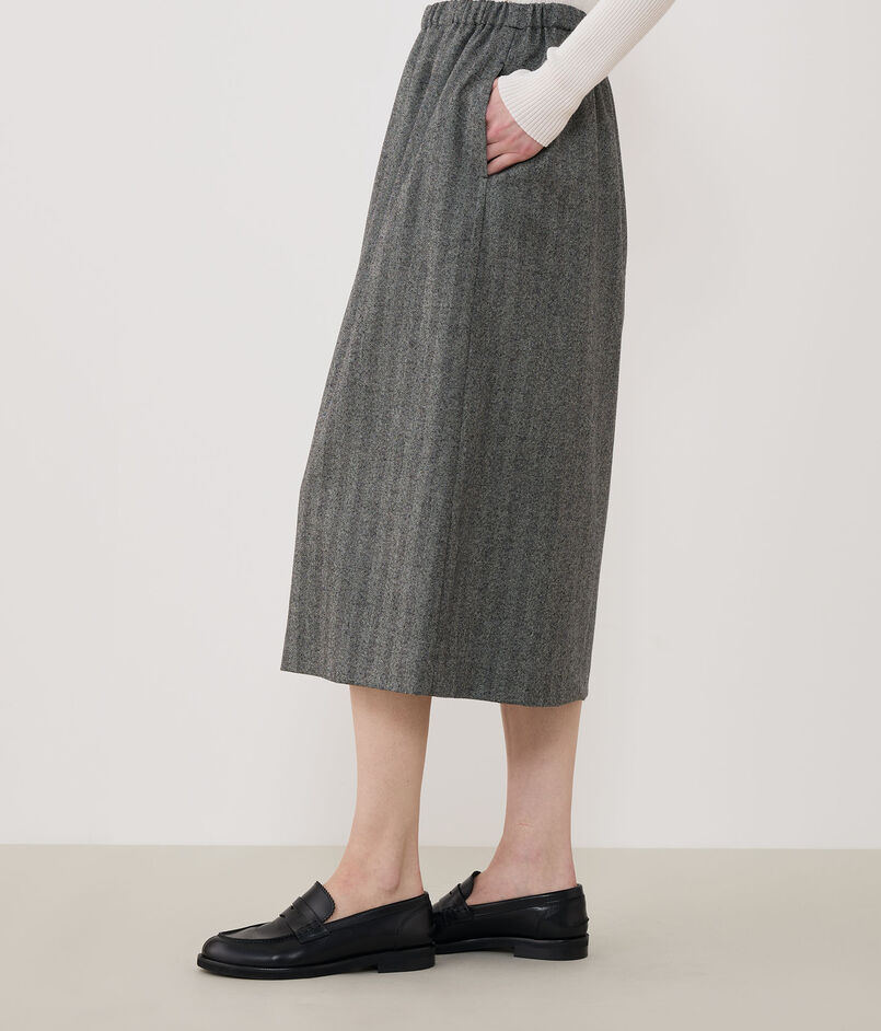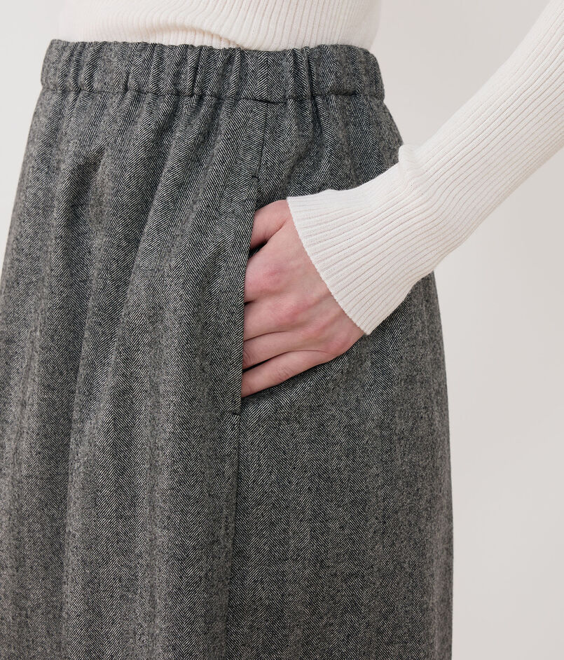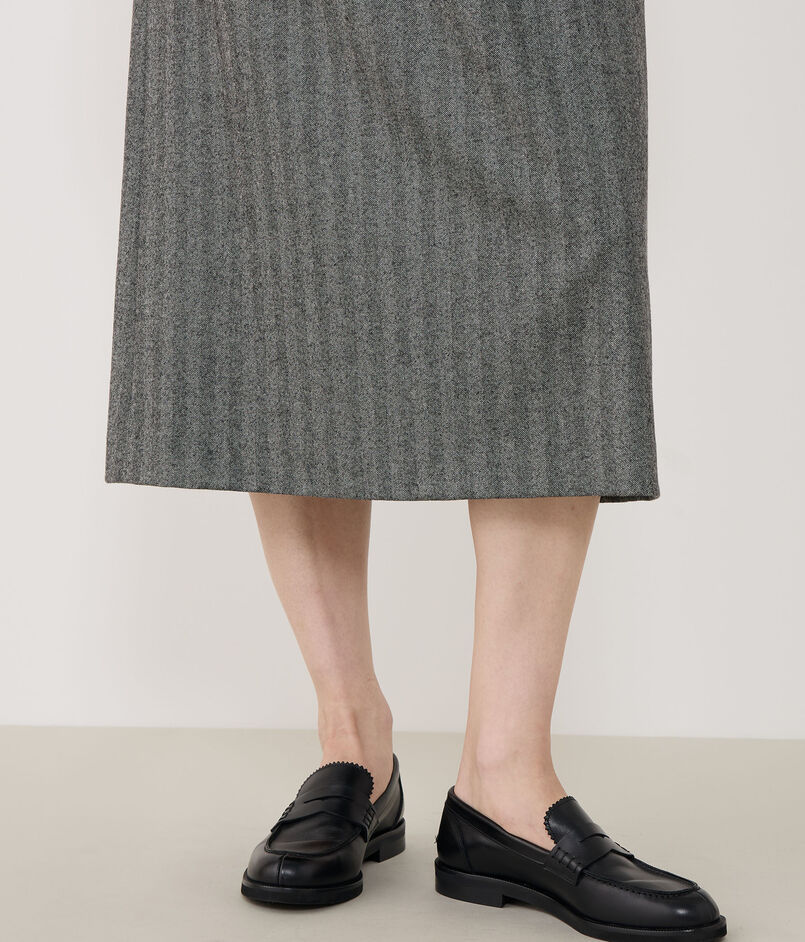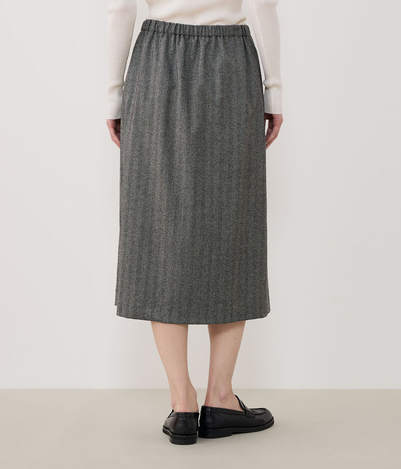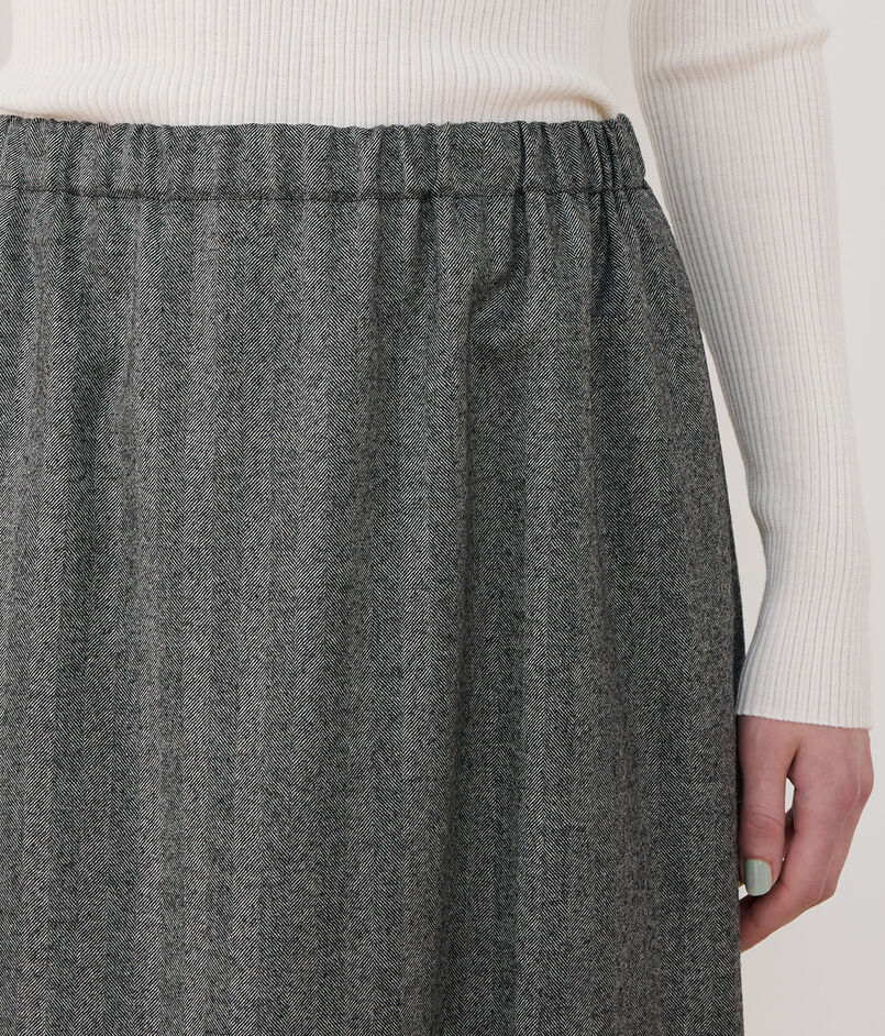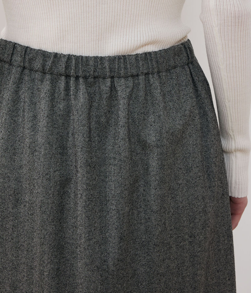 スカートはすっきりとしたAラインシルエットにソフトな揺れを加えた一着。