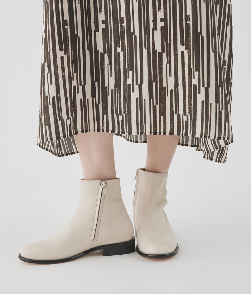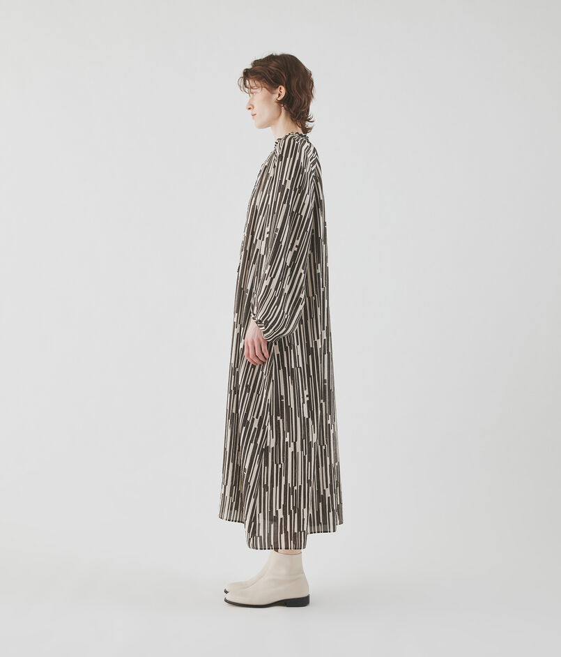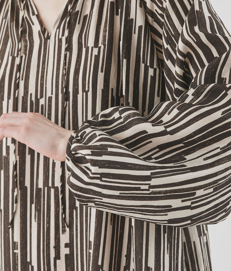 薄手で軽量なシルク羽二重素材にアブストラクトな線で構成された柄をプリントし、生地のコシを柔らかくするタンブラー加工を施したシリーズ。