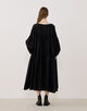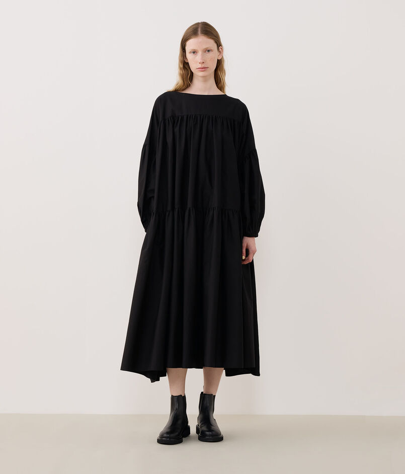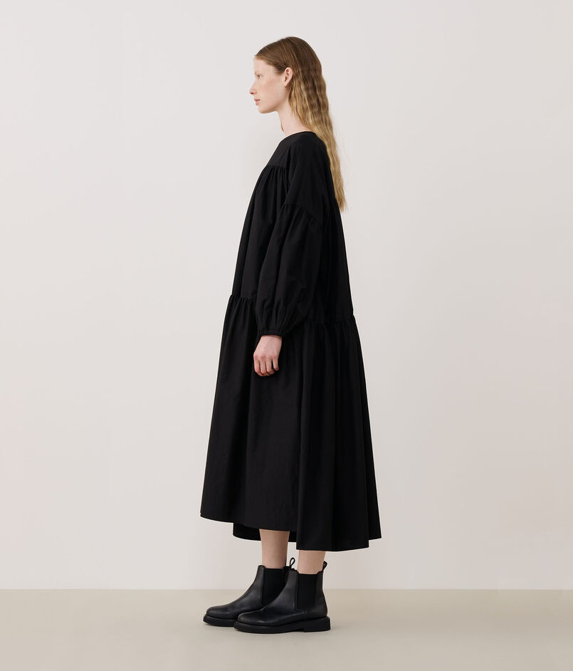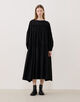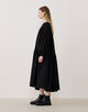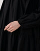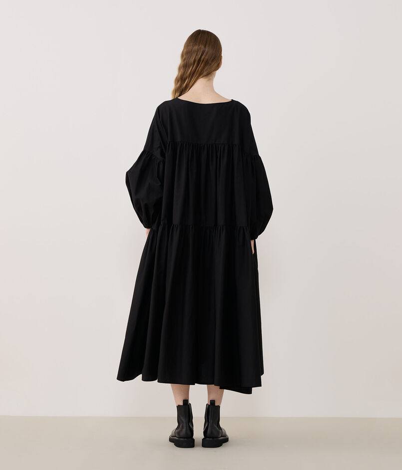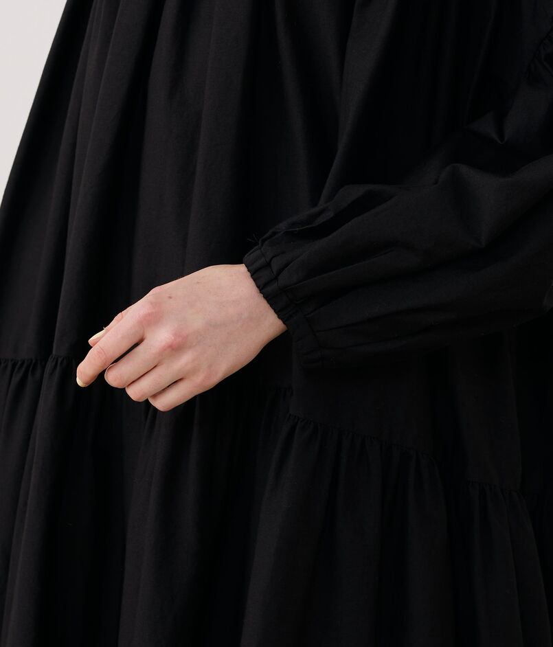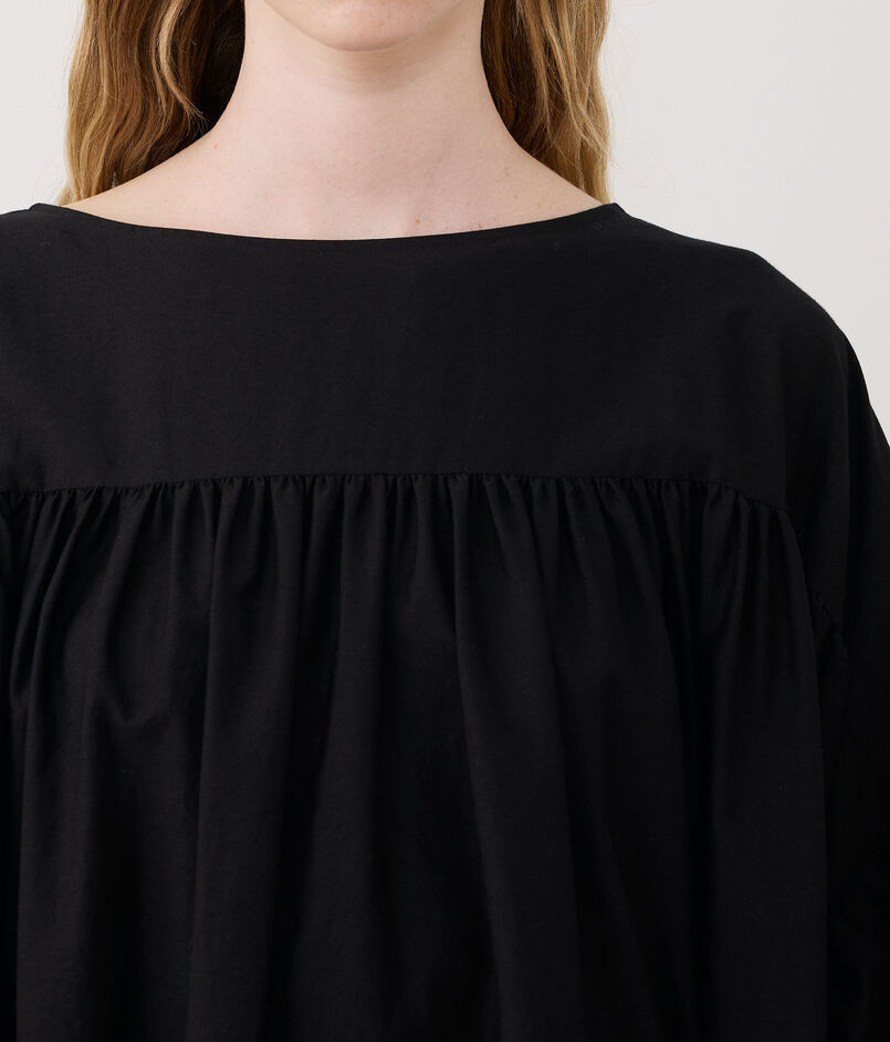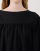 切り替え位置にたっぷりと寄せたギャザーが生み出す立体的なフォルムとすっきりとした襟元のバランスが美しい一着。