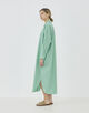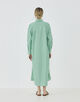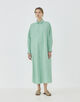 ワンピースは身体のラインを拾わず裾まで自然に落ちるシルエットで、リラックスムードと上品な印象を両立させた一着。