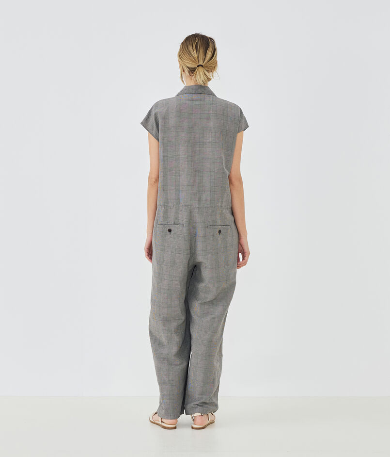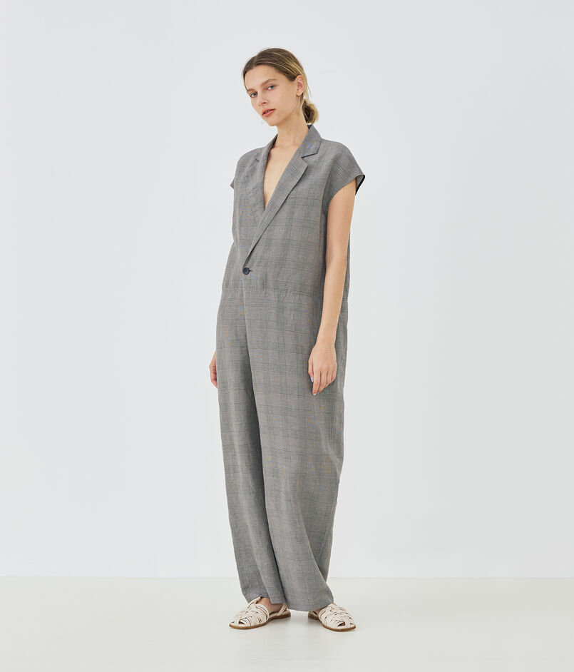 オールインワンはチェスタージャケットのディテールを取り入れつつ、サロペットのリラックス感も併せ持った一着。