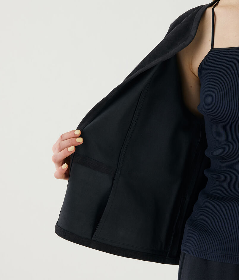 特殊なステッチをハギ目に用いた見え方や共地のパイピングディテールでシックかつ上品なス雰囲気の一着。