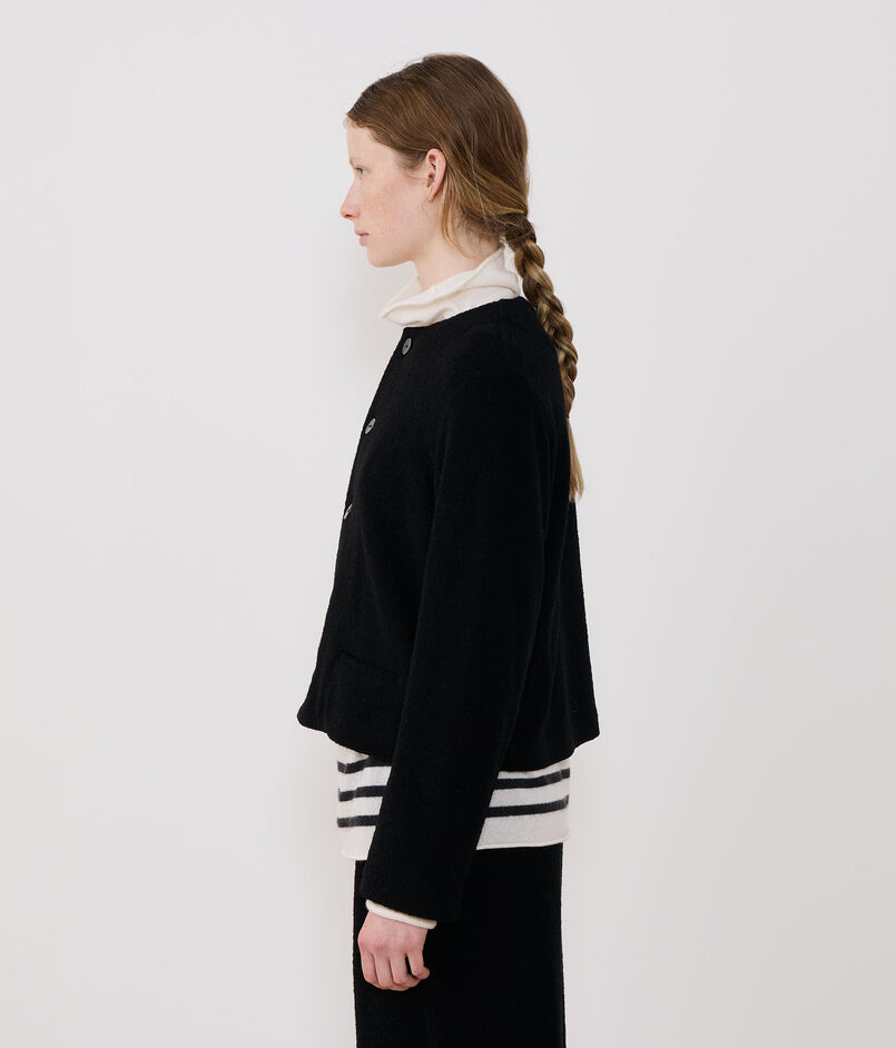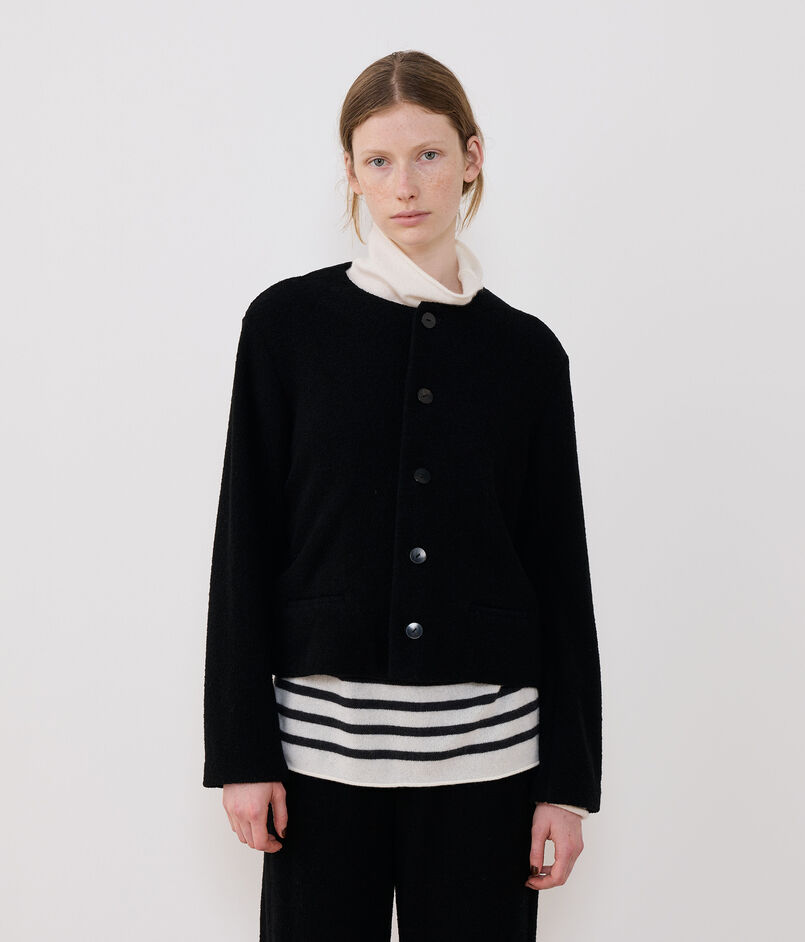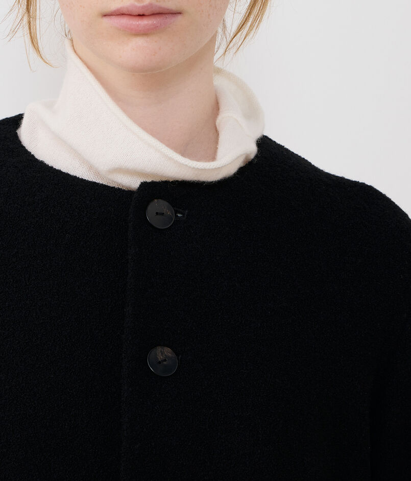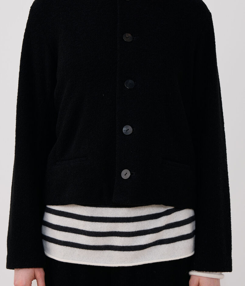 良質なウールをブークレー状にして編み立てた生地に特殊な熱加工を施した、膨らみともっちりとした風合いがありつつ、しなやかさも併せ持った素材感が特徴のファインブークレーシリーズ。