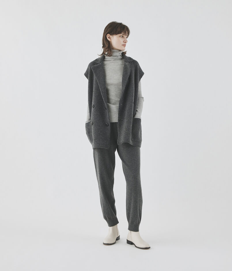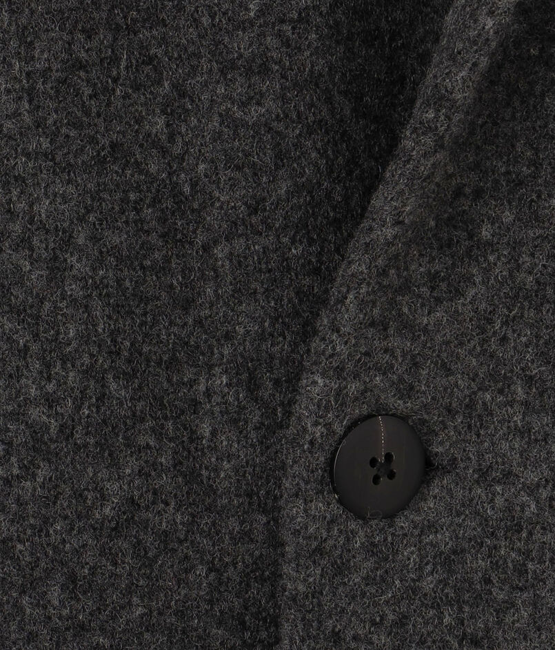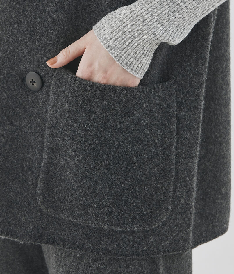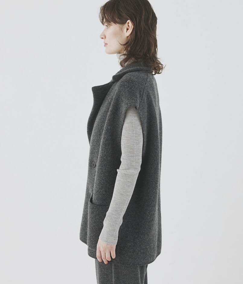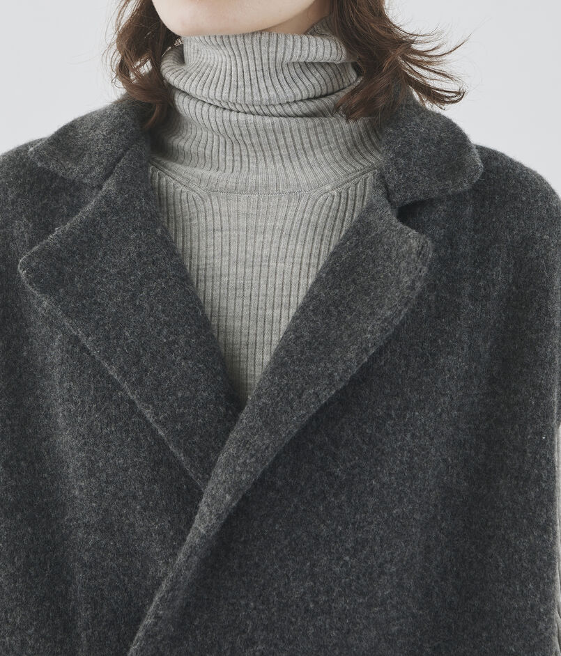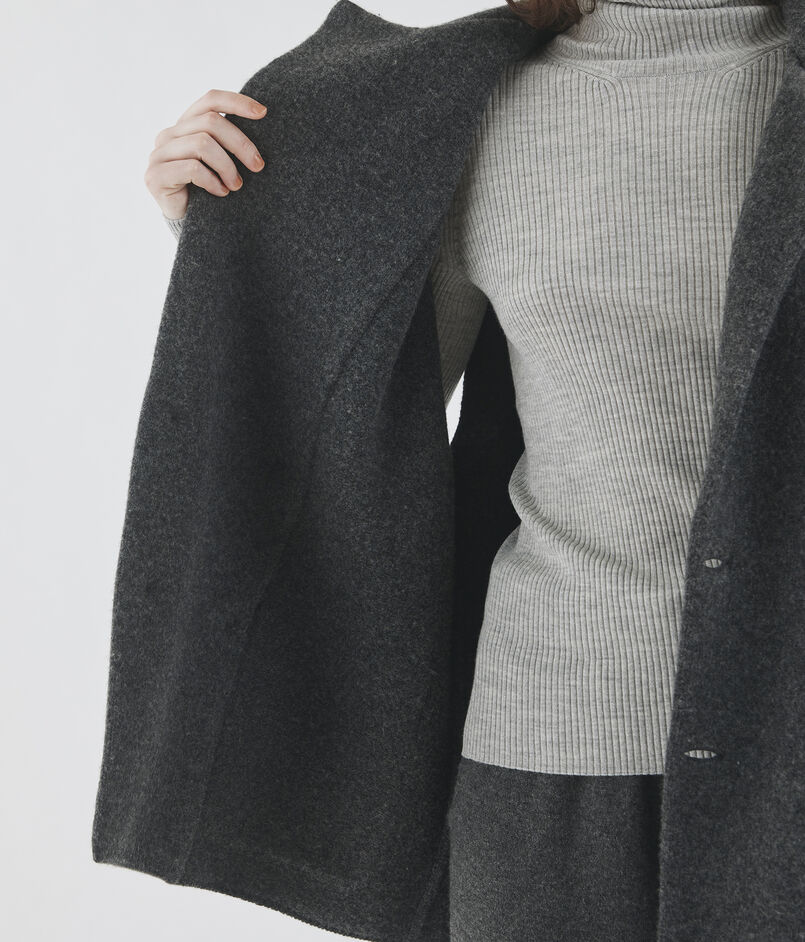 やや強めの縮絨をかけてふわっとした軽く仕上げつつ、毛羽が絡みついているため布帛のような密度の高い生地になっているので風も通さず暖かな着心地を実現しています。