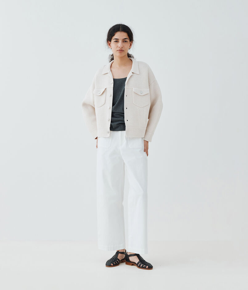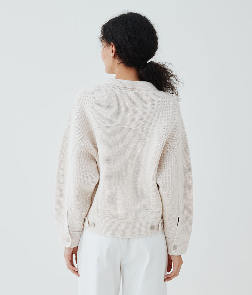 良質なコットンとリサイクルポリエステルの紡績糸を使用し、コースゲージで編み上げたミラノリブ素材のブルゾン。