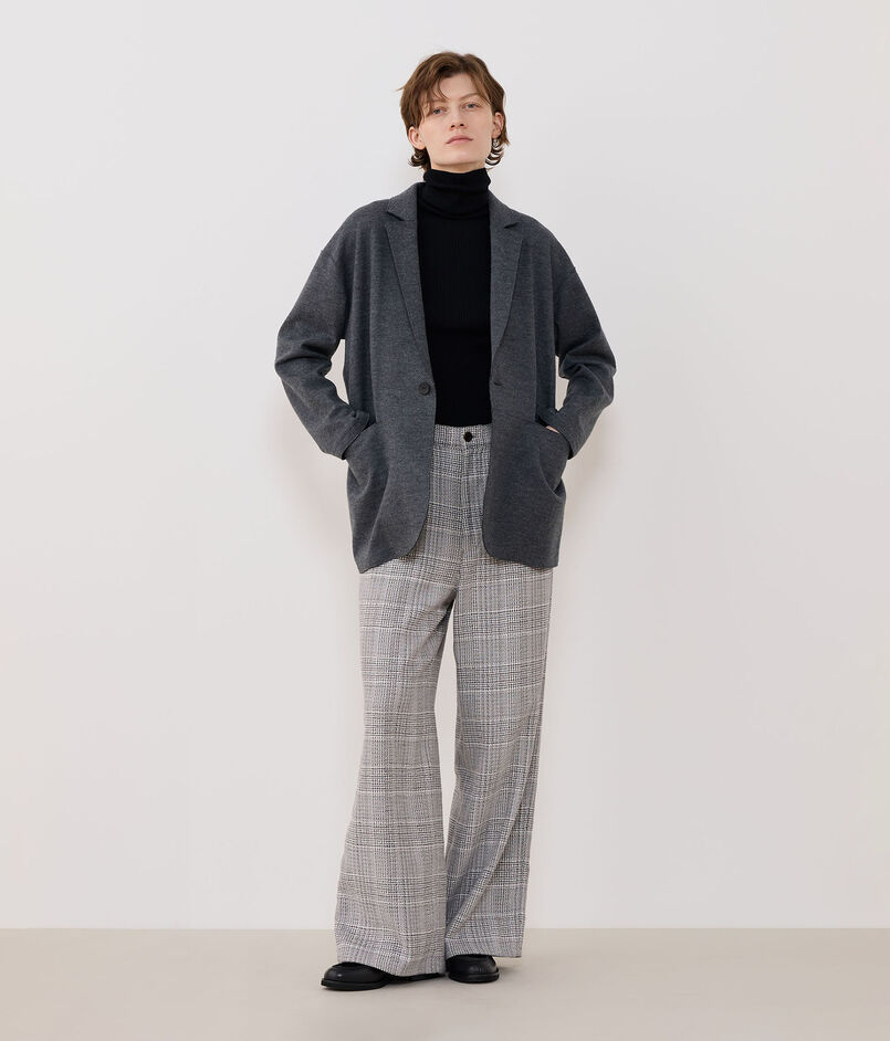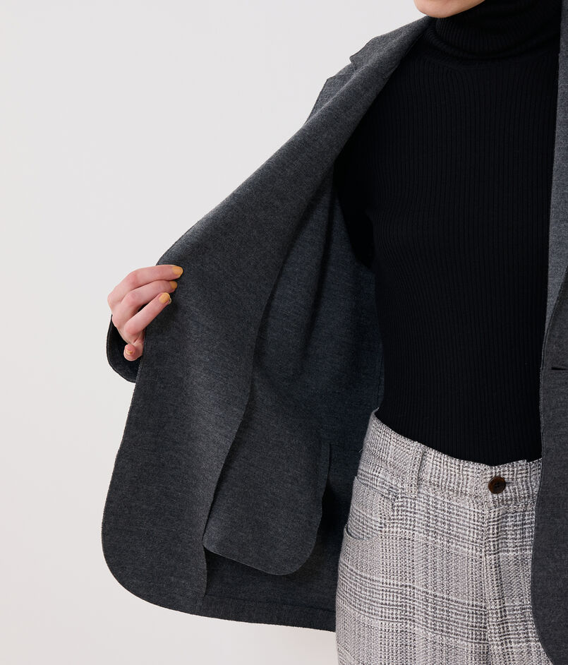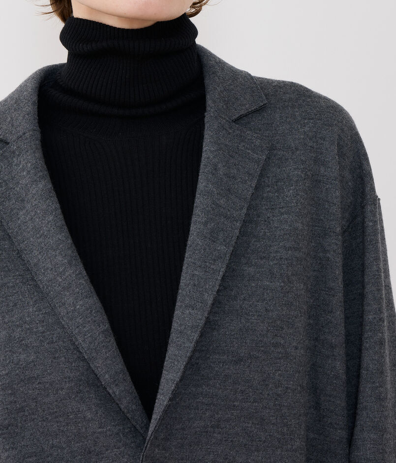 袖を通すとドロップショルダーがやわらかく肩のラインに沿い、スタイリングもソフトな印象に。